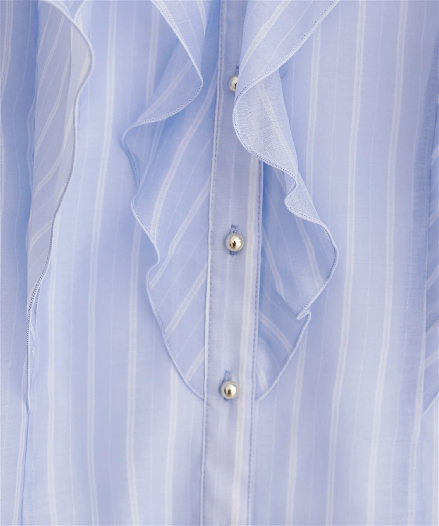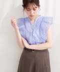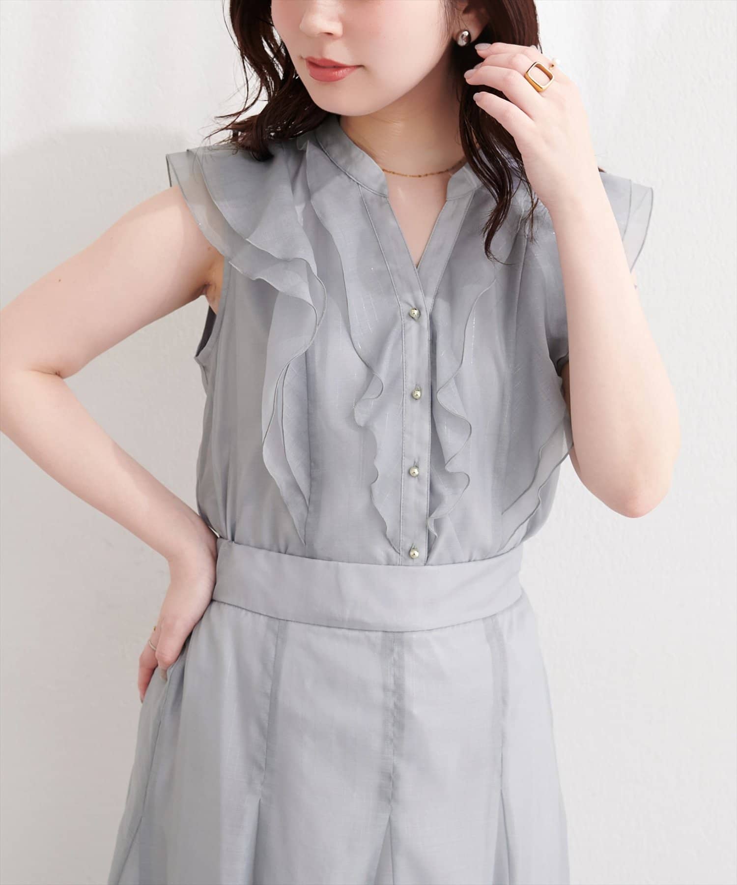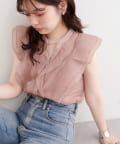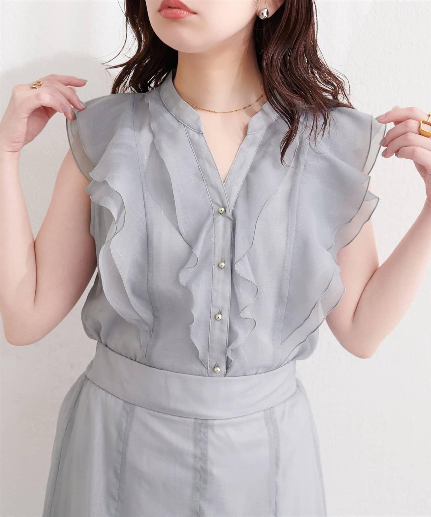 首元から胸元にかけてあしらわれたラッフルは、顔周りを明るく華やかに見せてくれます。