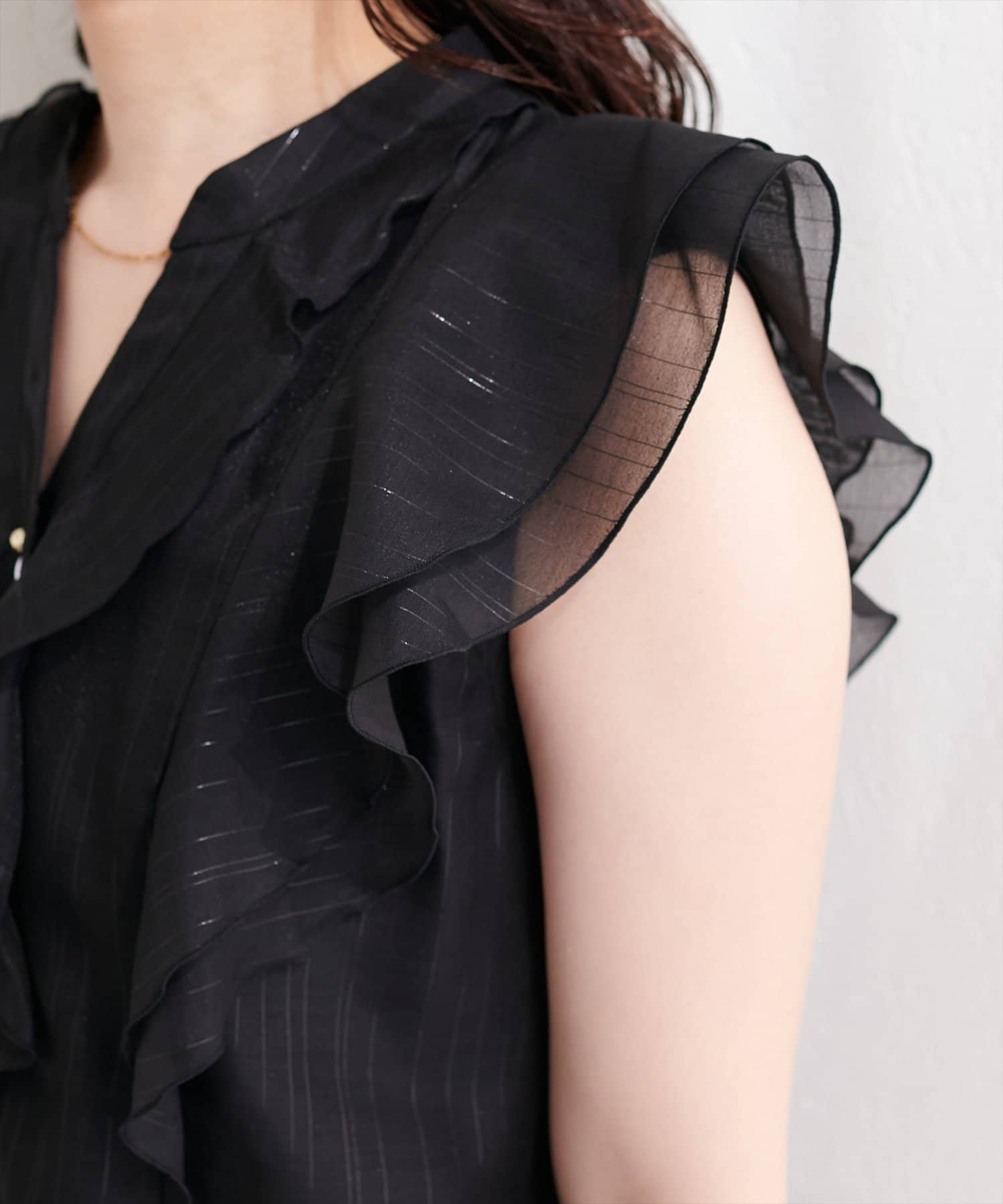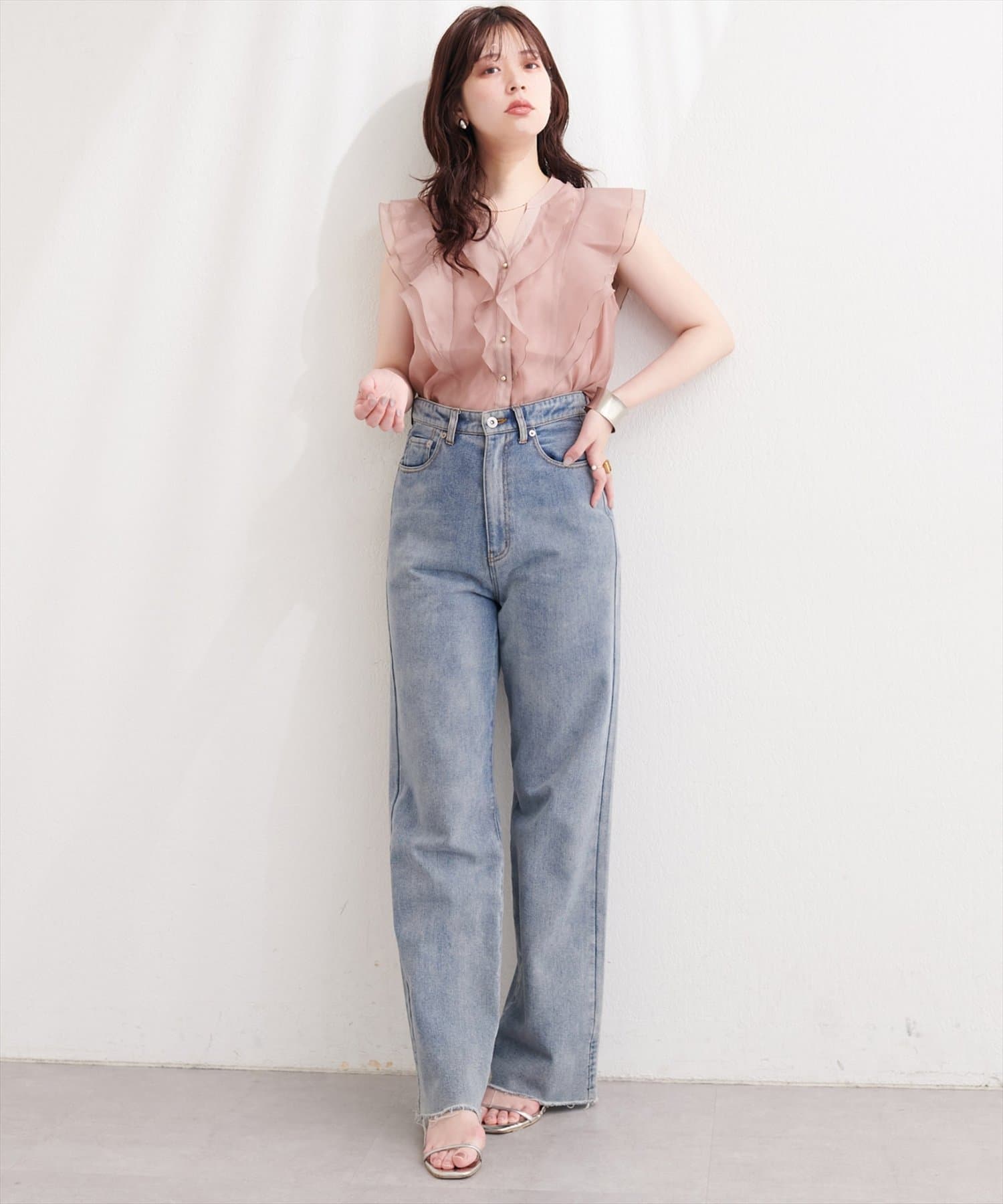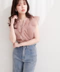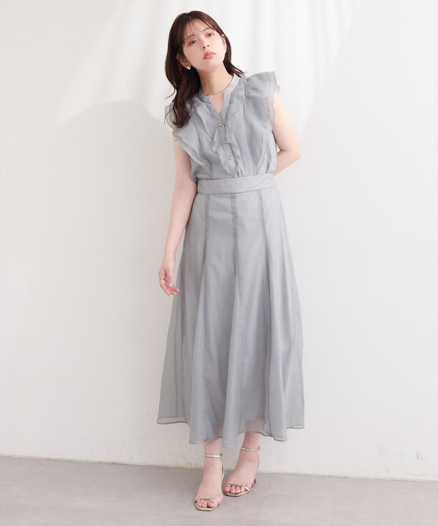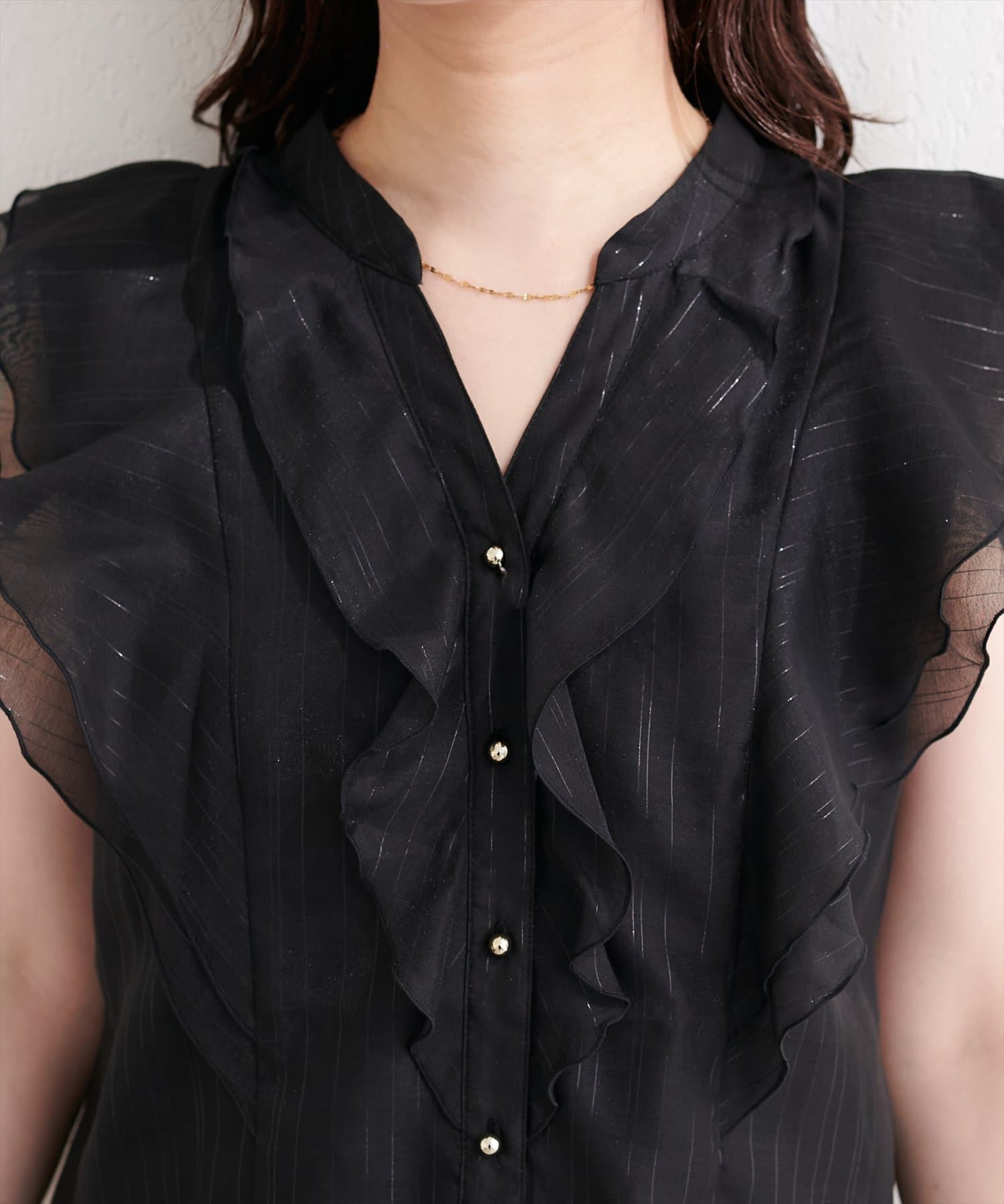 首元から胸元にかけてあしらわれたラッフルは、顔周りを明るく華やかに見せてくれます。