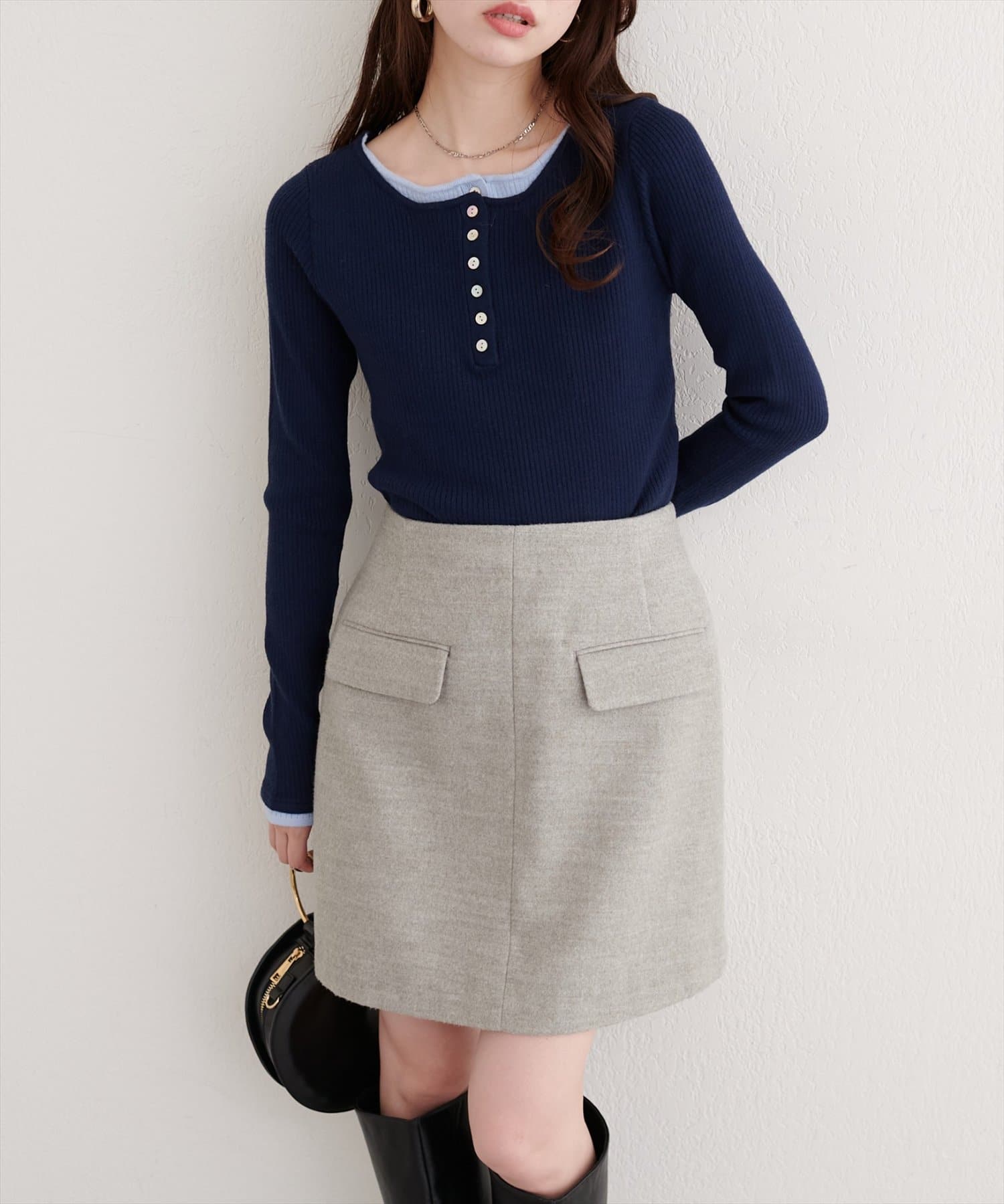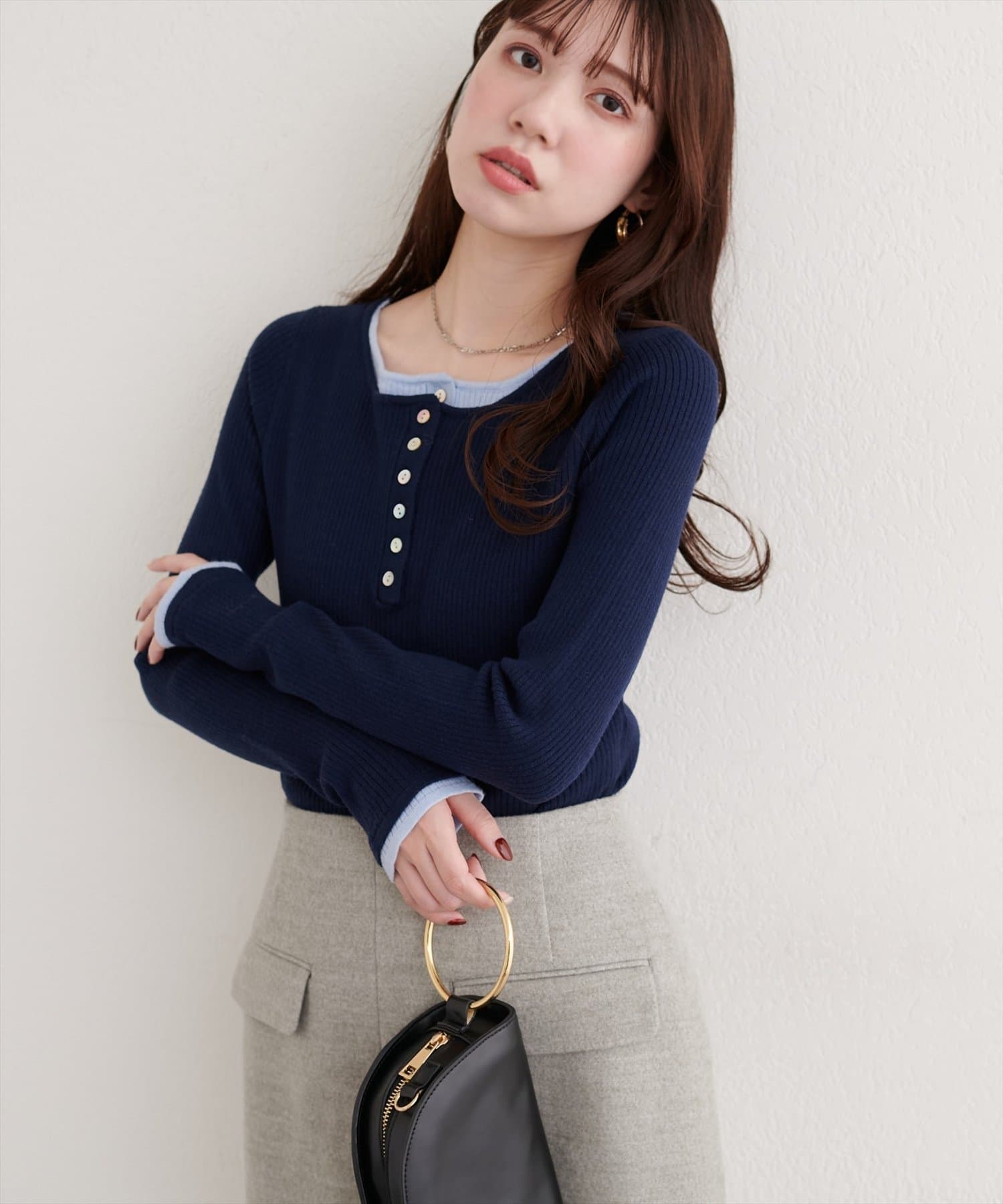 ネックラインのレイヤードデザインが、顔周りをすっきりと見せてくれるのがポイント。