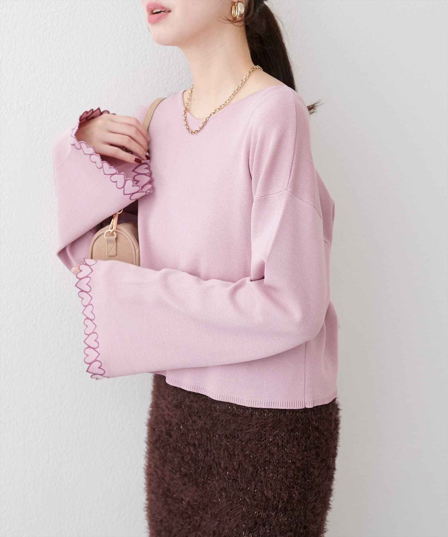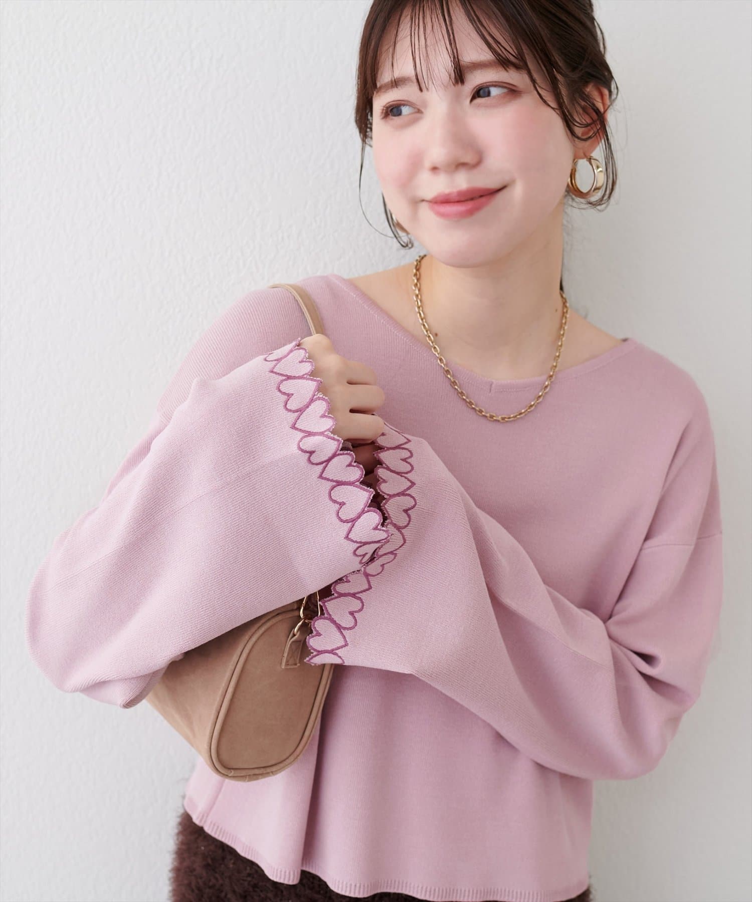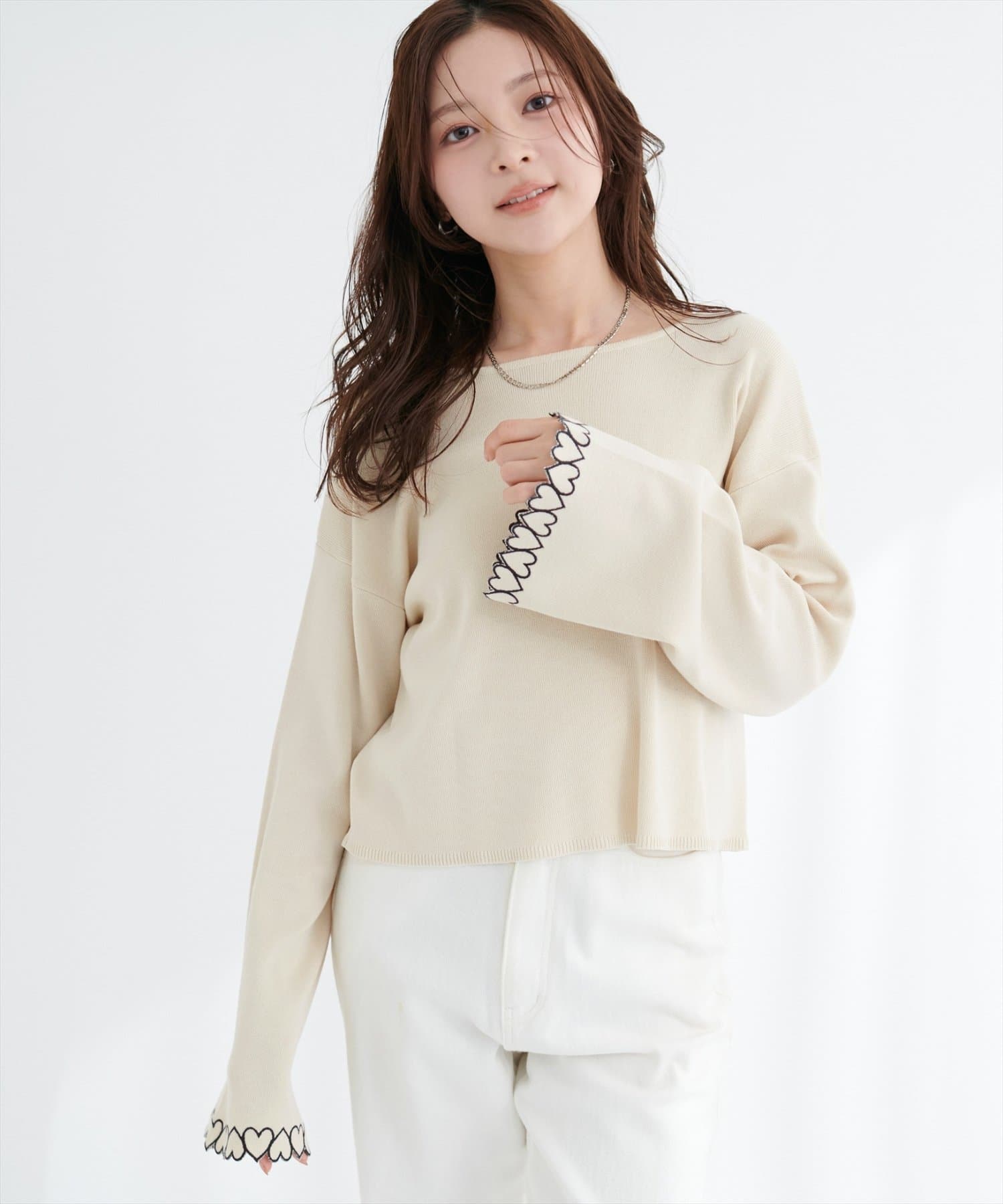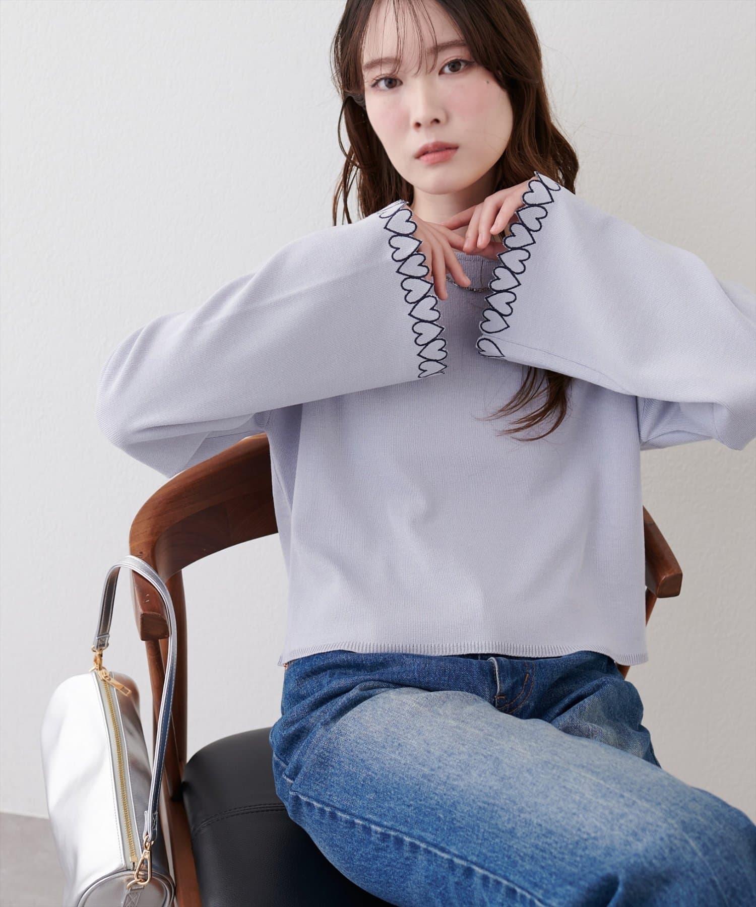 交互にハートが連なった袖口がかわいいニットプルオーバー。