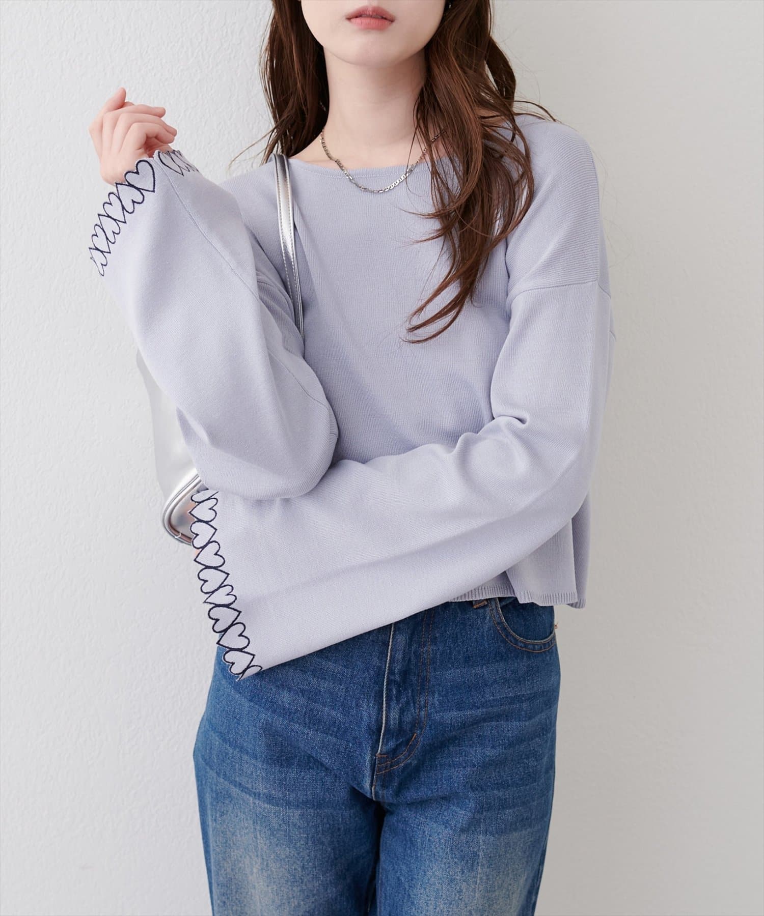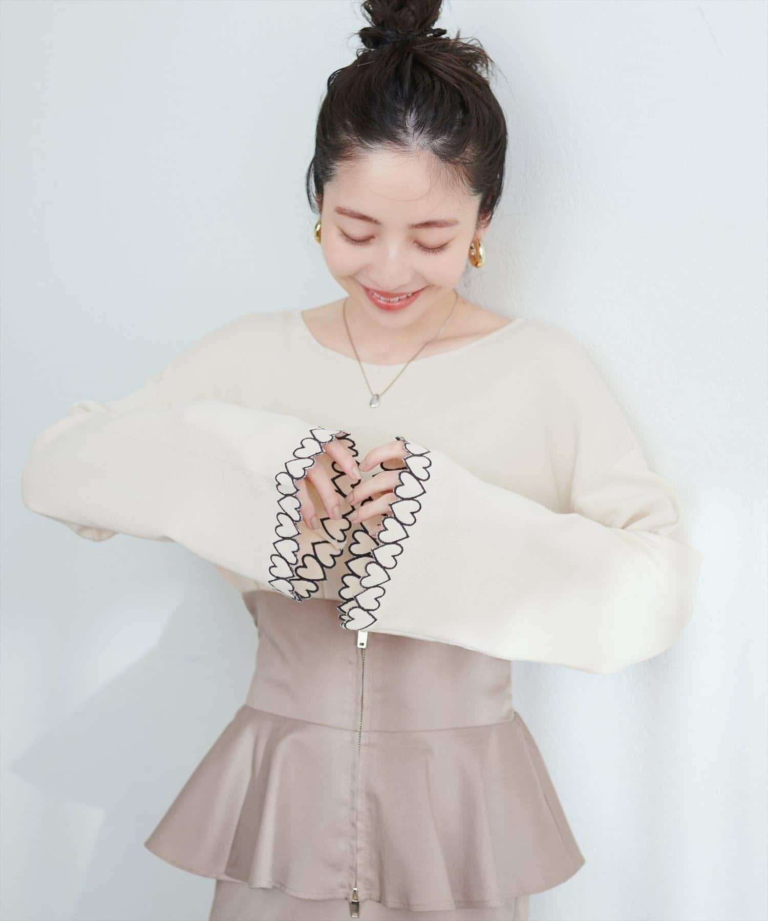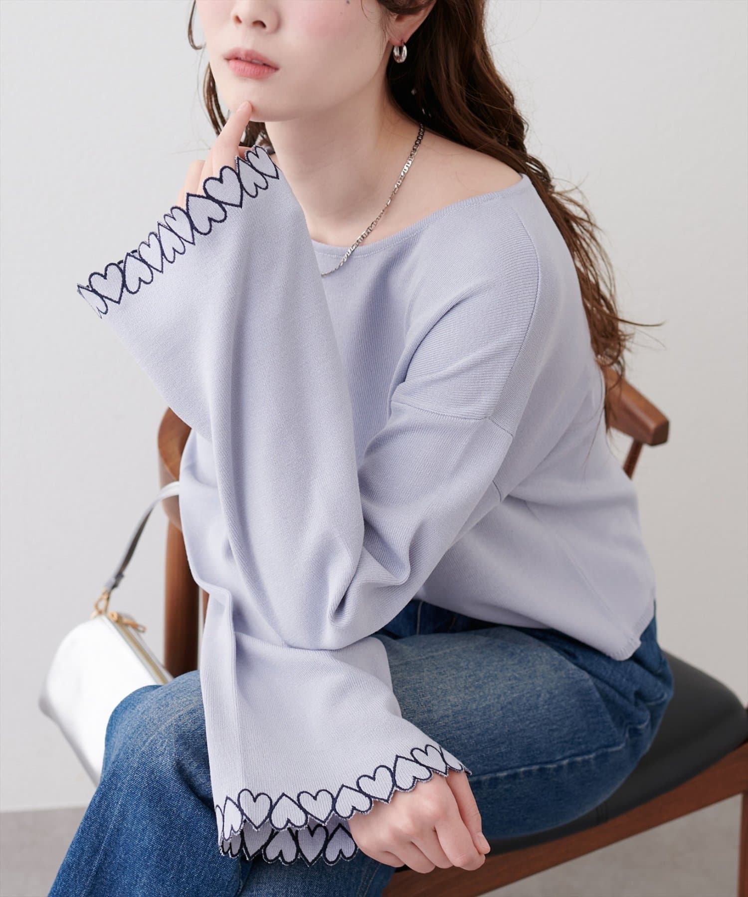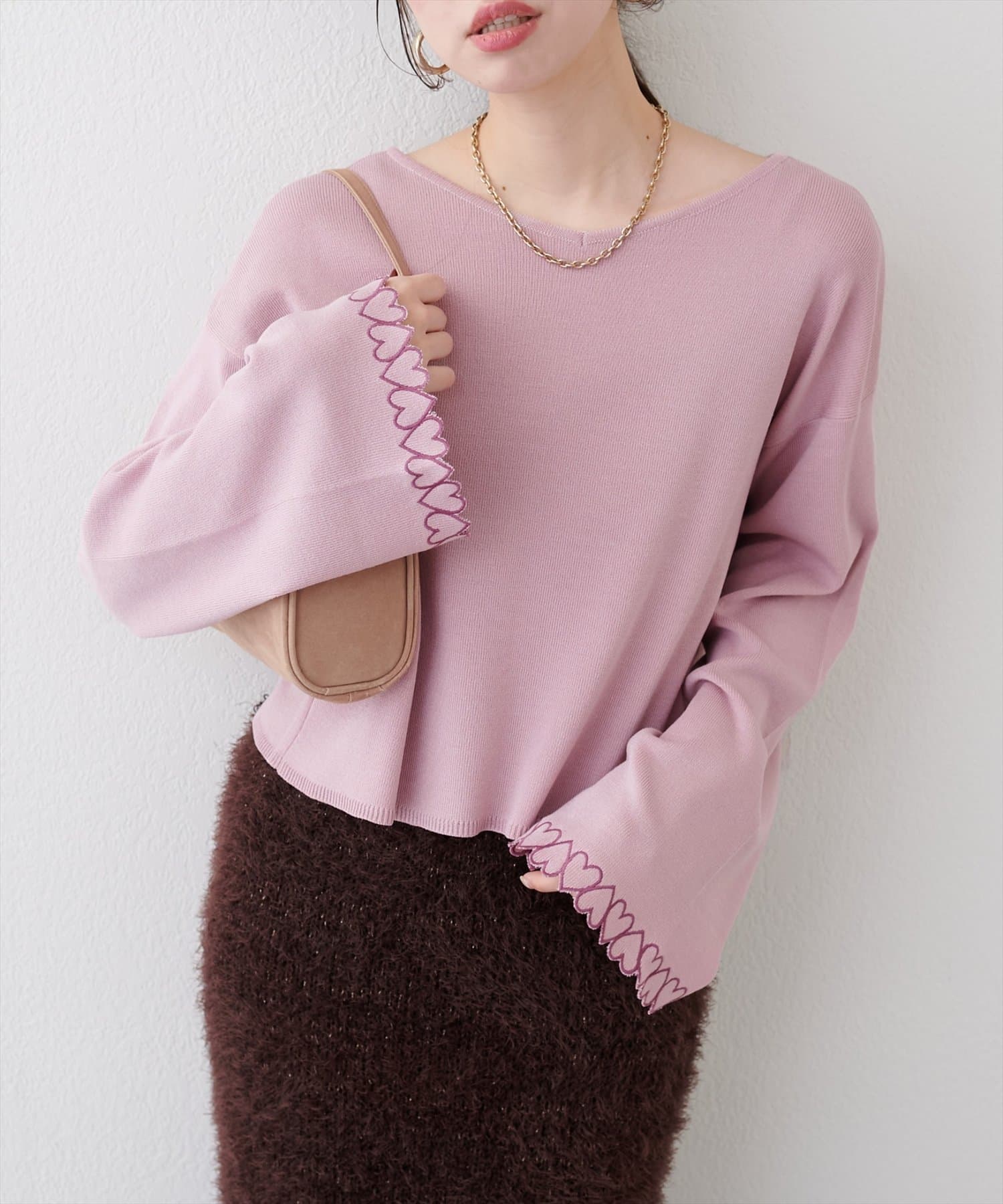交互にハートが連なった袖口がかわいいニットプルオーバー。