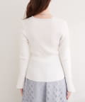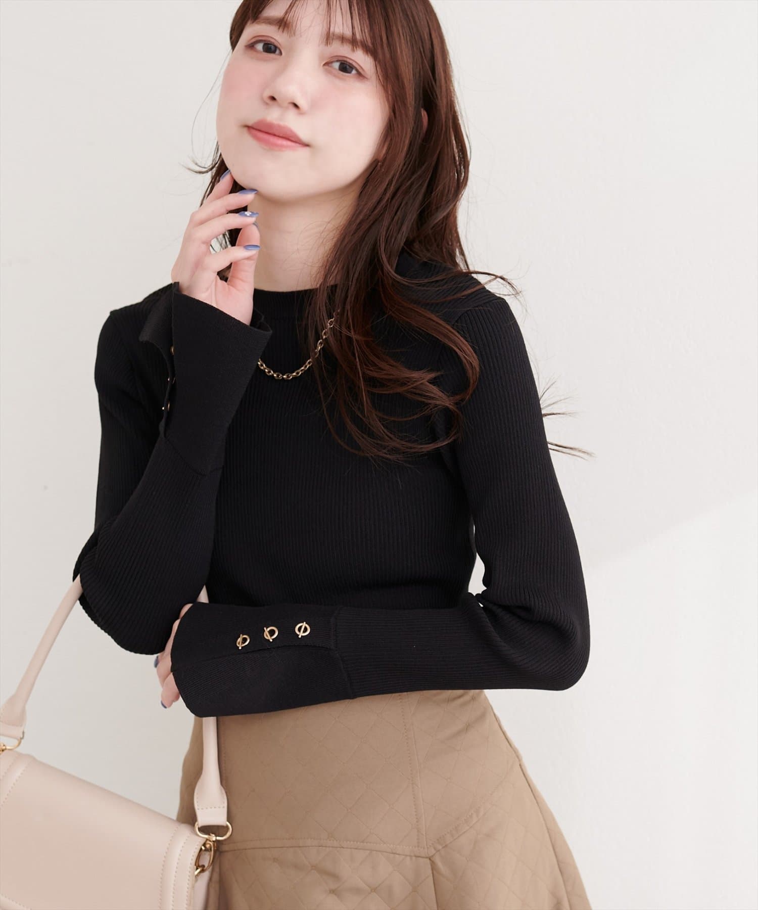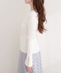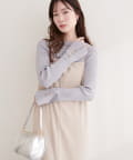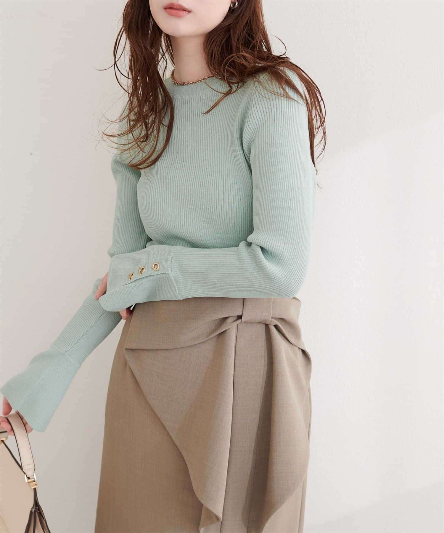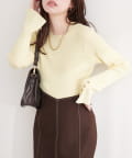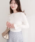 シンプルなニットに、さりげない個性をプラスしています。