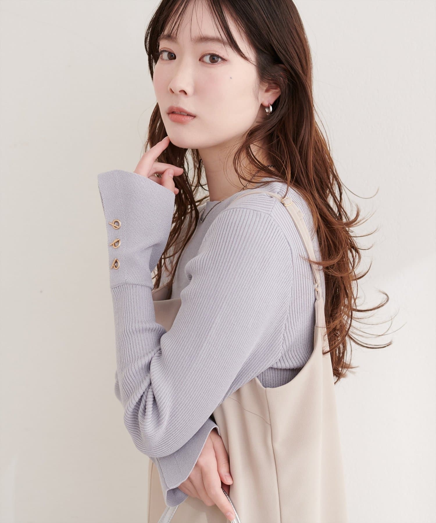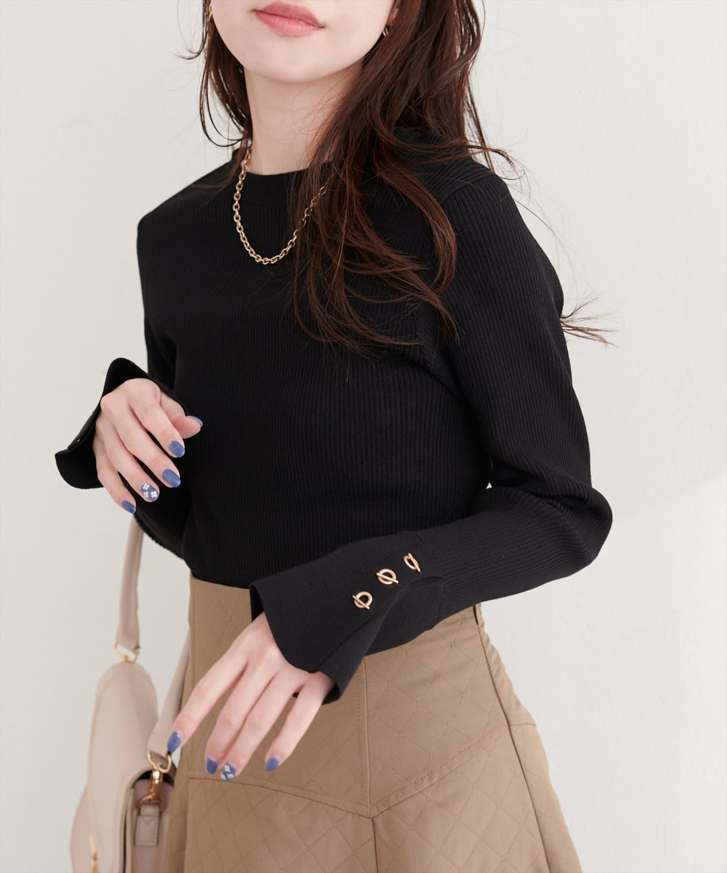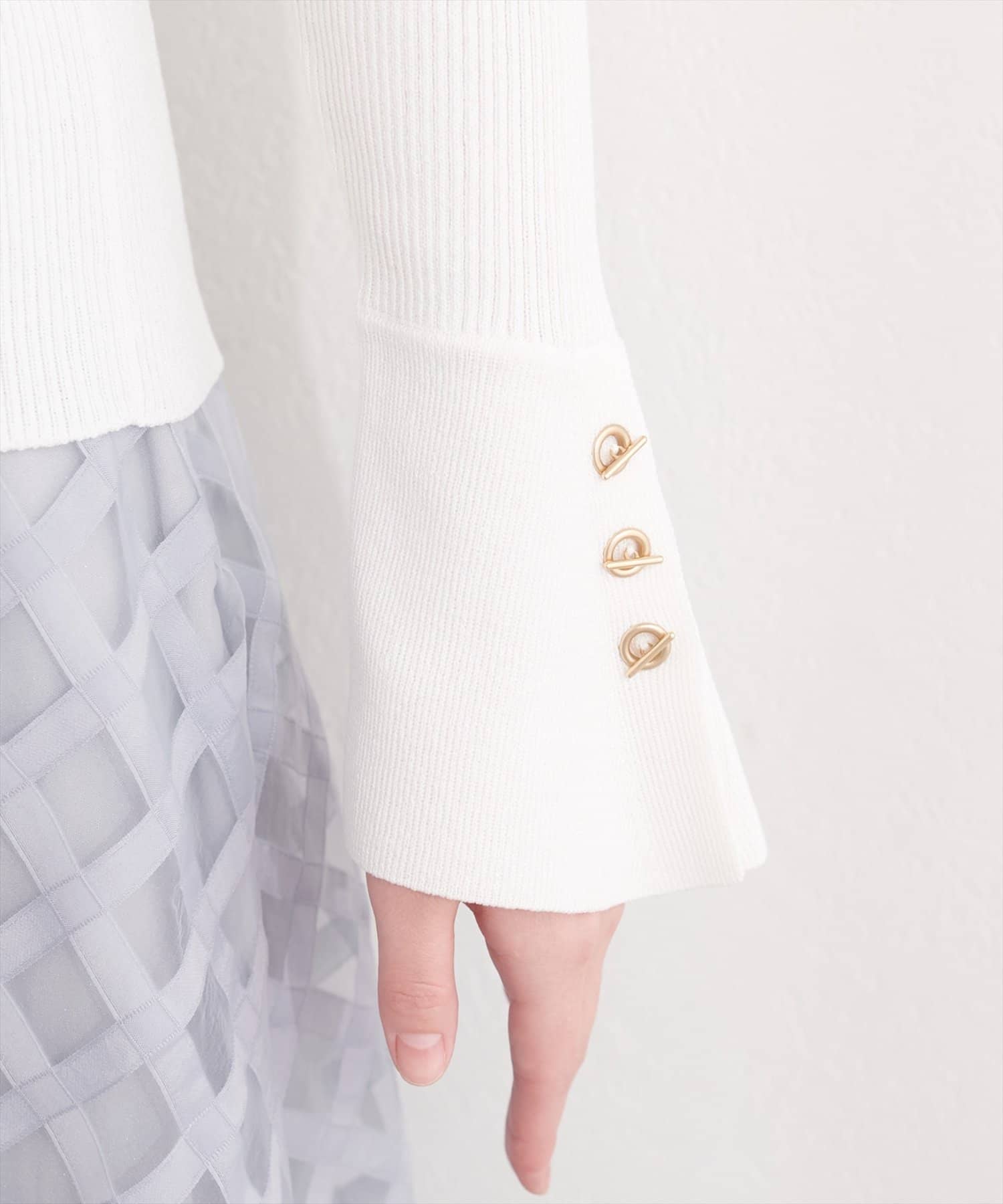 袖口には、上品な輝きを放つハトメ釦をあしらい、手元を華やかに演出。