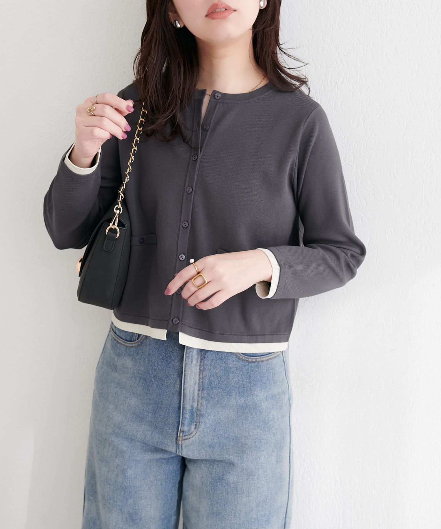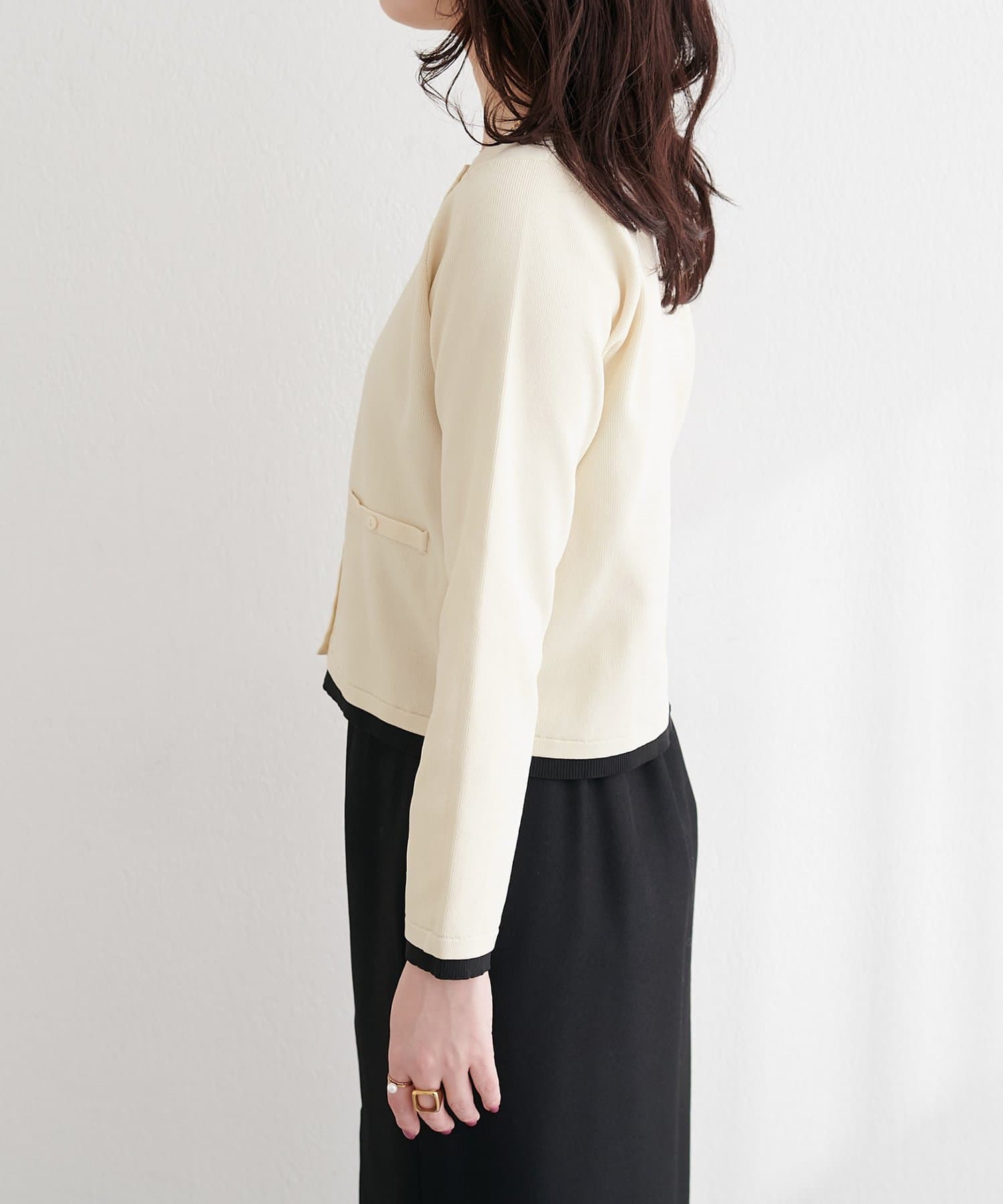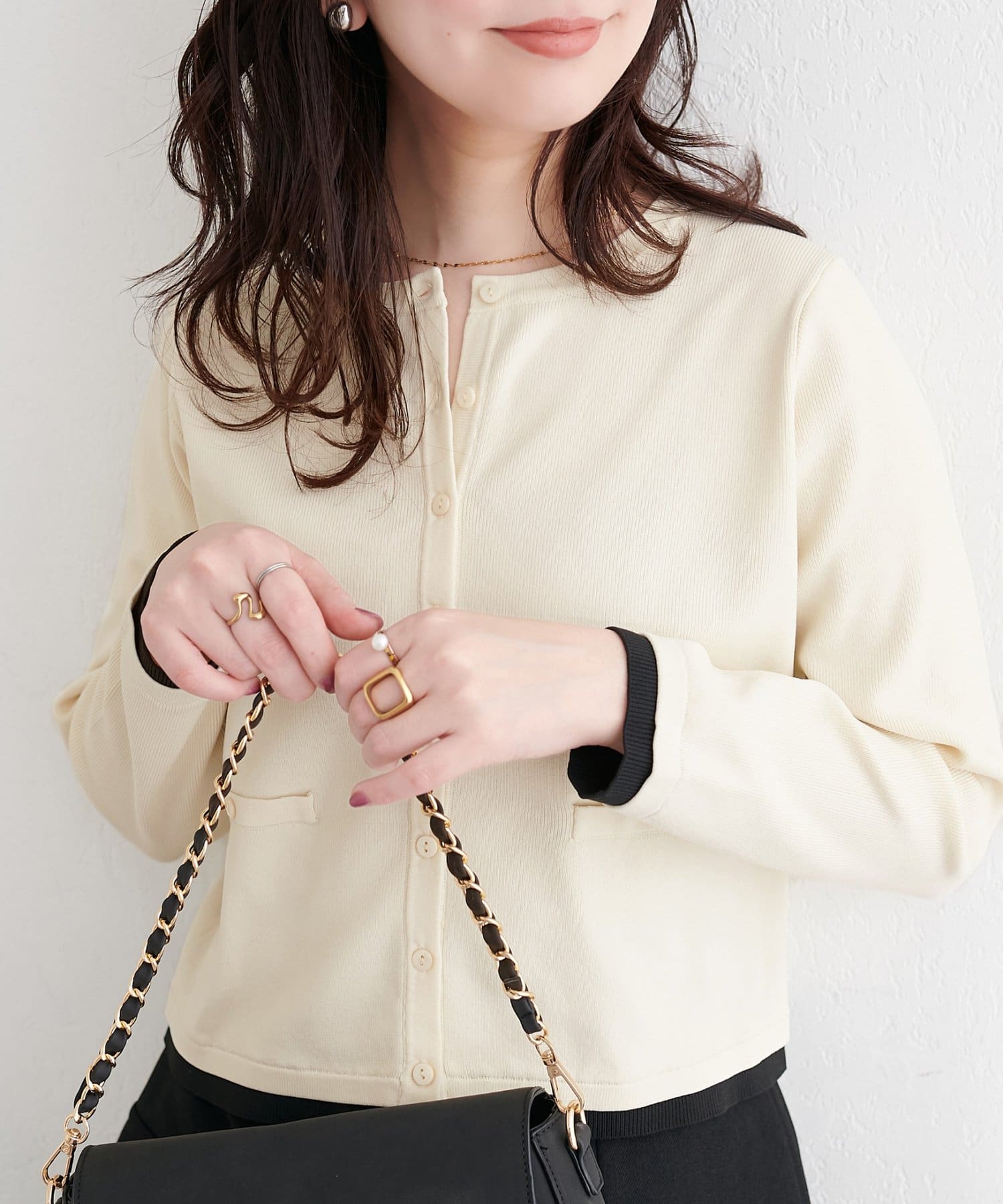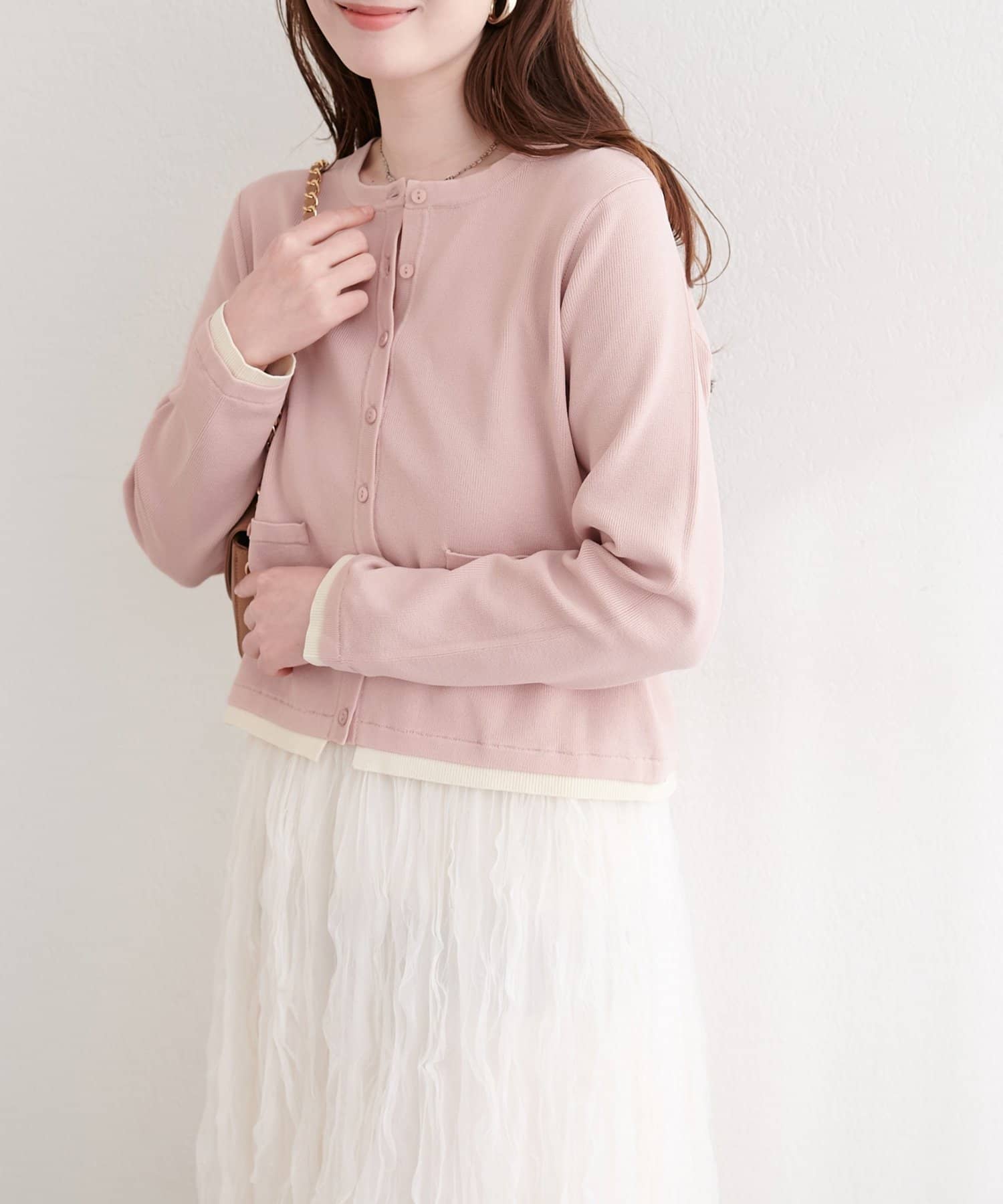 ブラウスやカットソーに羽織れば、きちんと感のあるスタイリングに。