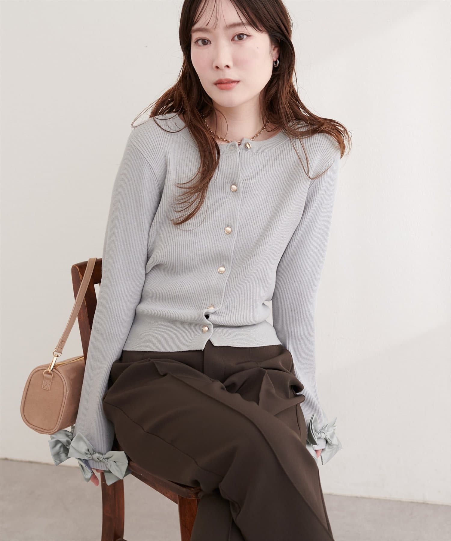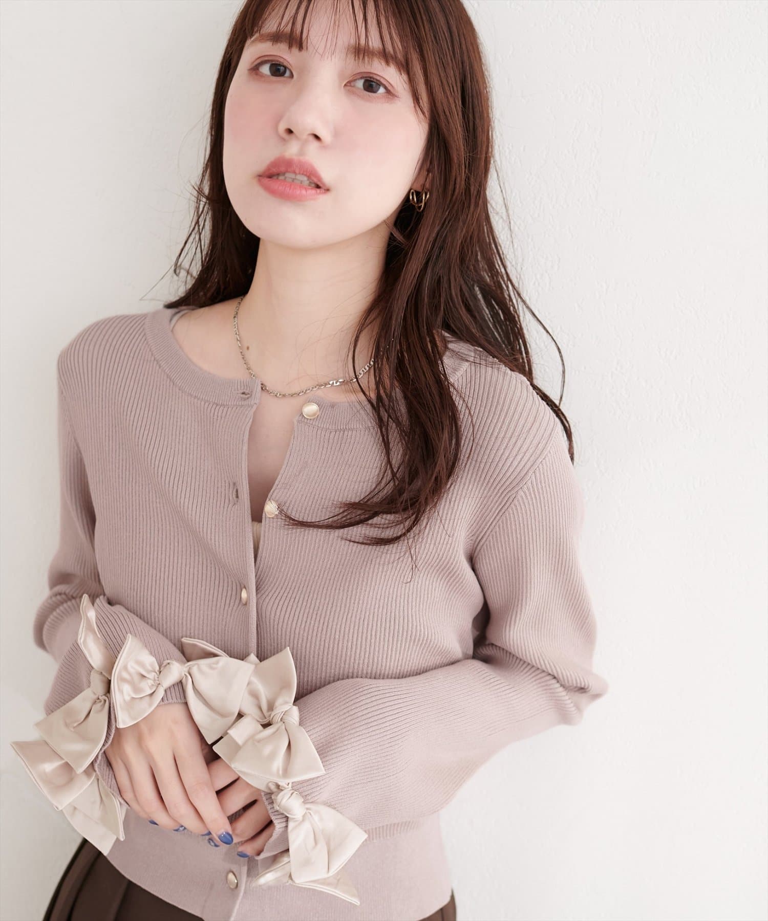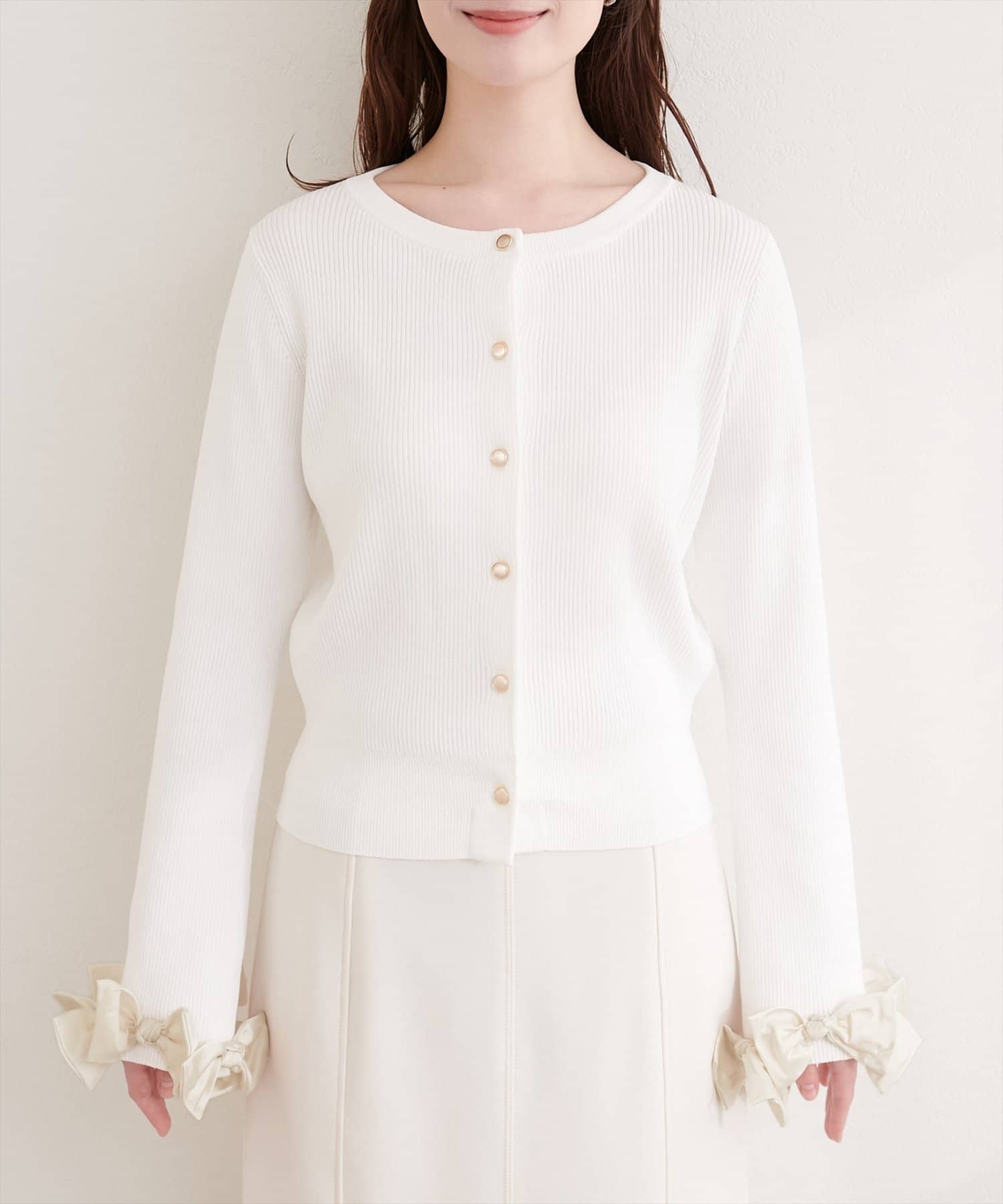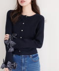 袖口にあしらわれたリボンがポイントの大人可愛いカーディガン。