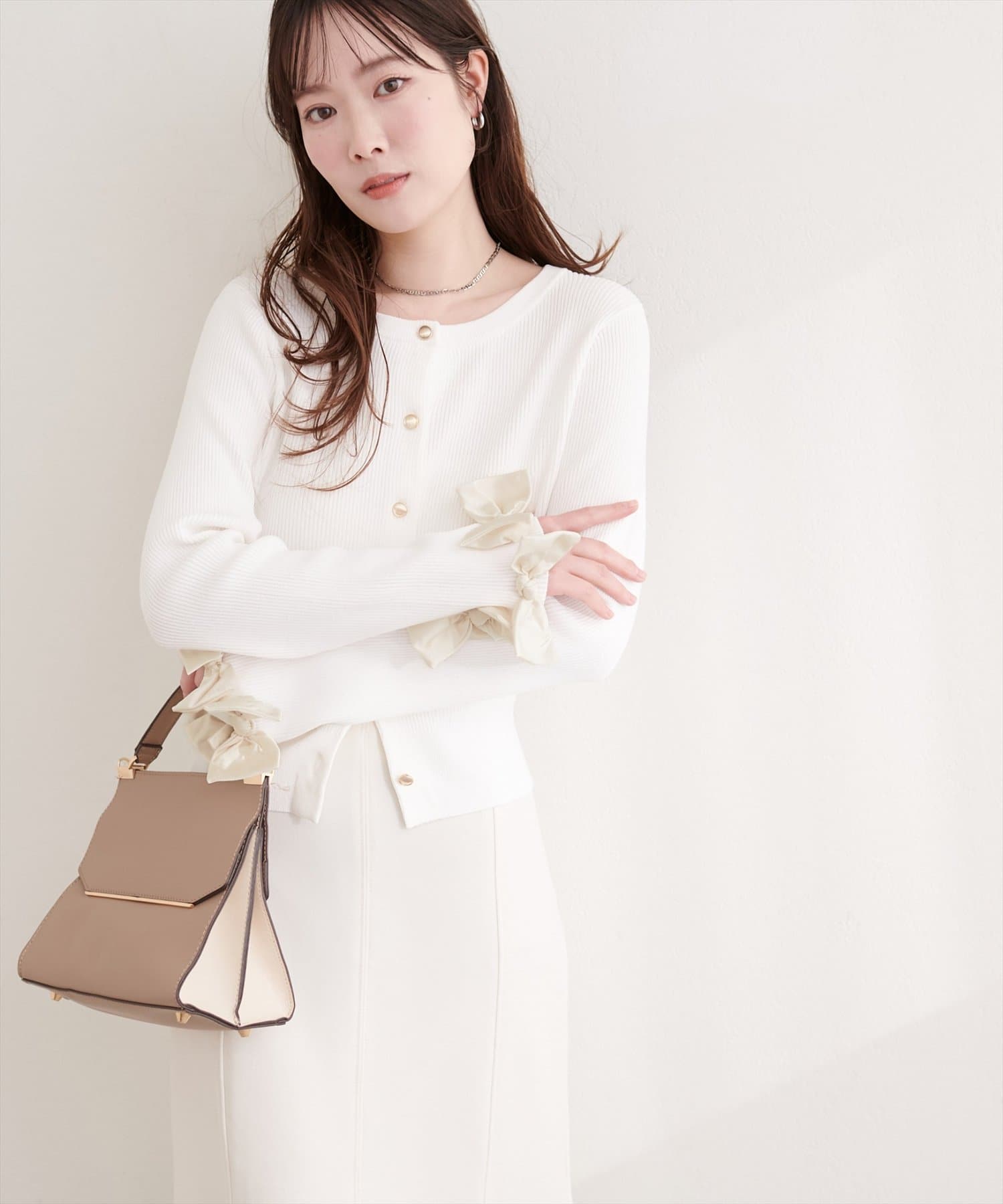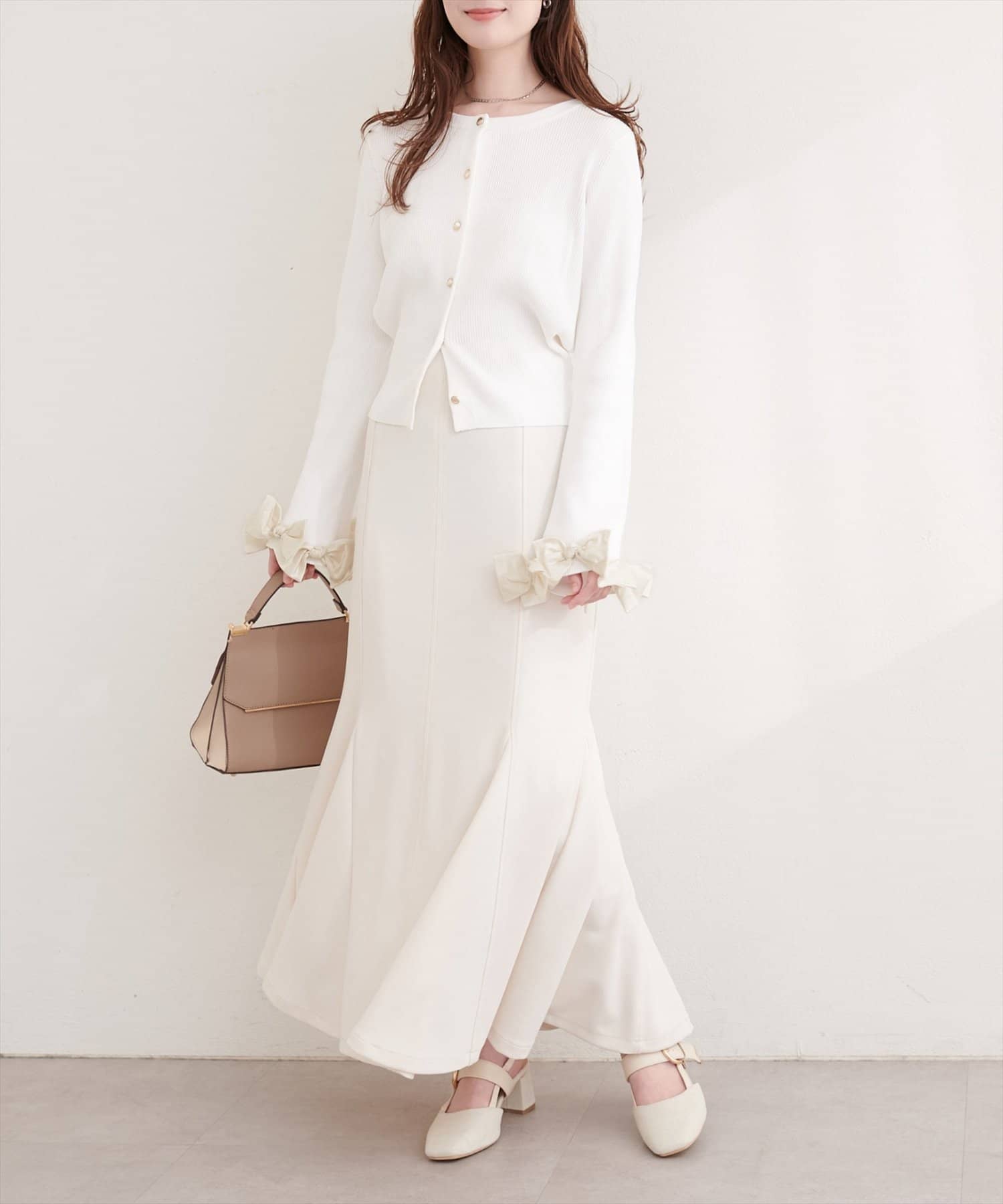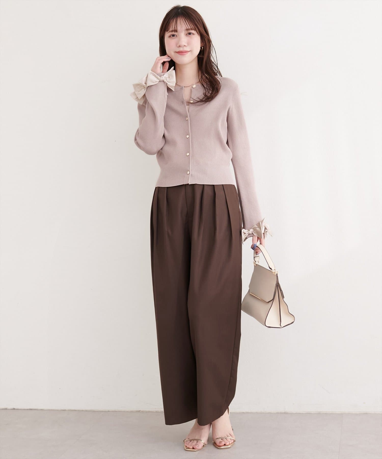 袖口にあしらわれたリボンがポイントの大人可愛いカーディガン。
