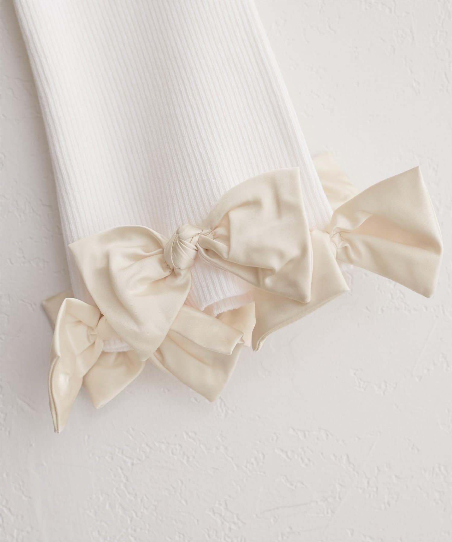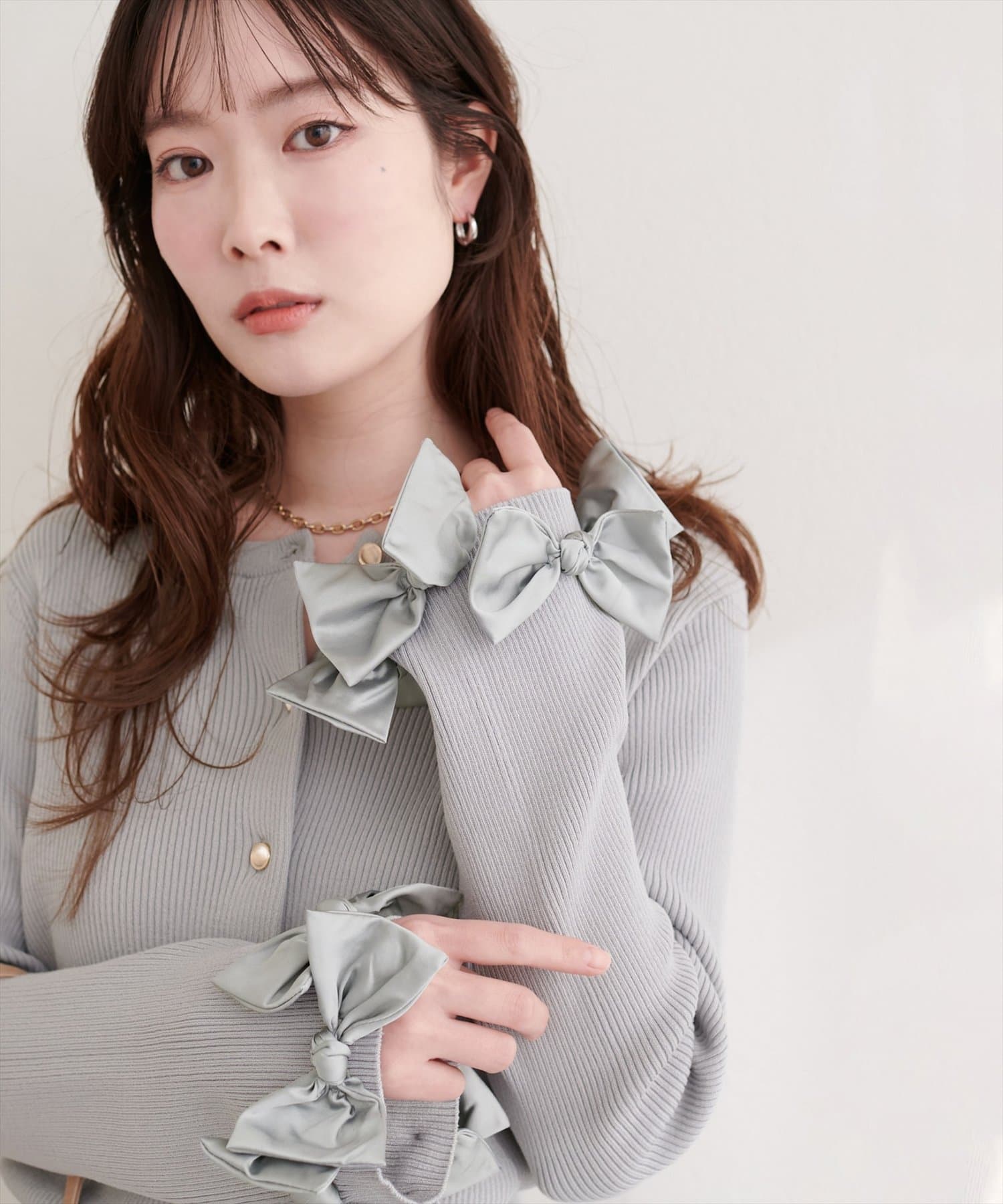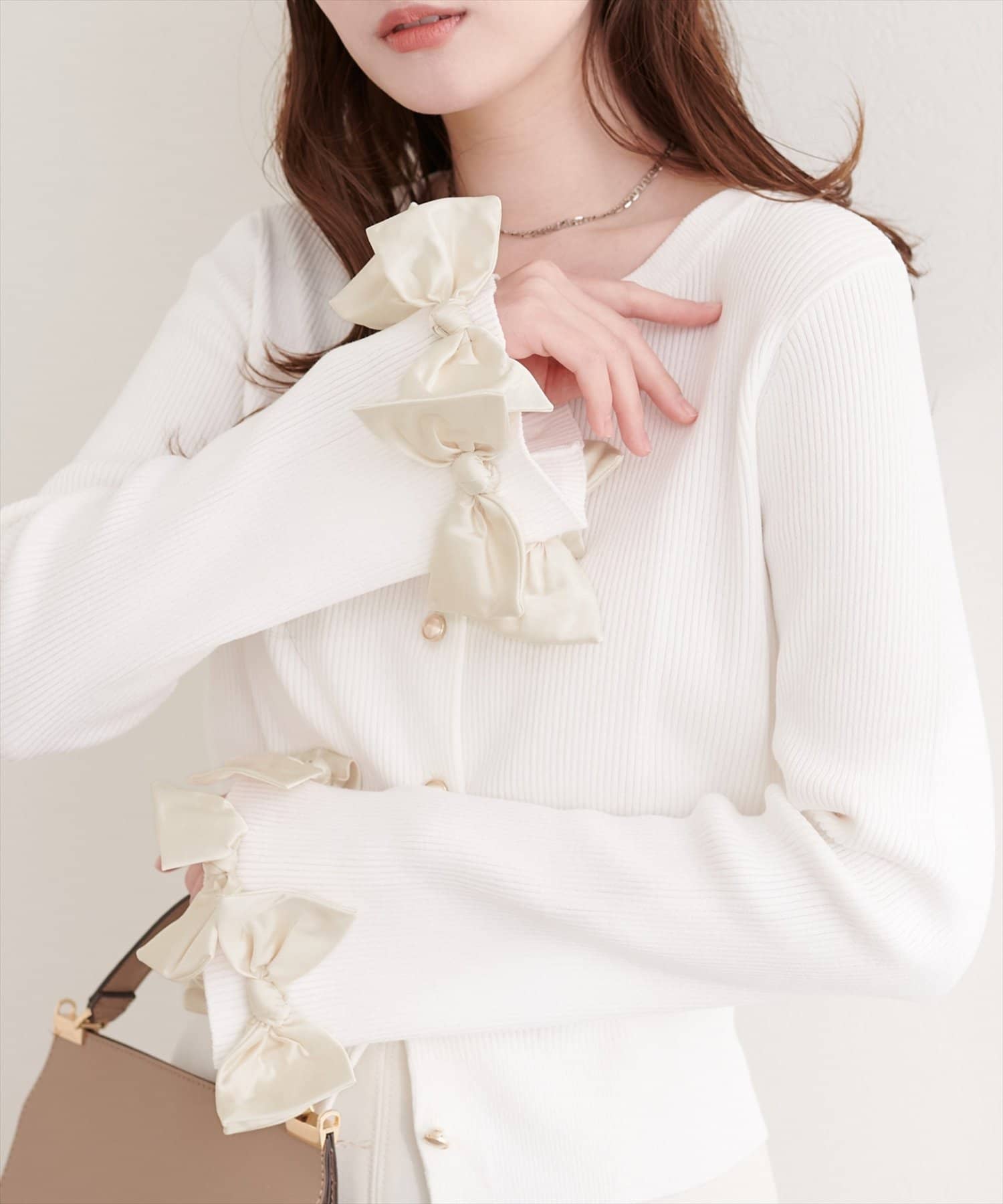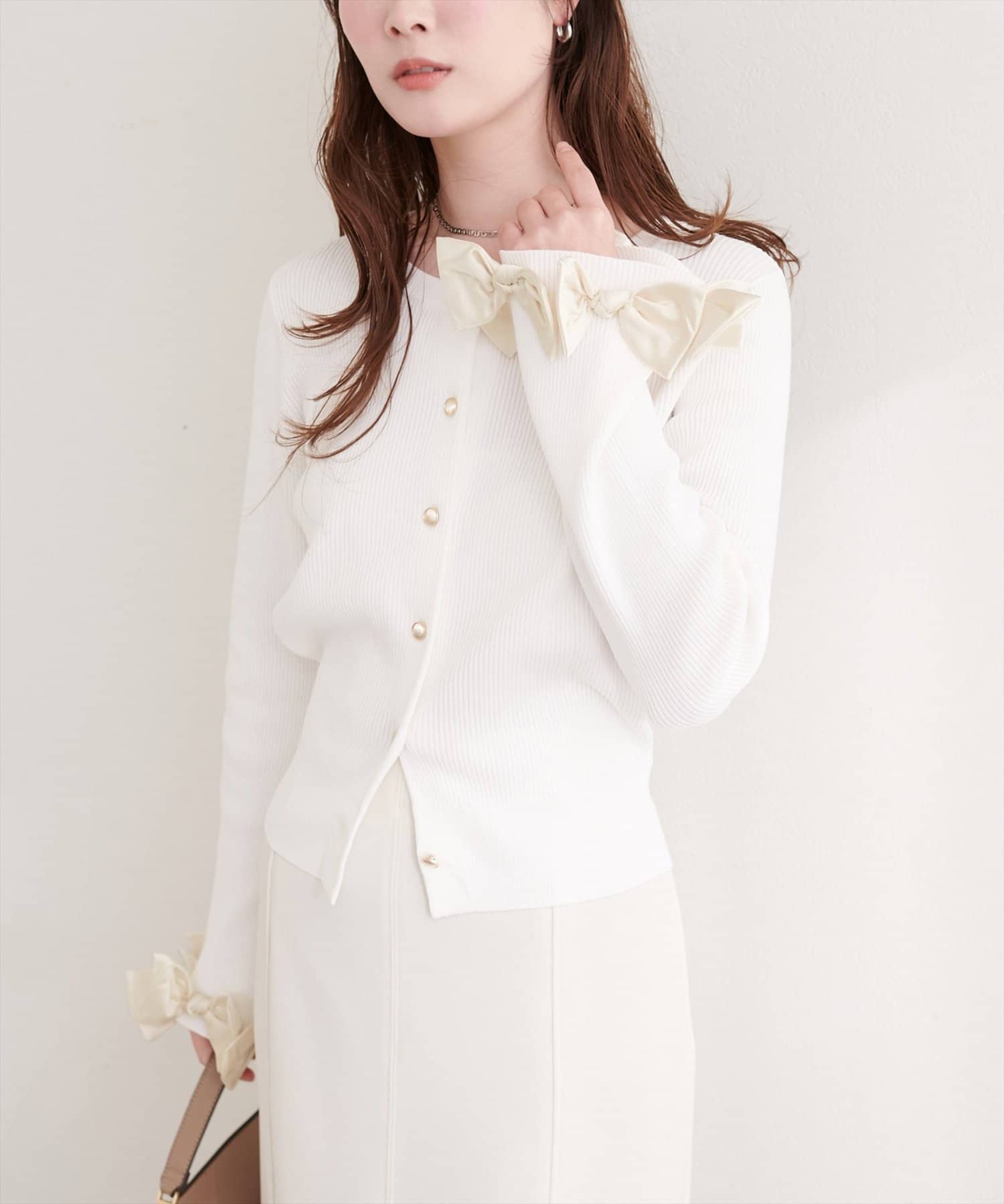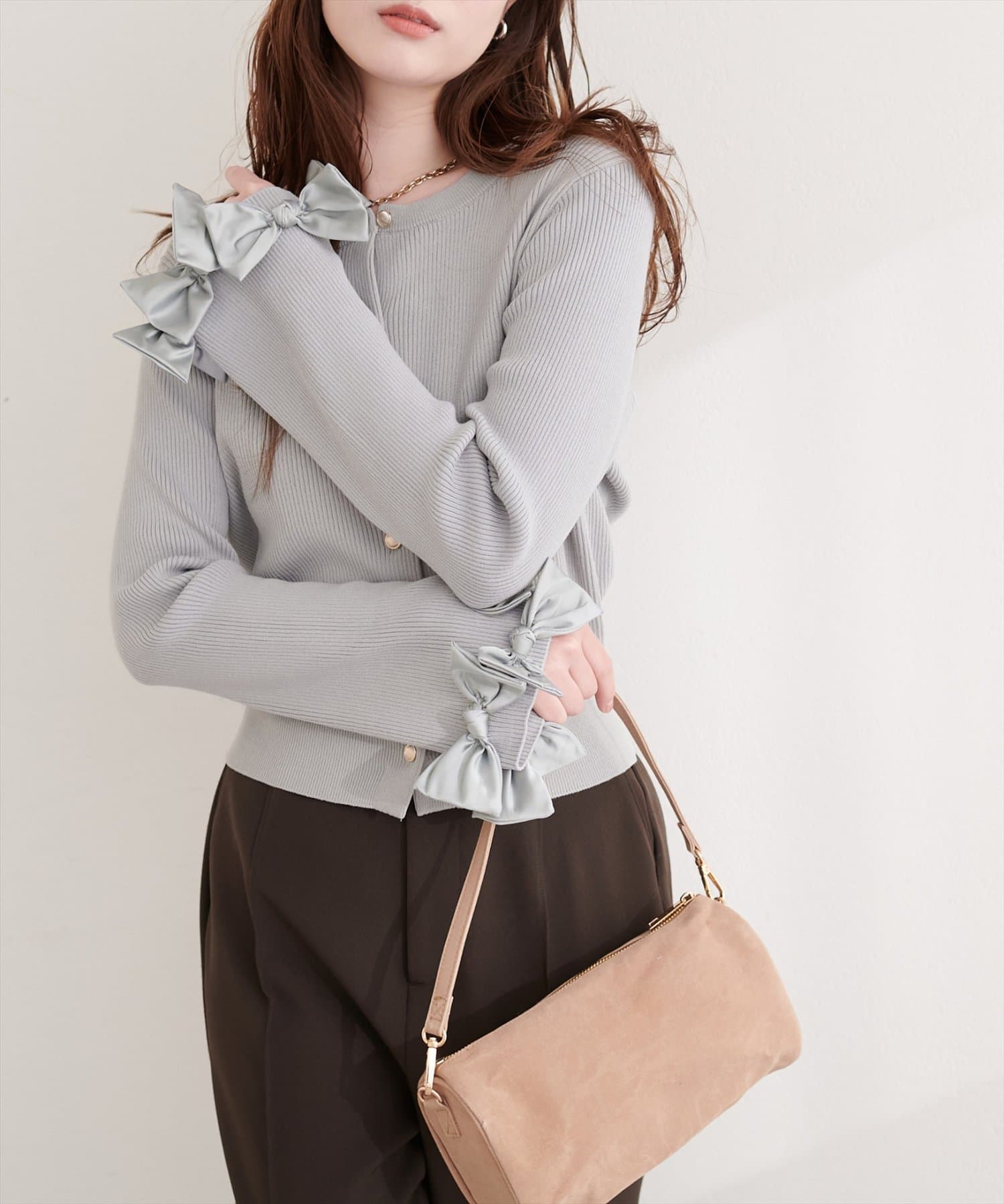 リボンは上品な光沢感がありニット素材とのコントラストも印象的です。