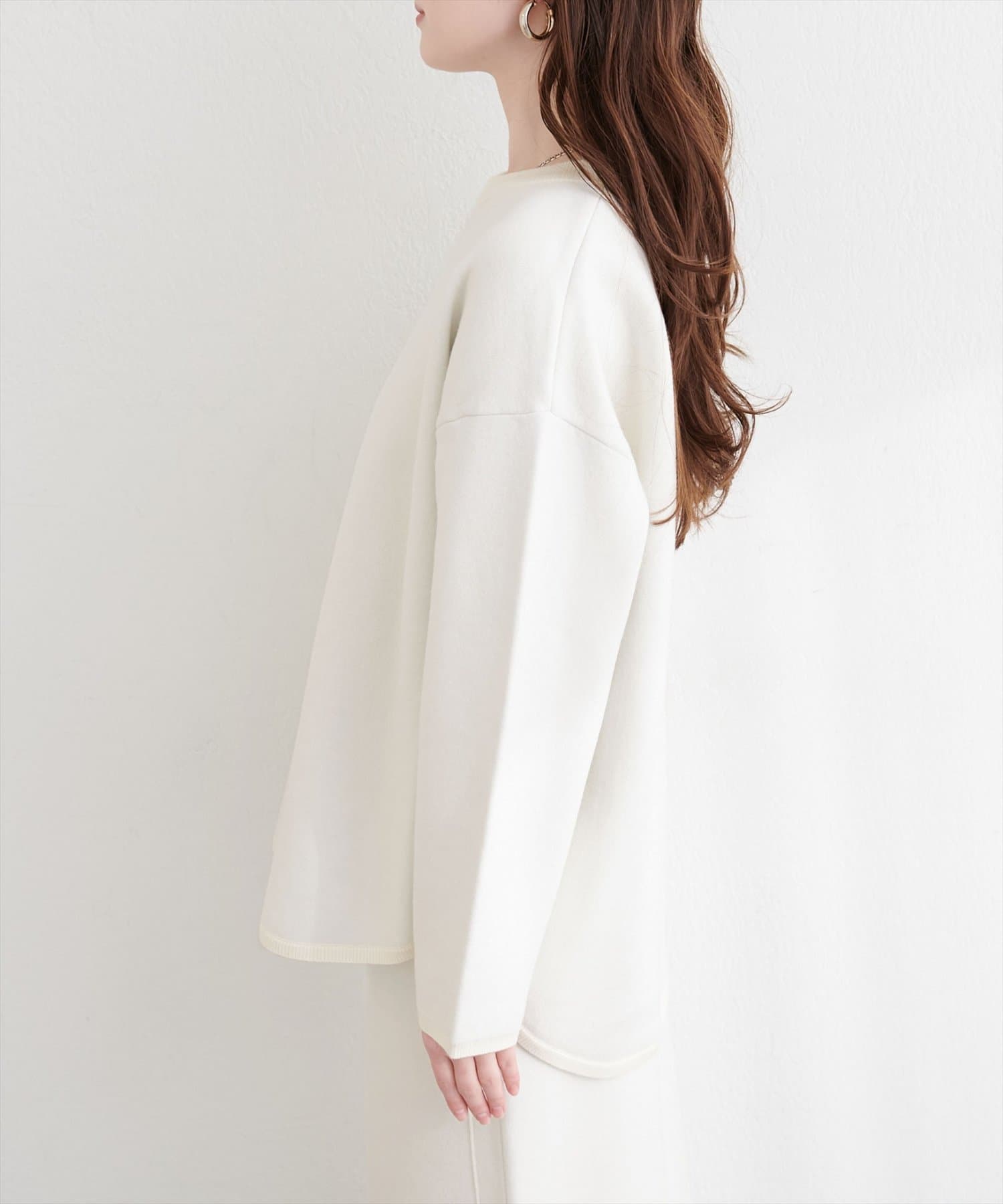 ドロップショルダーよりのデザインが、抜け感のあるこなれた雰囲気を演出し、大人の余裕を感じさせるスタイルに。