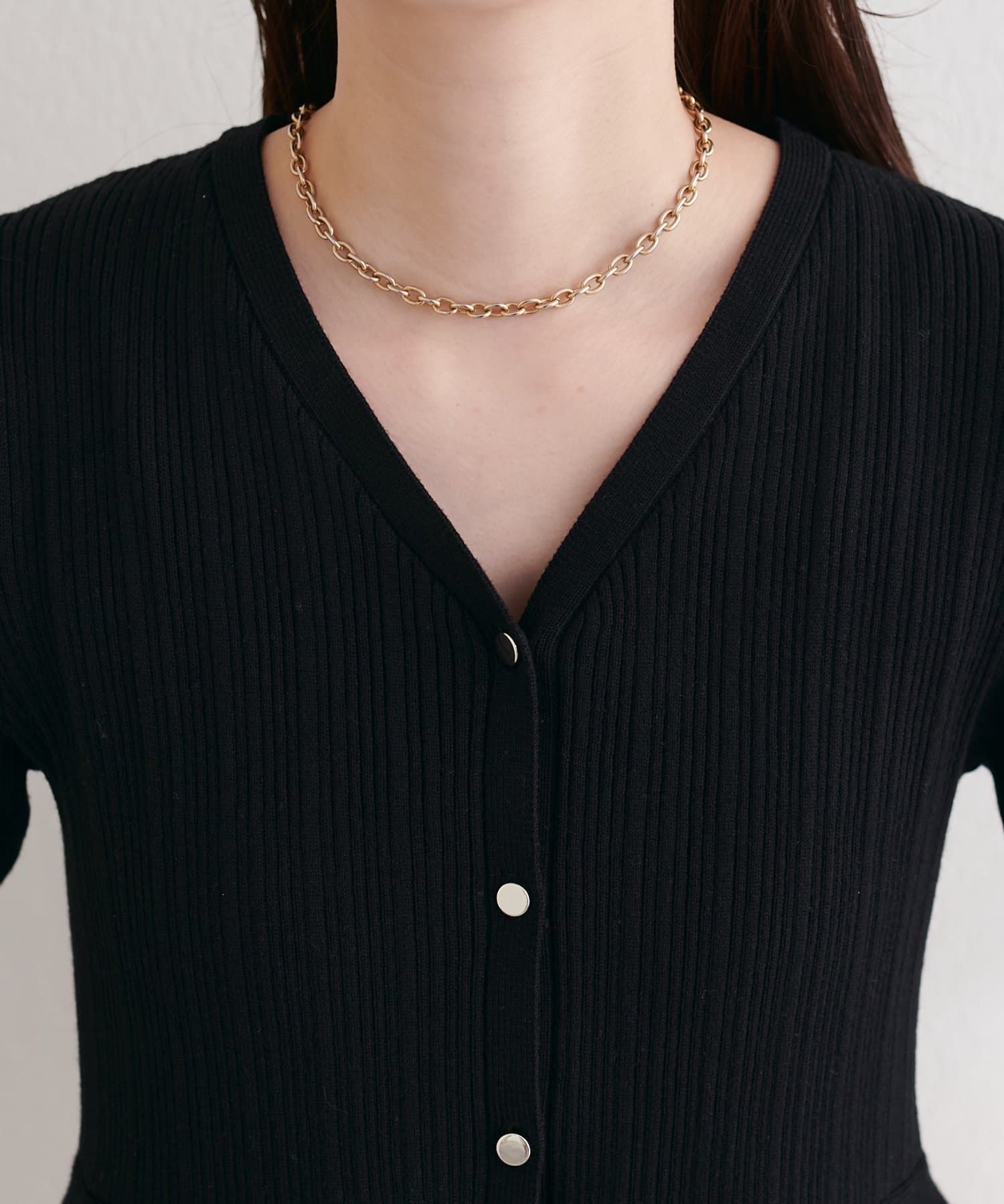 深めのVネックが、デコルテを美しく見せてくれます。顔まわりをすっきりとシャープに見せてくれる効果も。