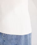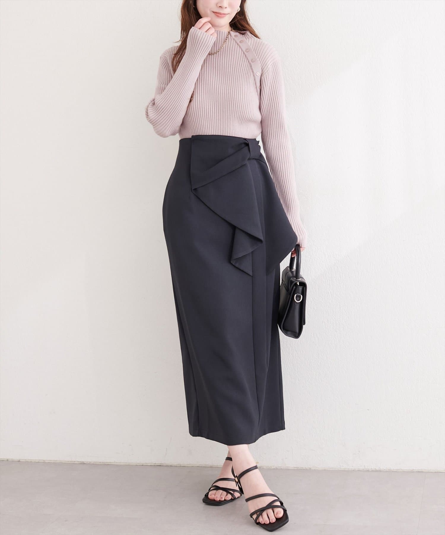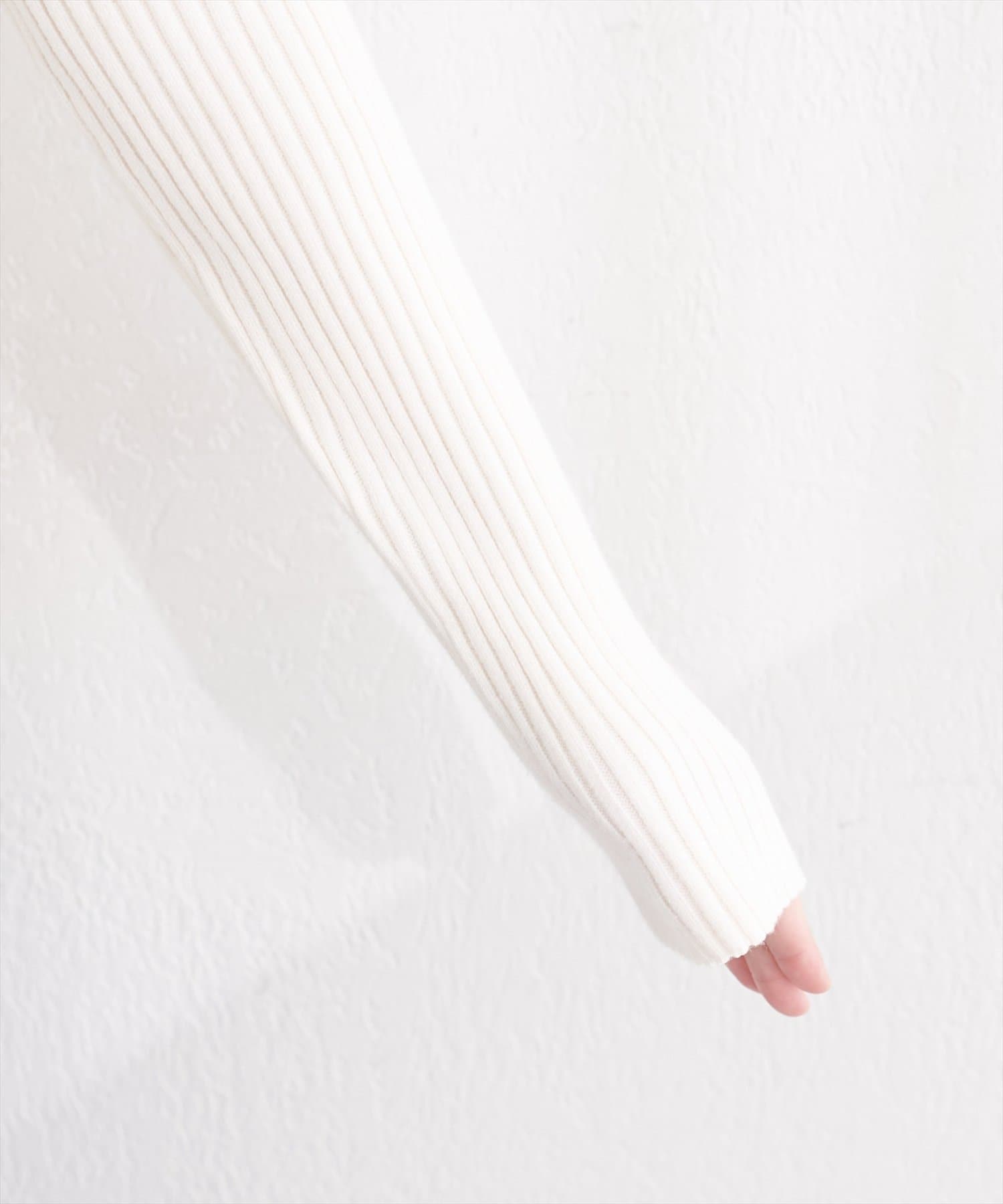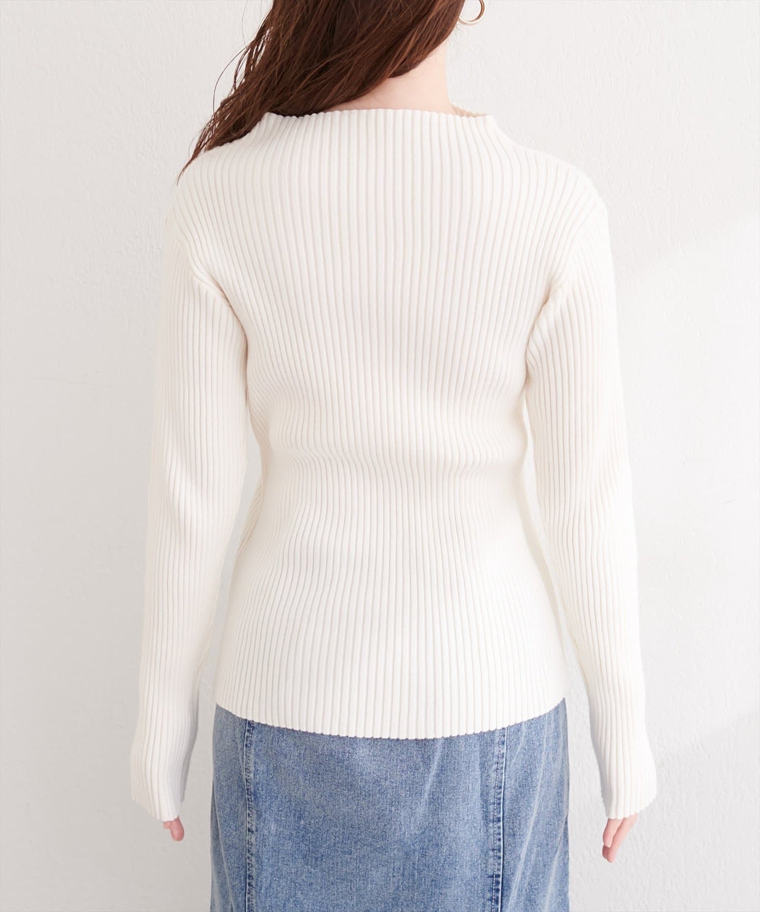 アシンメトリーなデザインが、シンプルなリブニットに洗練された印象をプラス。