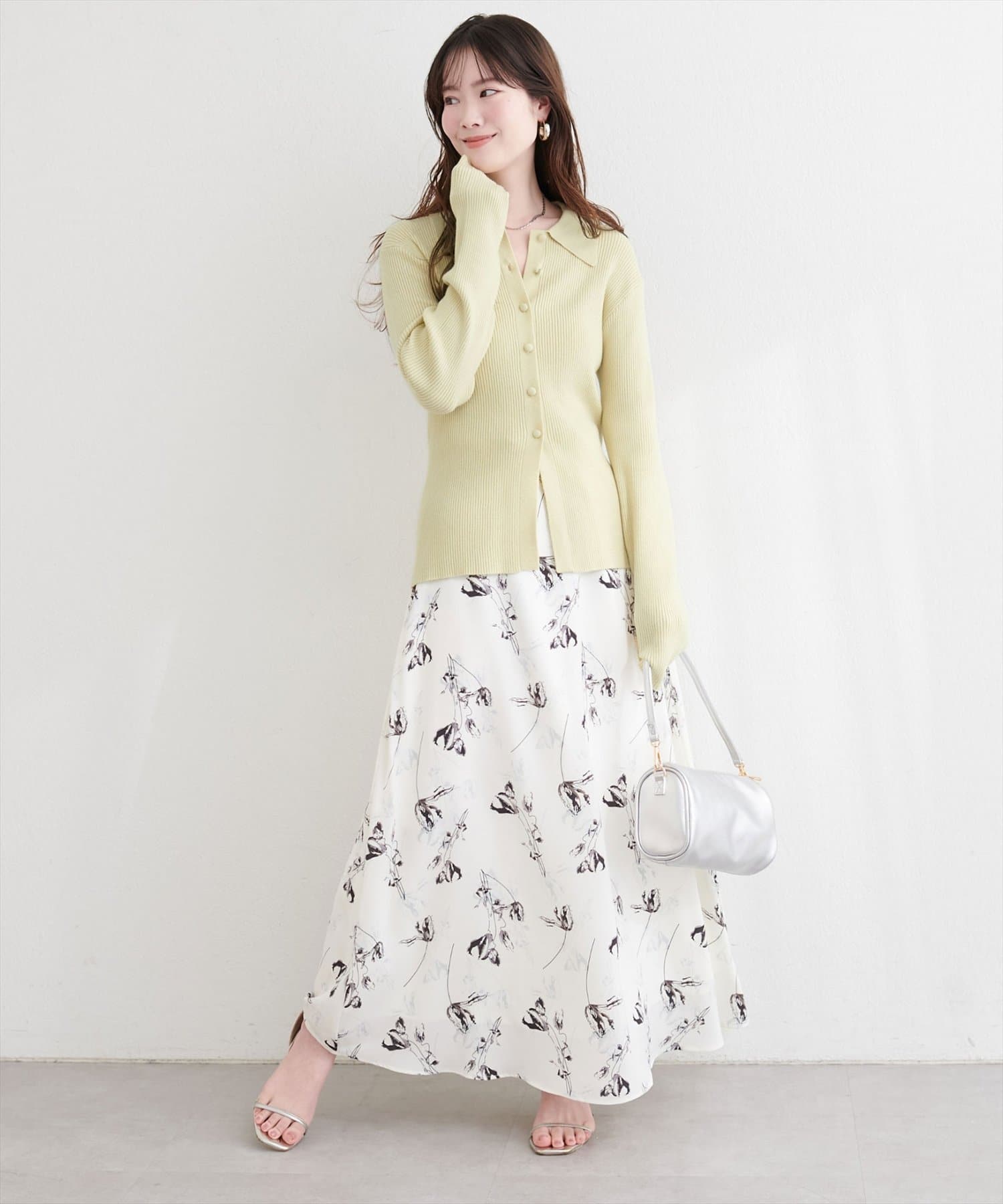 シンプルなデザインなので花柄のスカートなど、柄物アイテムとも相性も抜群です。