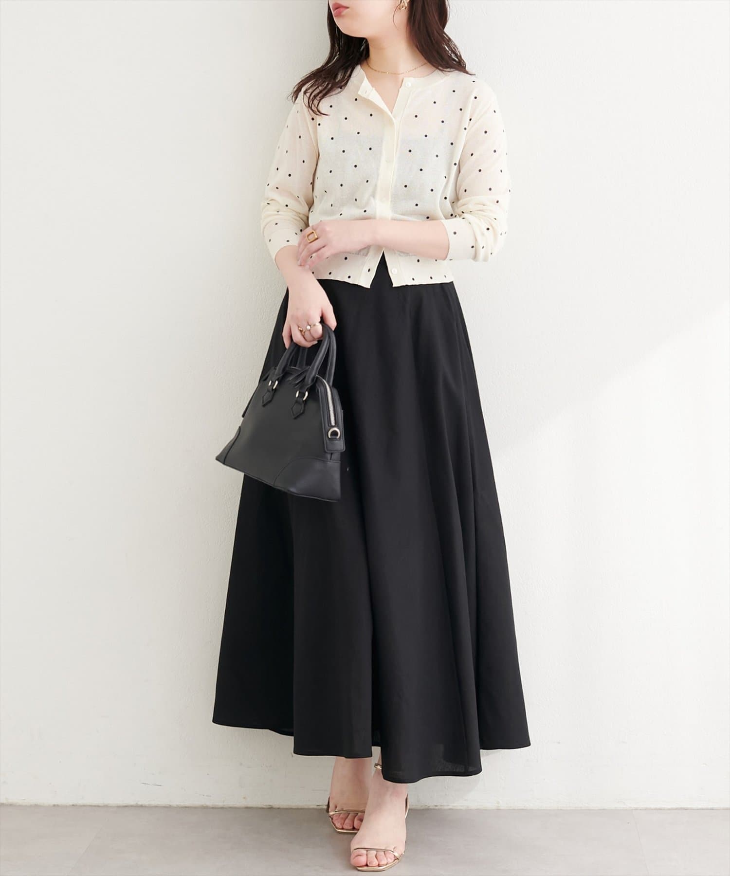 アクセサリーは華奢でシンプルなものにすると、よりドット柄を引き立ちます◎