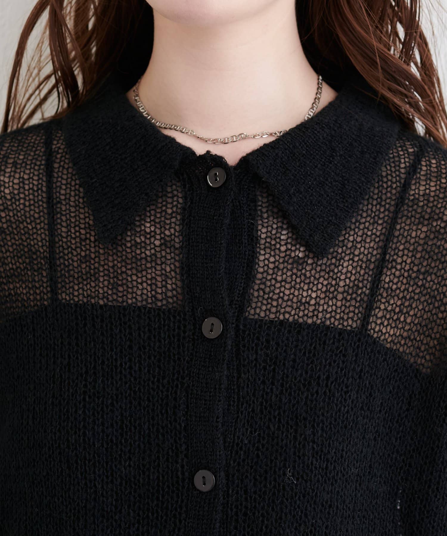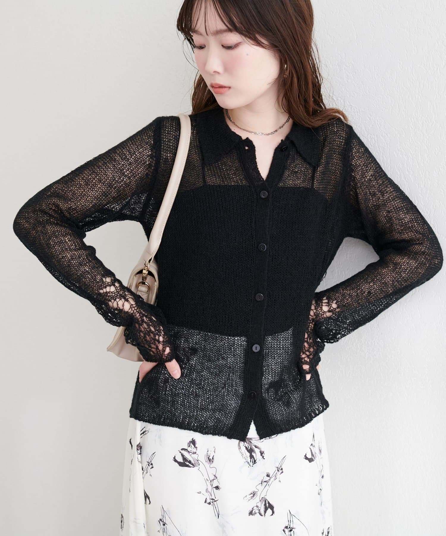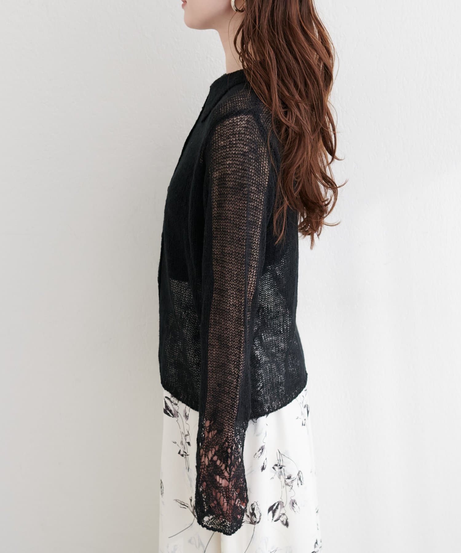 繊細な透け感と、遊び心のあるデザインが印象的なニット。