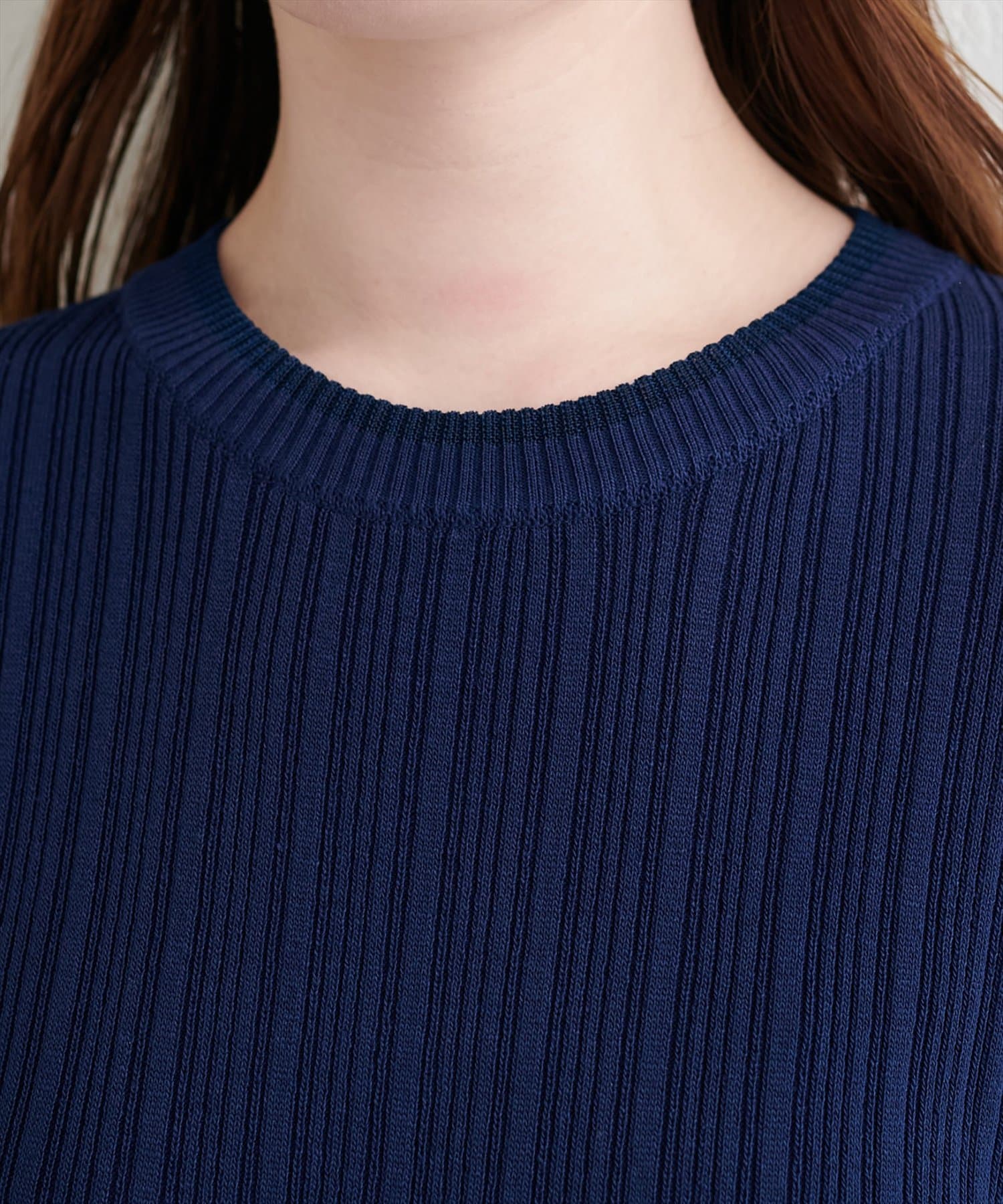 首元はすっきりとした印象のクルーネック。