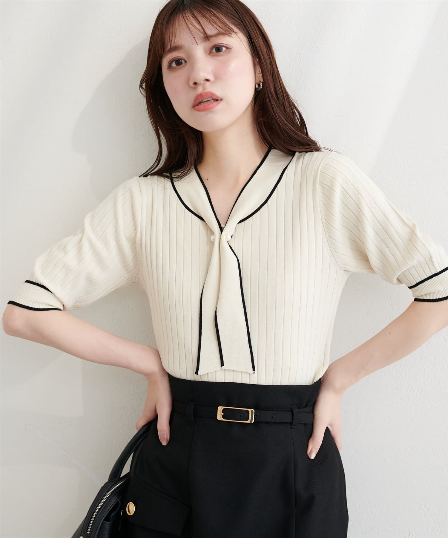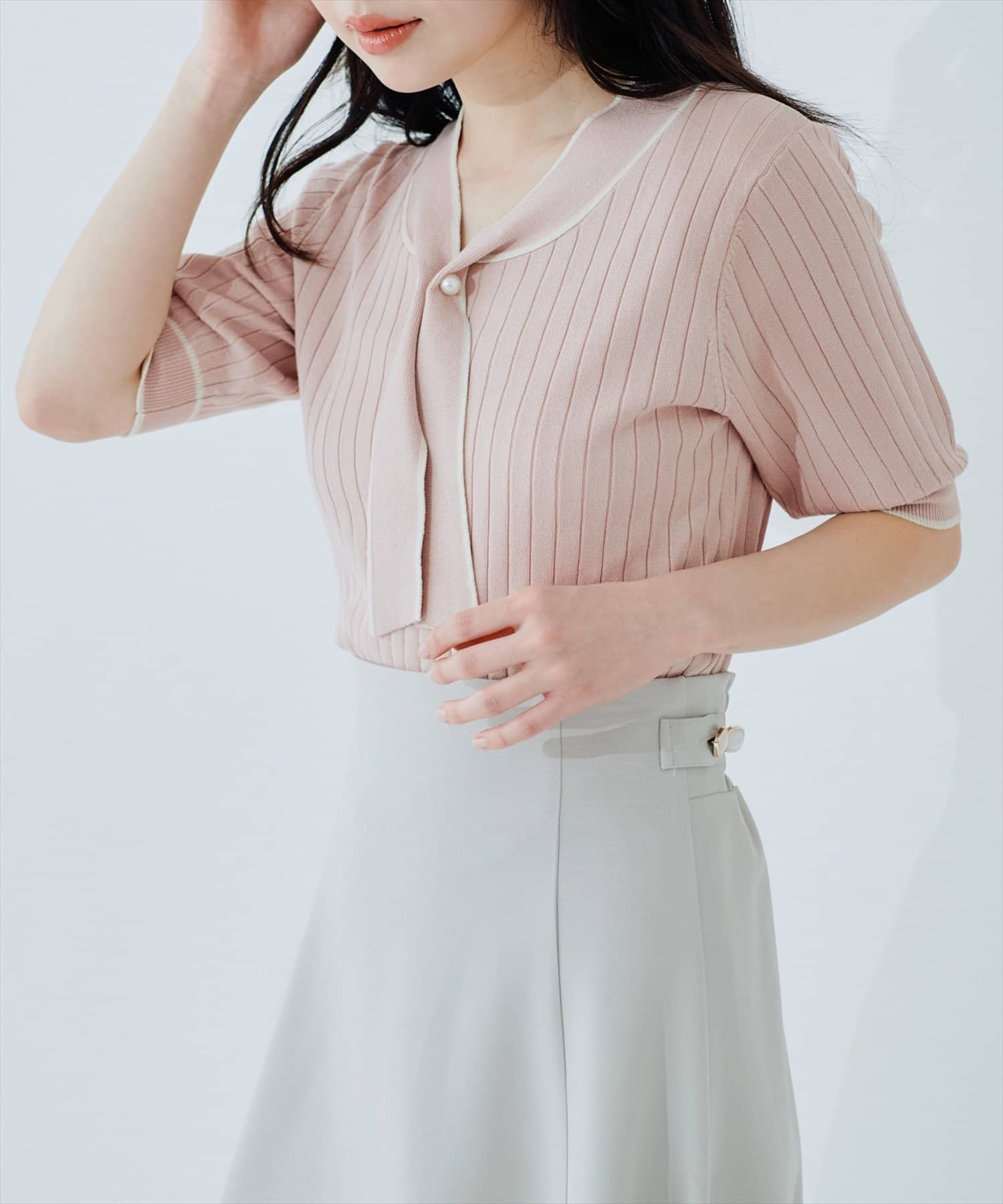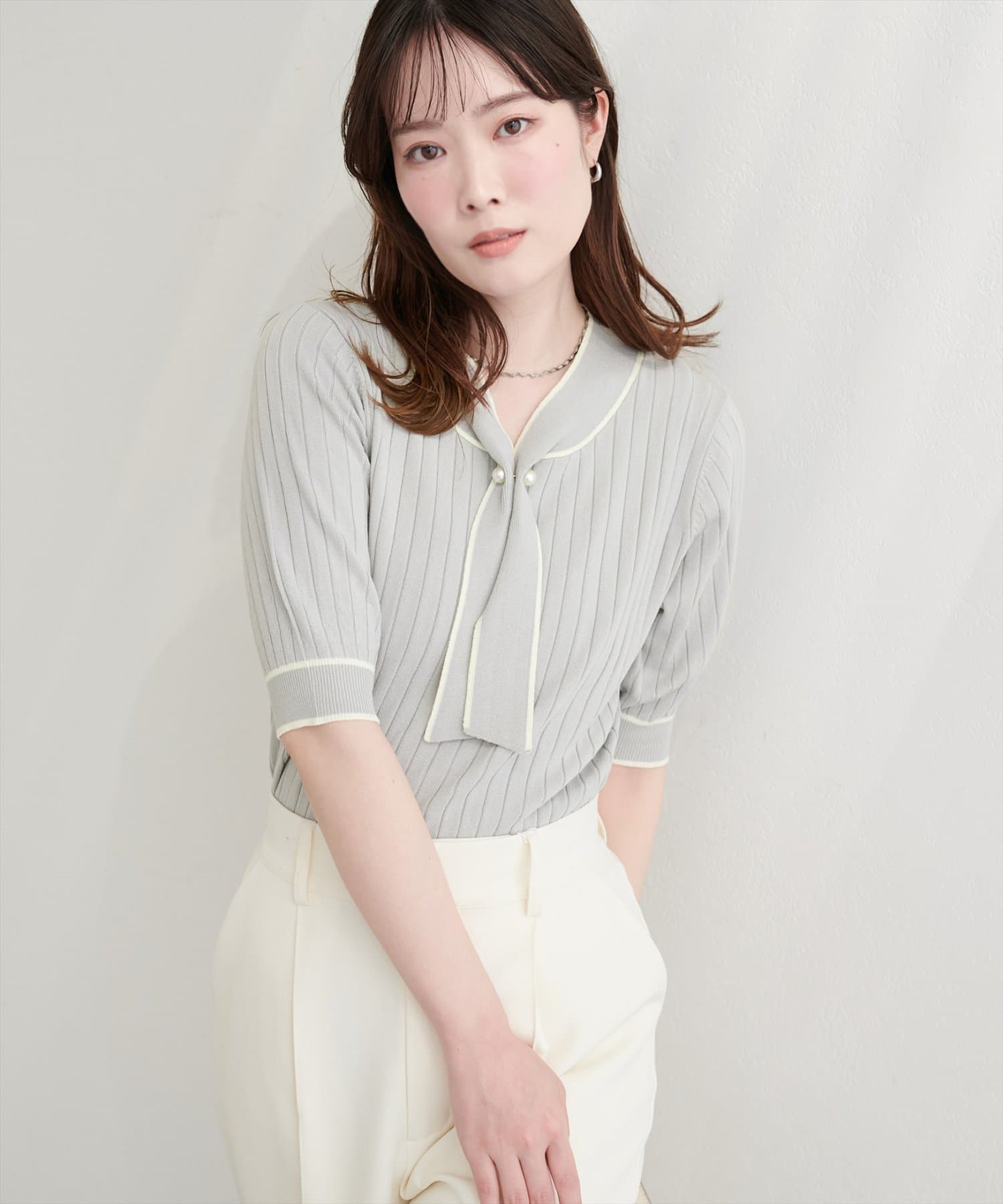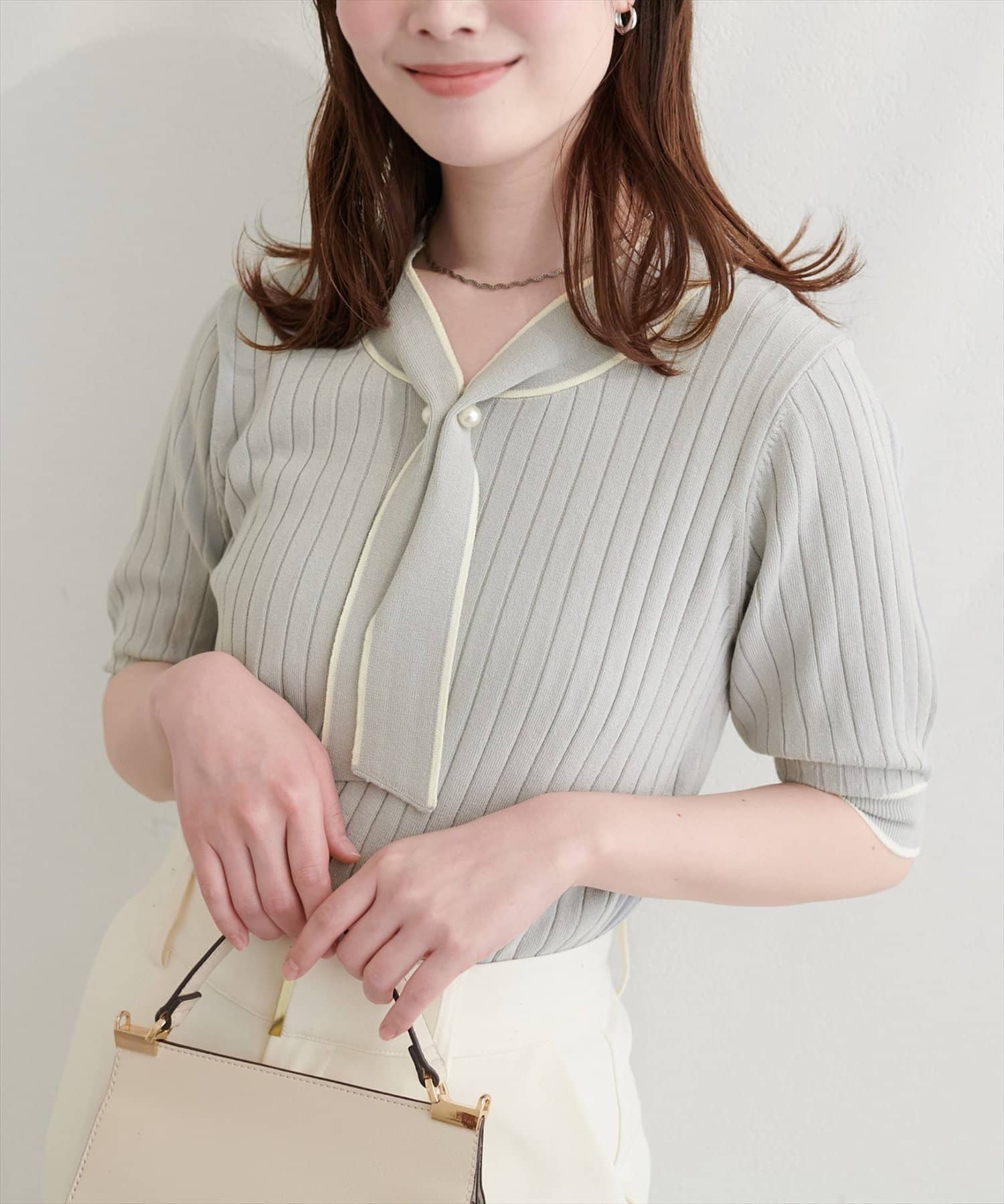 大人の女性らしい魅力が映える、ボウタイニット。