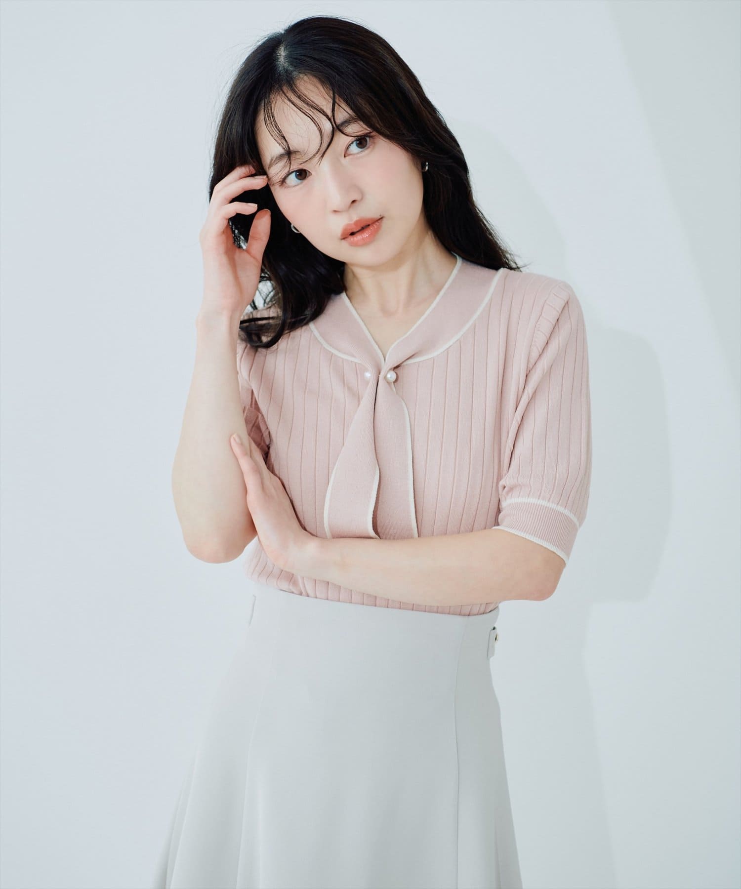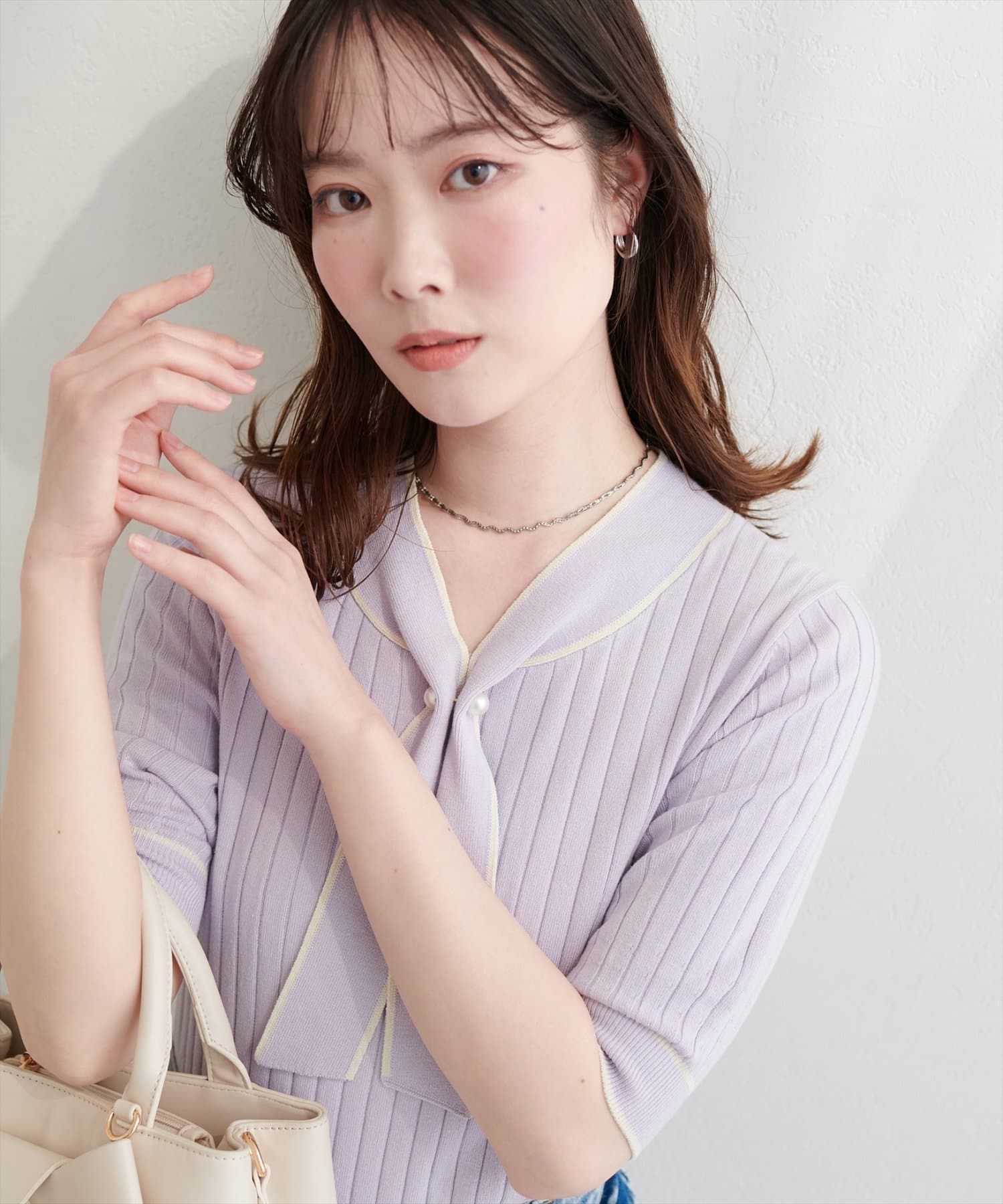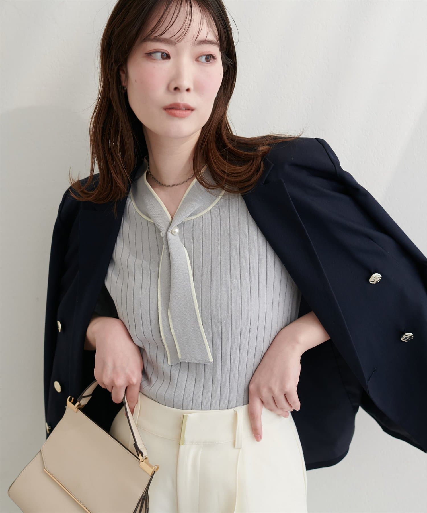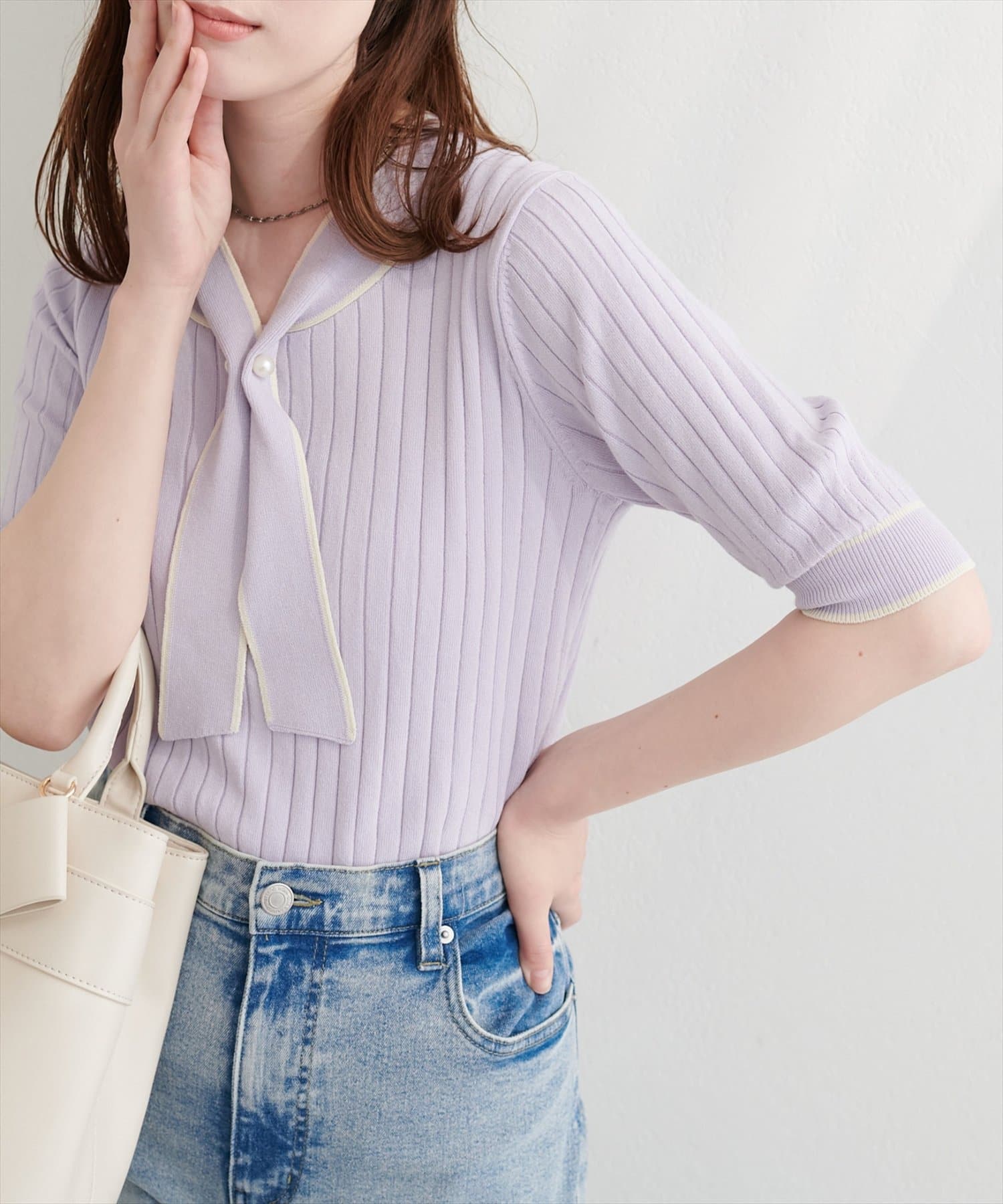 大人の女性らしい魅力が映える、ボウタイニット。