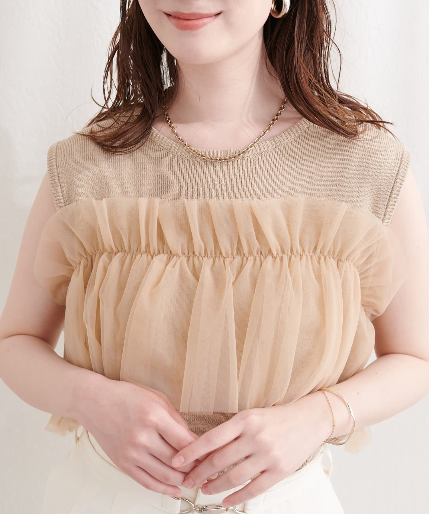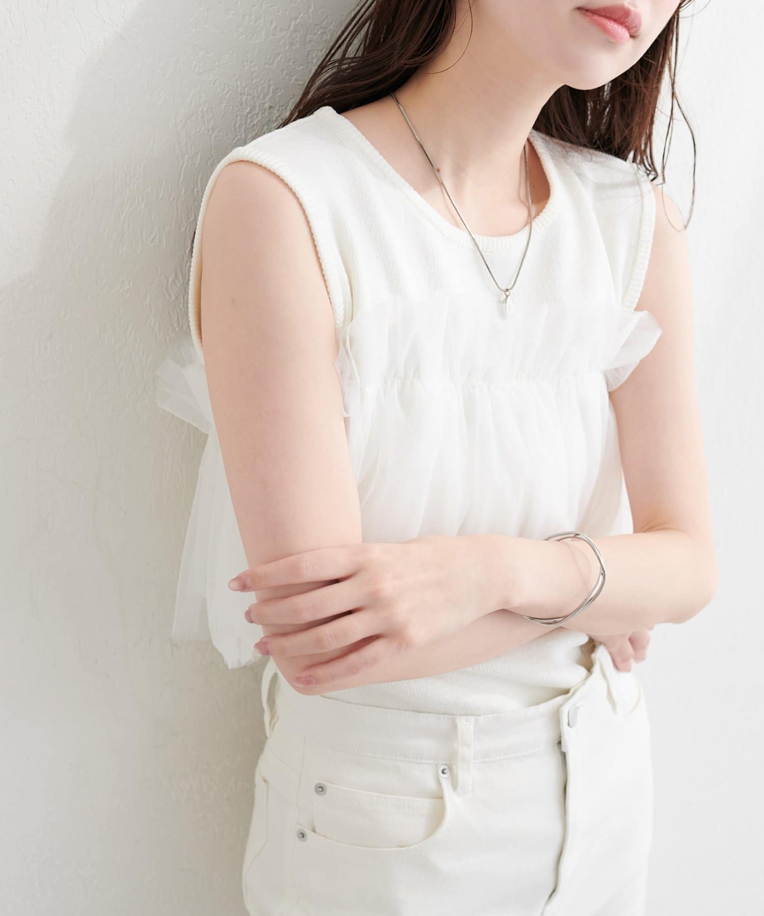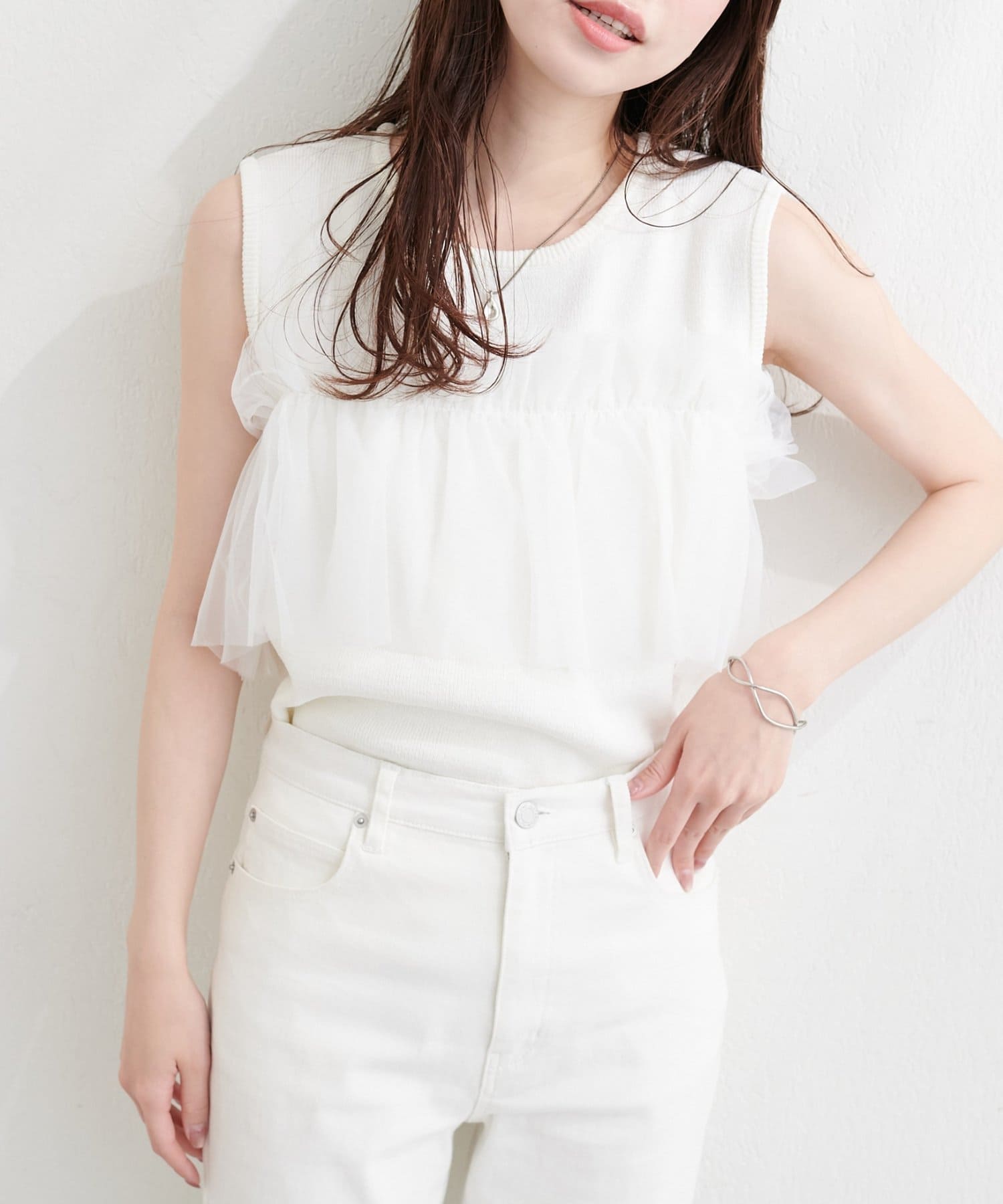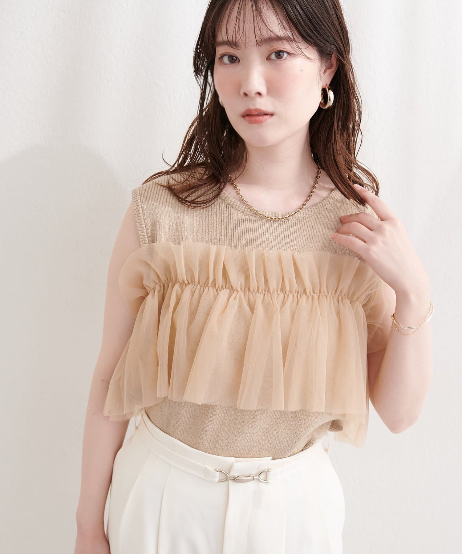 ニットとチュールの異素材ミックスが、単調になりがちなタンクトップスタイルに奥行きをプラス。