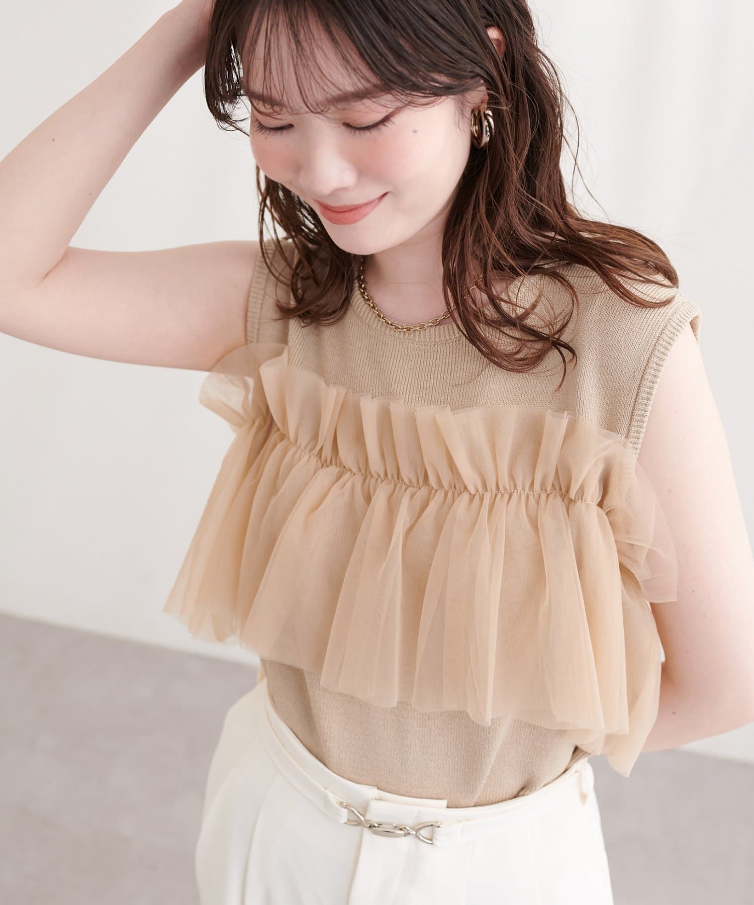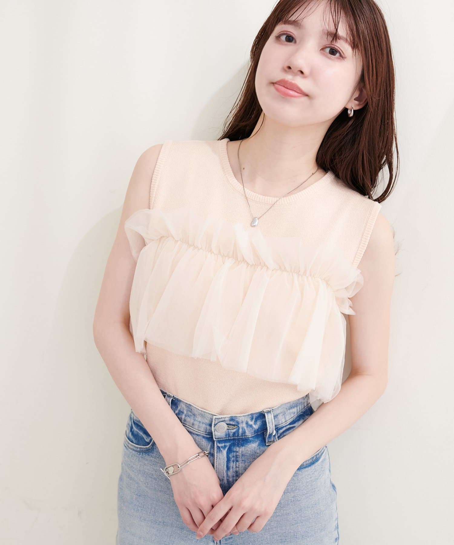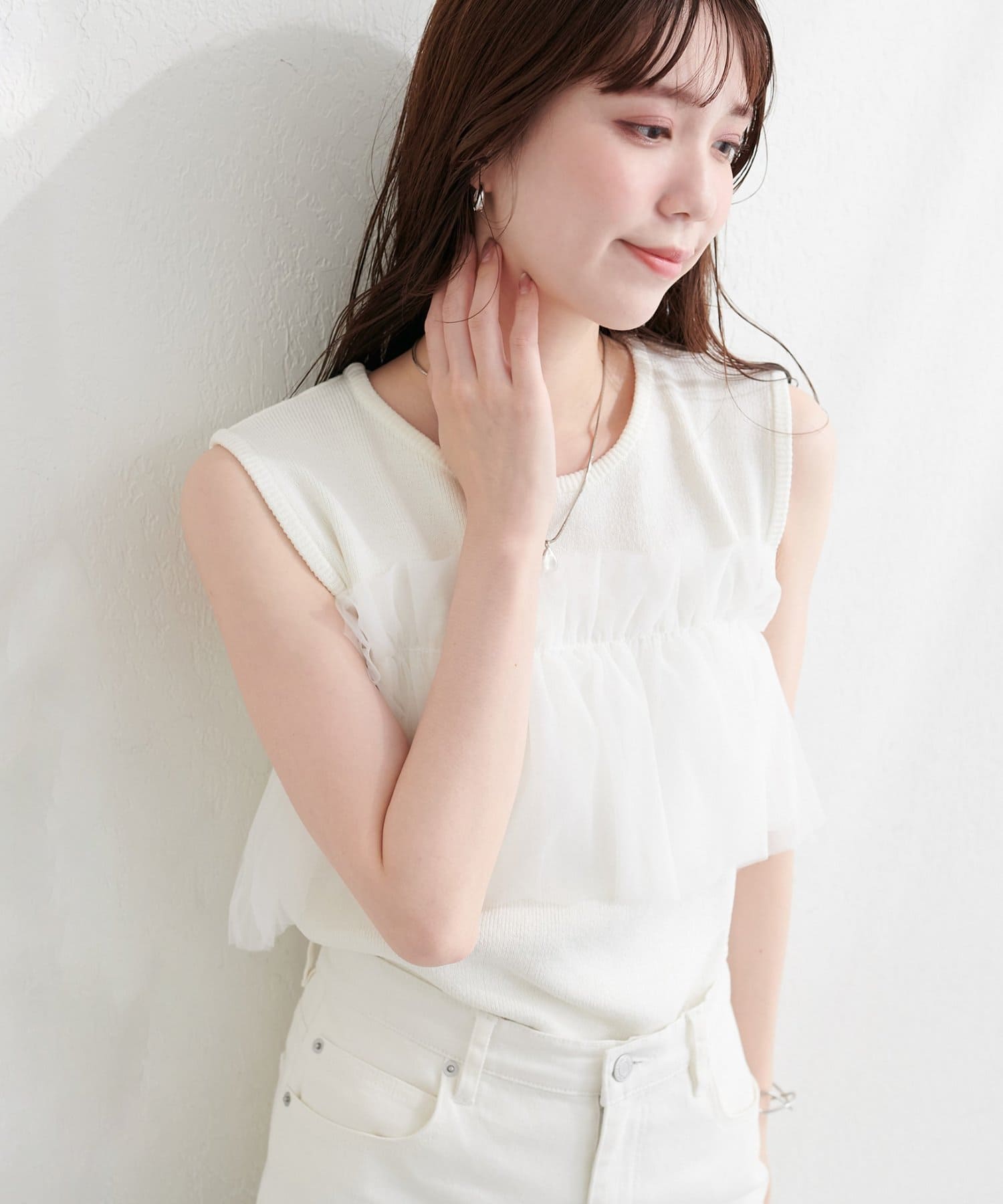 ニットとチュールの異素材ミックスが、単調になりがちなタンクトップスタイルに奥行きをプラス。
