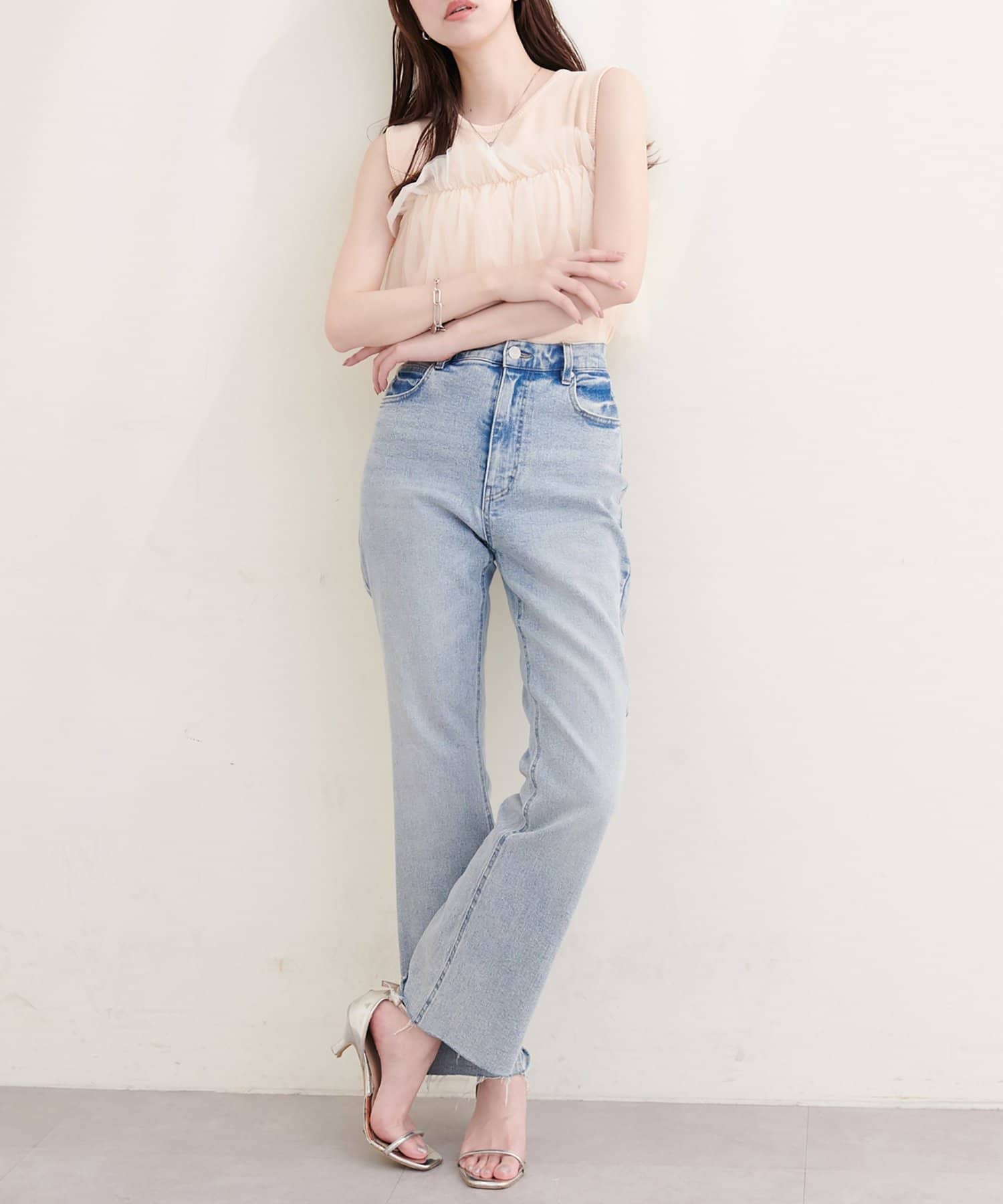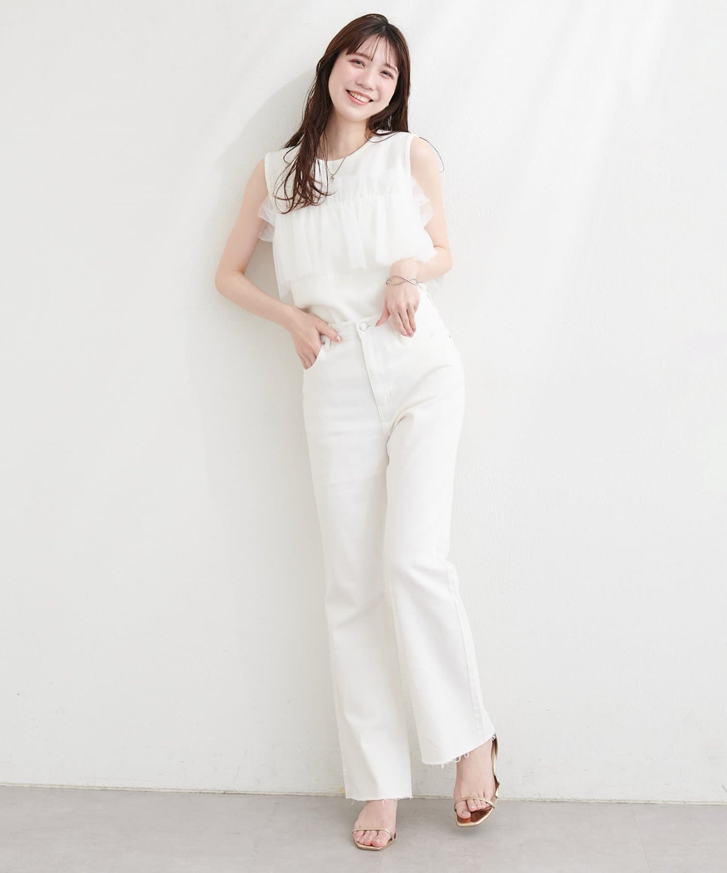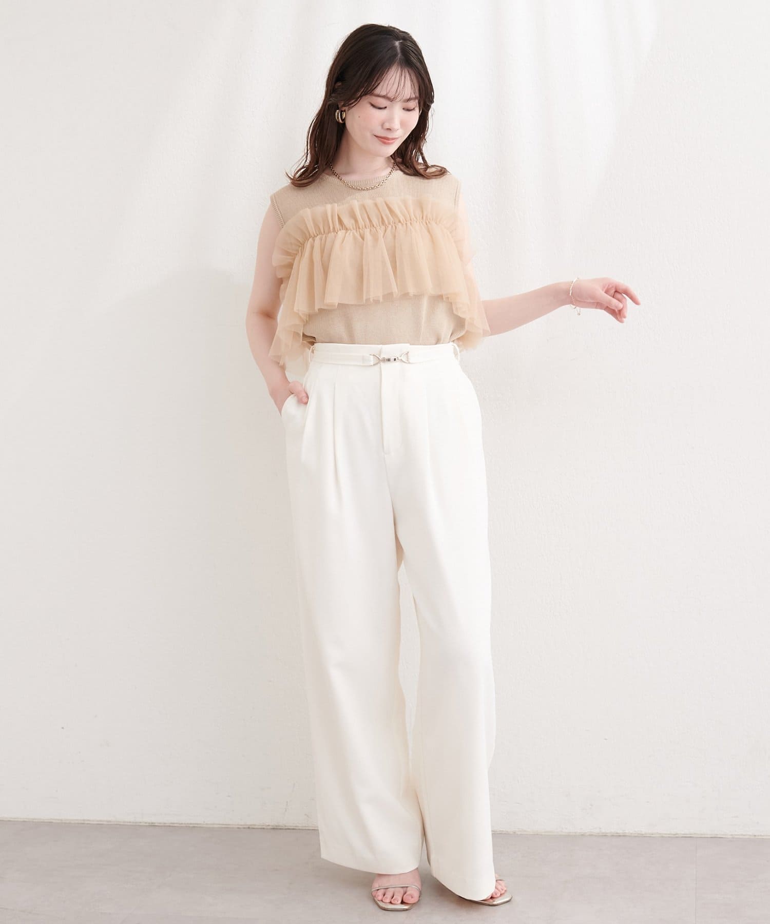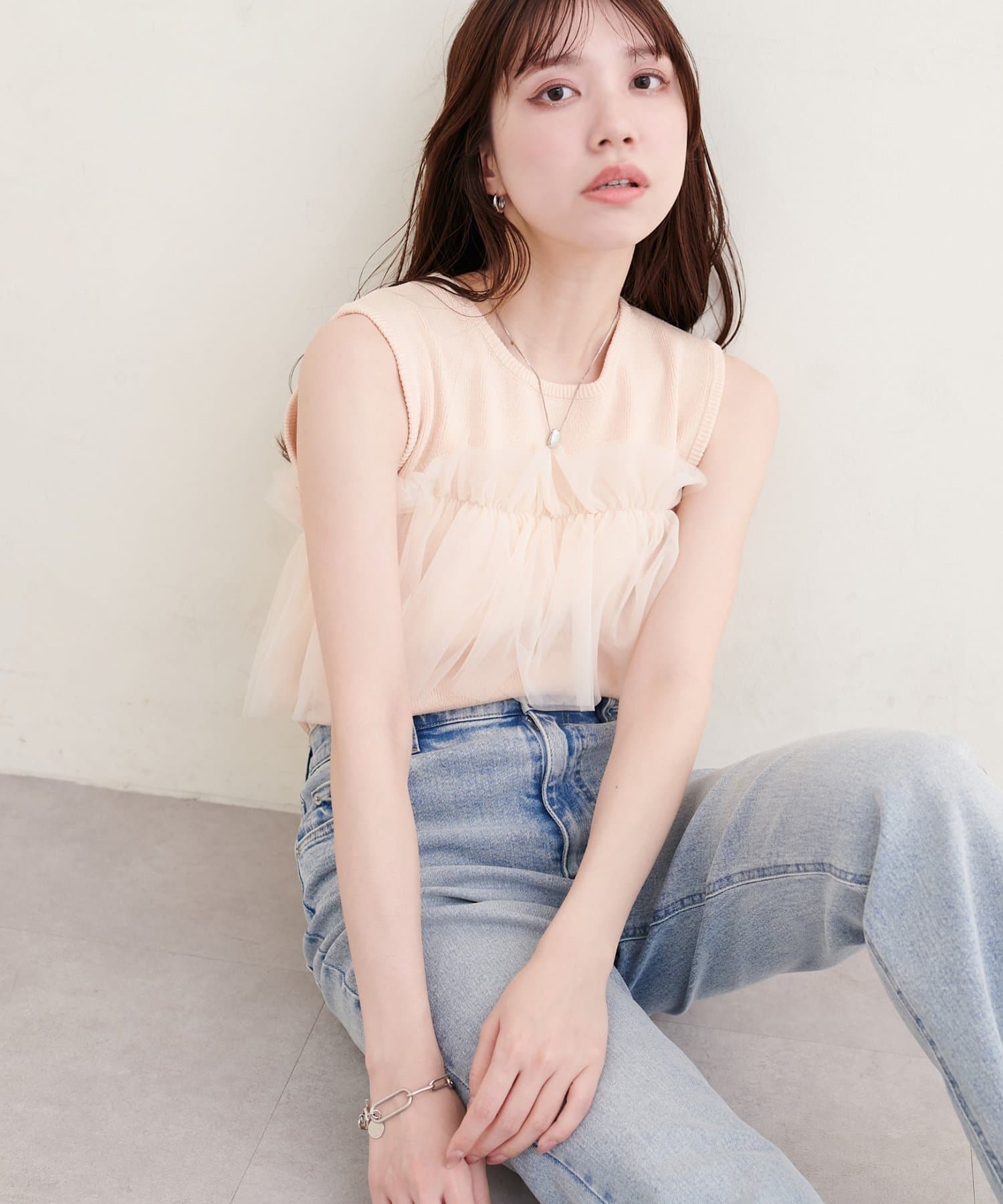 ニットとチュールの異素材ミックスが、単調になりがちなタンクトップスタイルに奥行きをプラス。