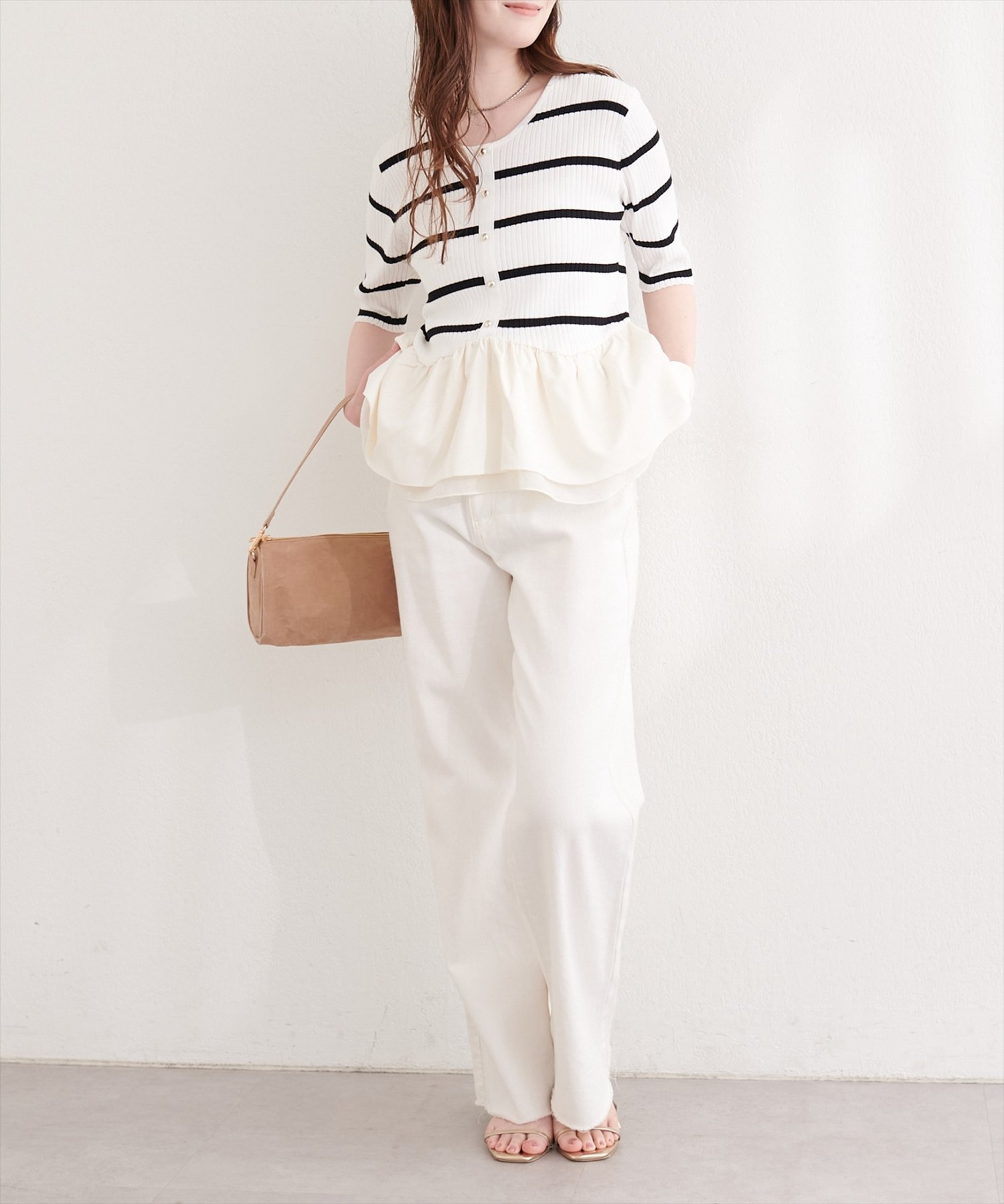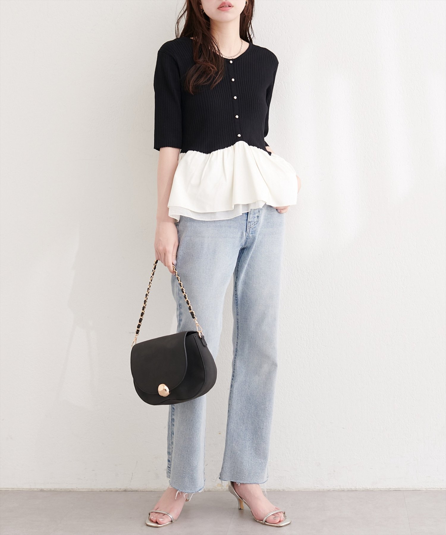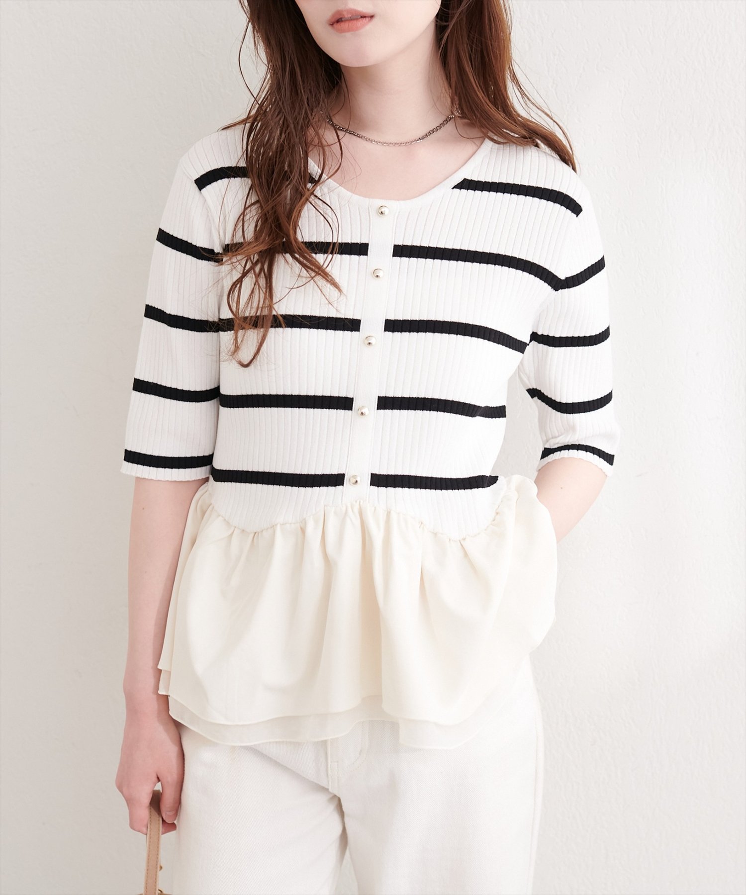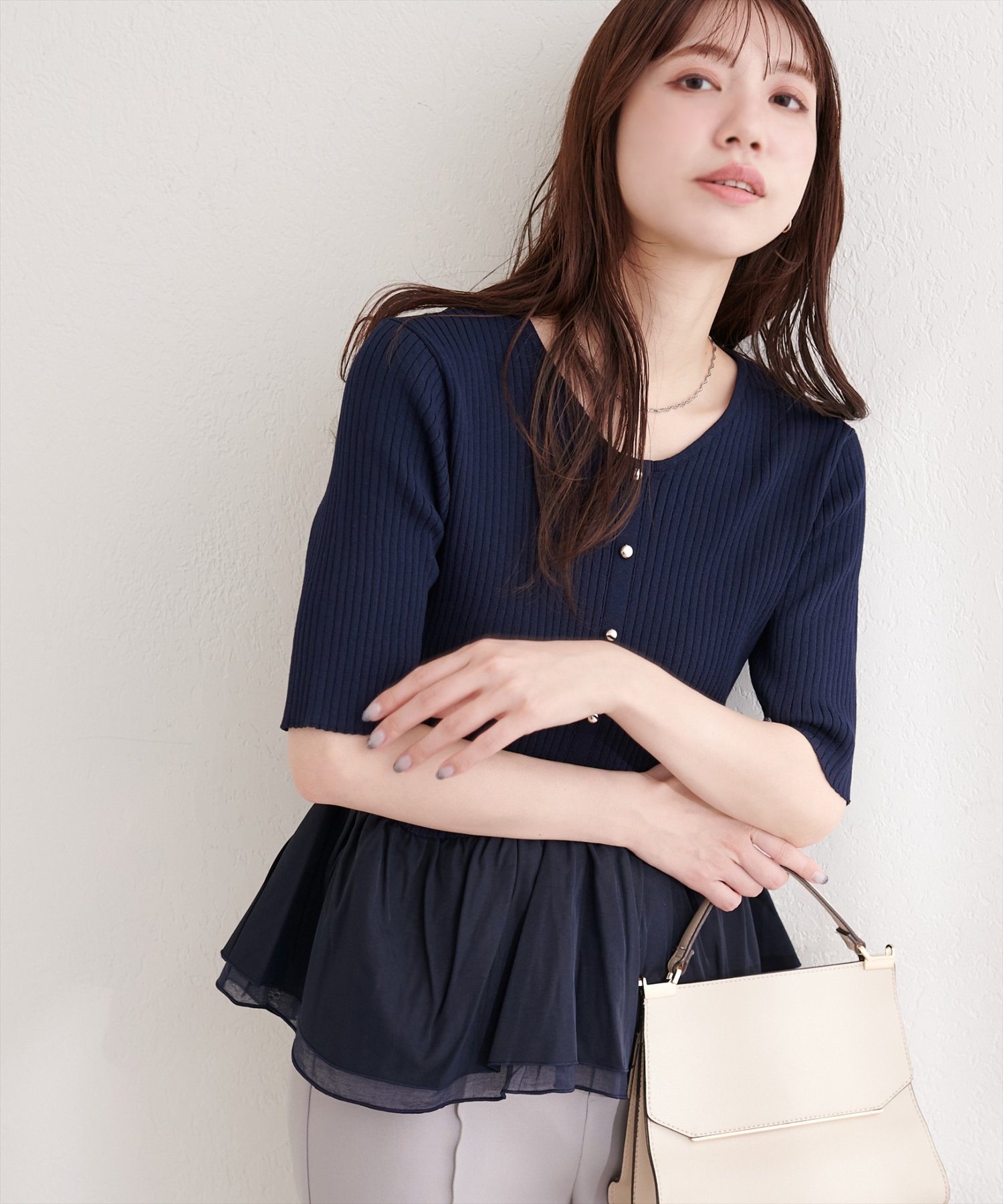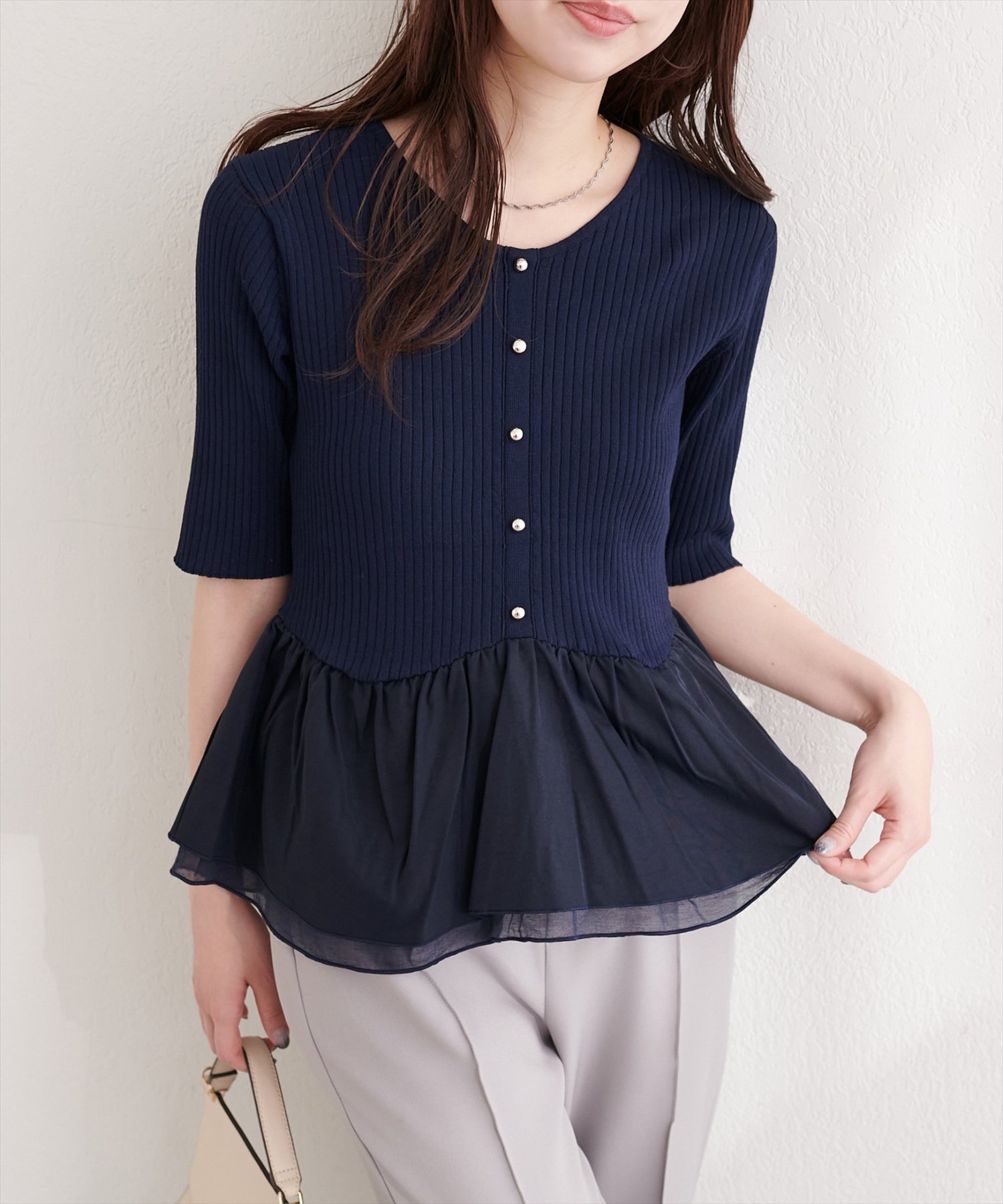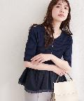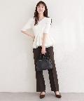 ウエストから広がるペプラム部分は、異素材の軽やかな生地を使用することで、動くたびにふわりと揺れ、女性らしいシルエットを演出します。