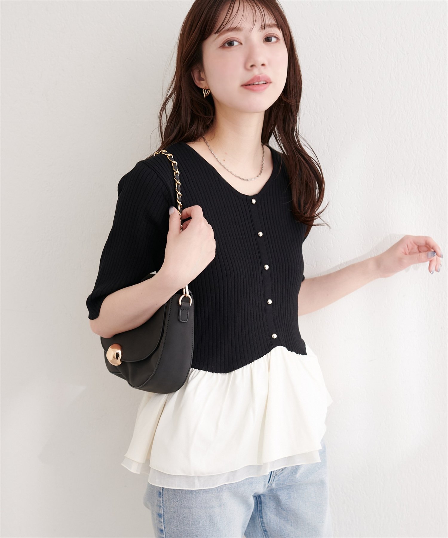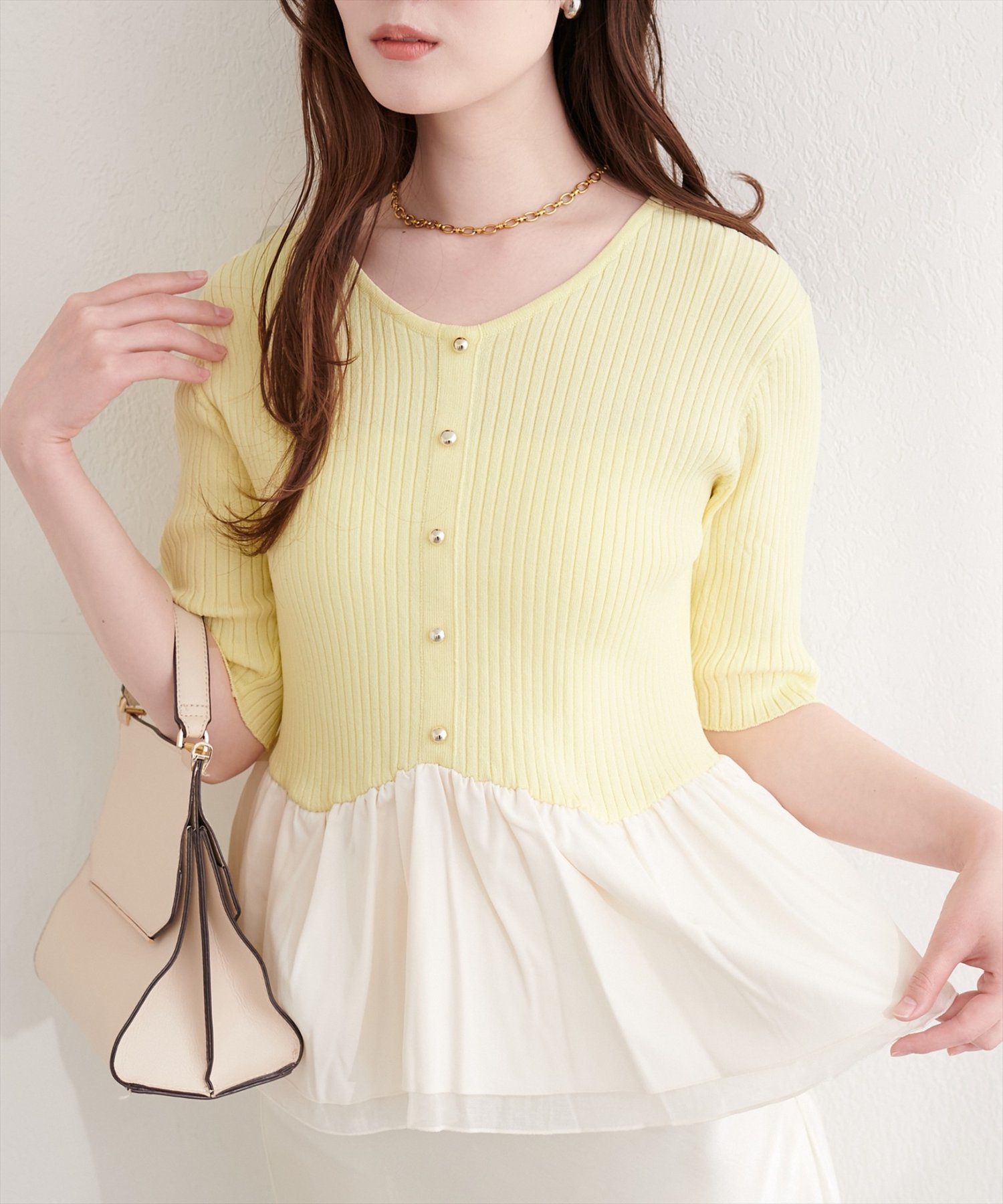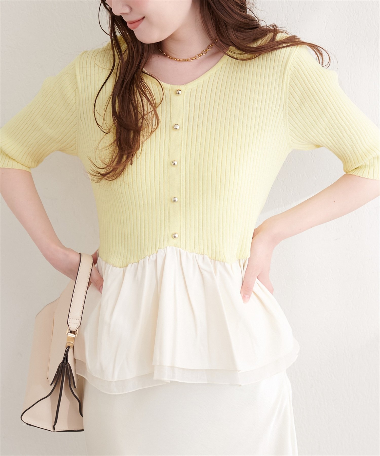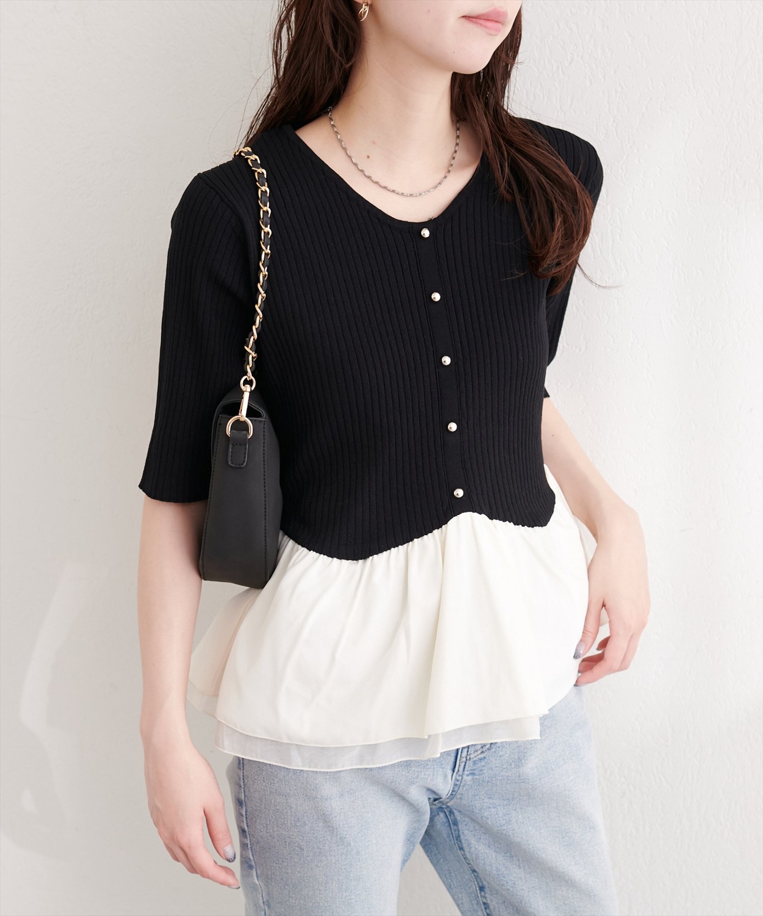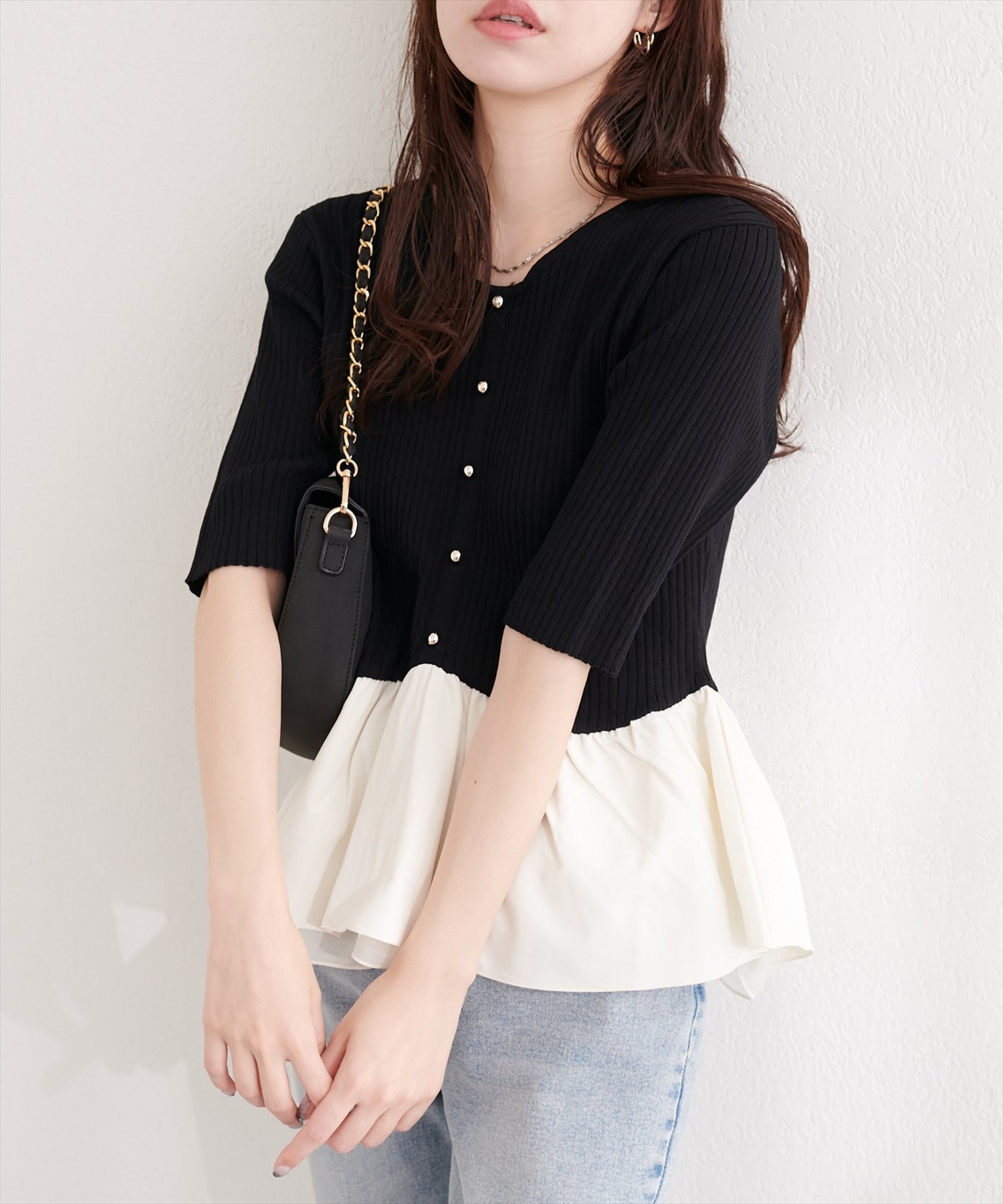 異素材ペプラムニット(0361050600)からこれからの季節でも着れる、半袖バージョンが登場しました。