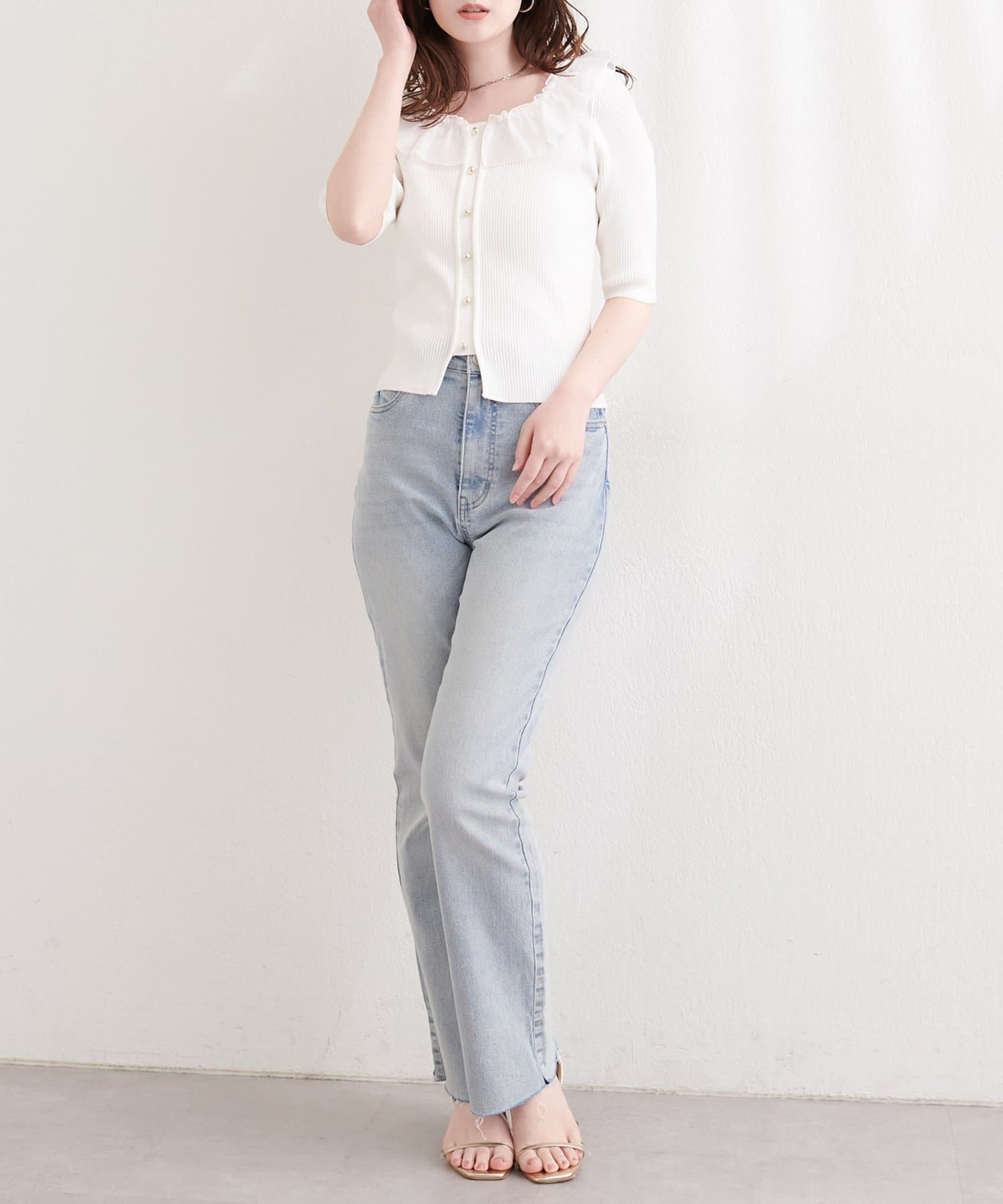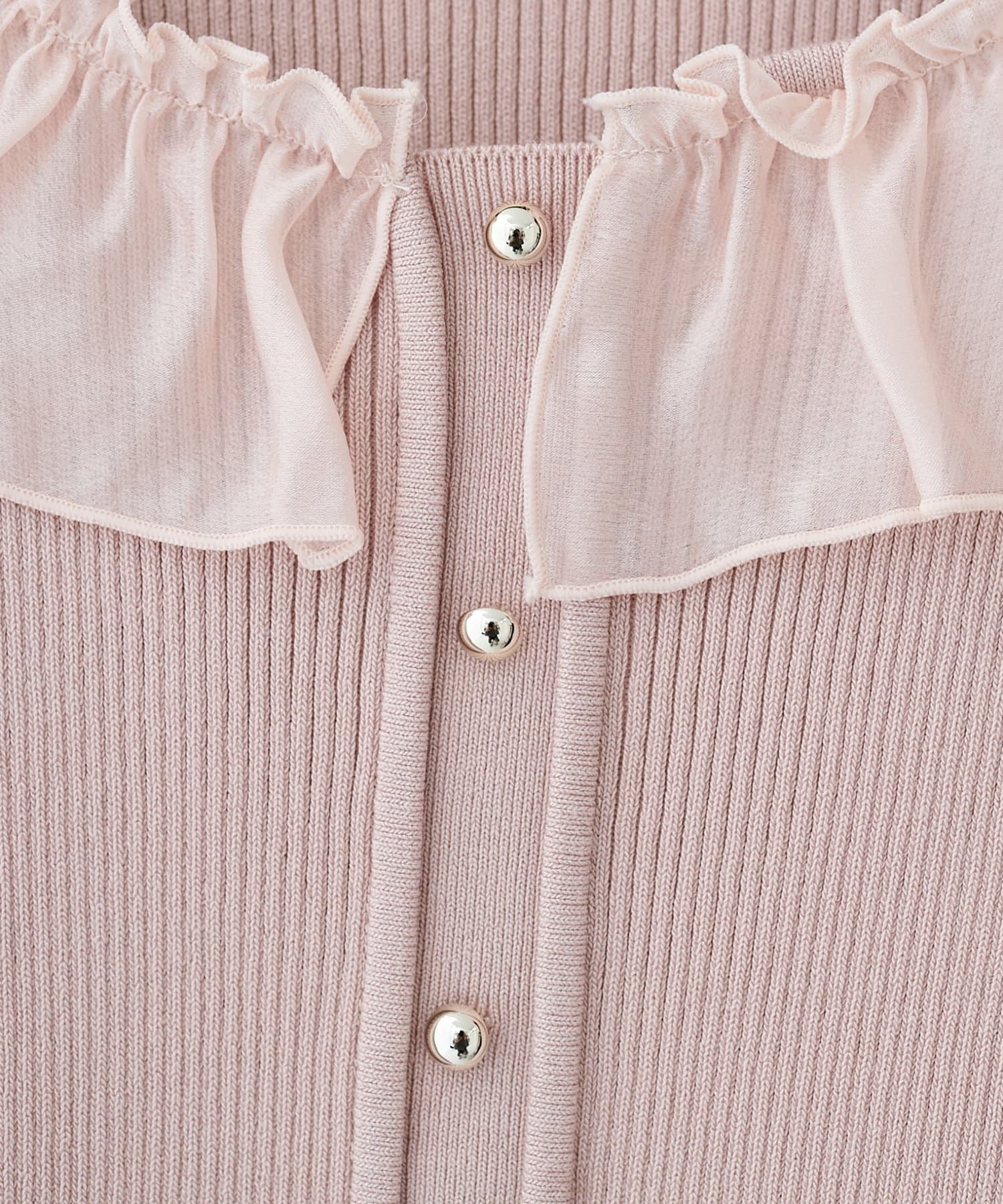 ネックラインにあしらわれたフリルが、顔周りを華やかに演出。