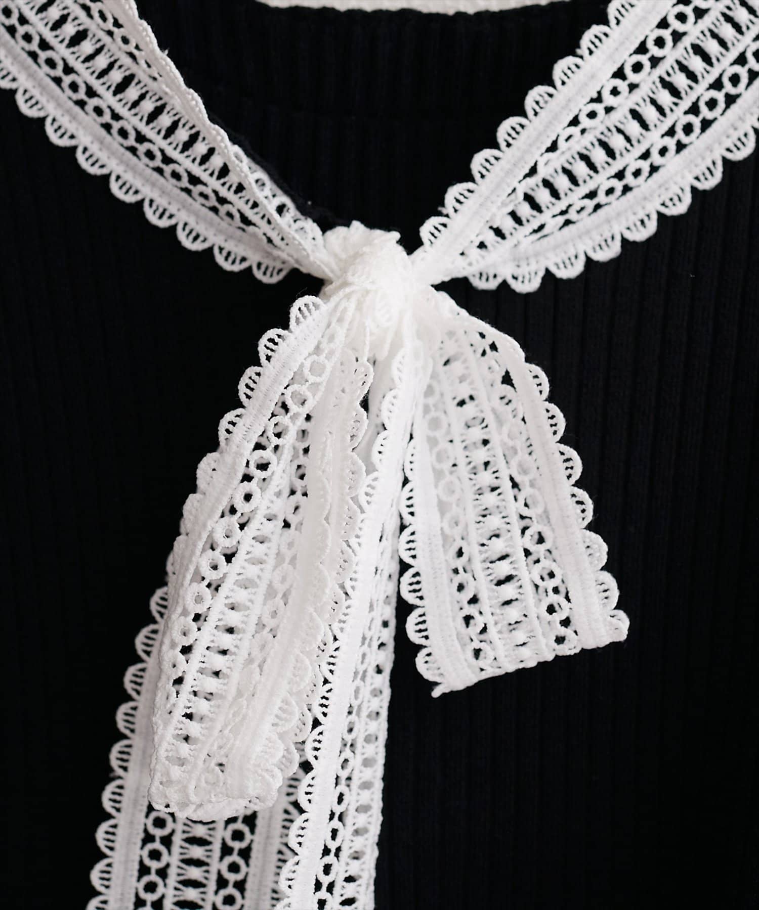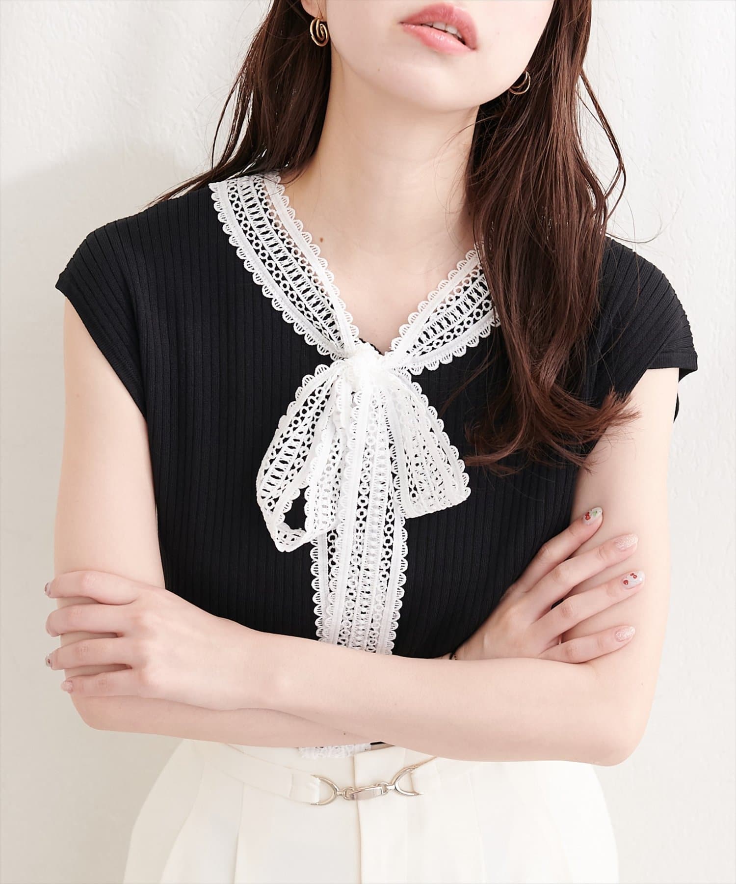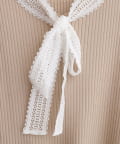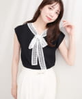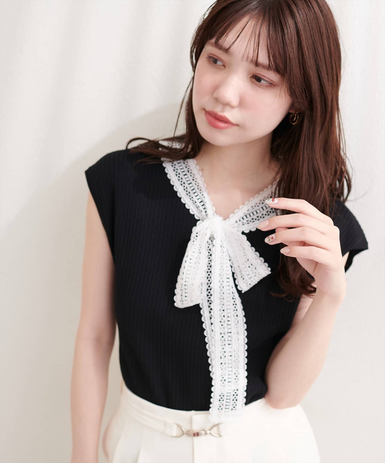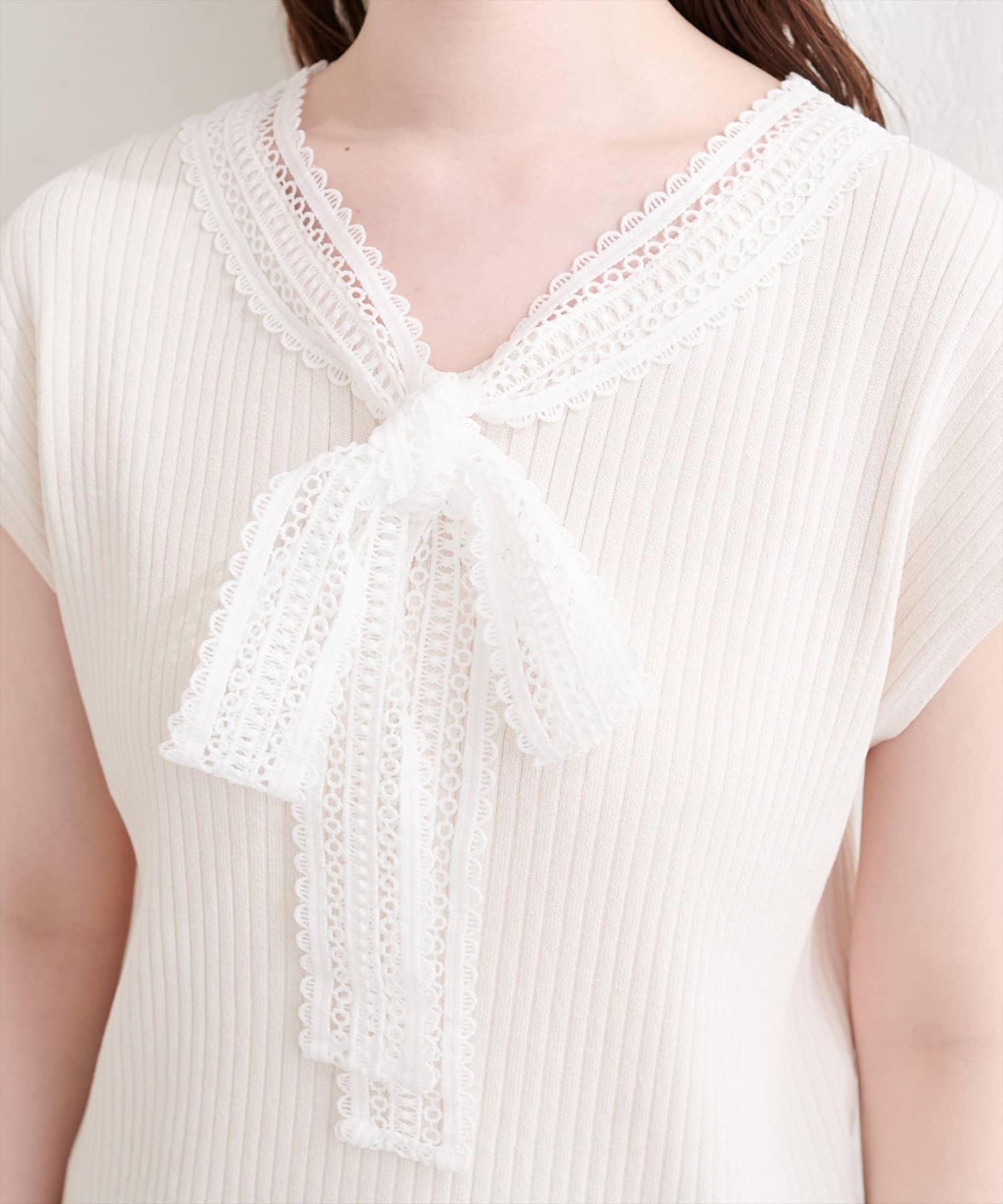 首元を飾るレースタイが、フェミニンな印象をプラス。