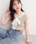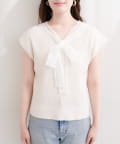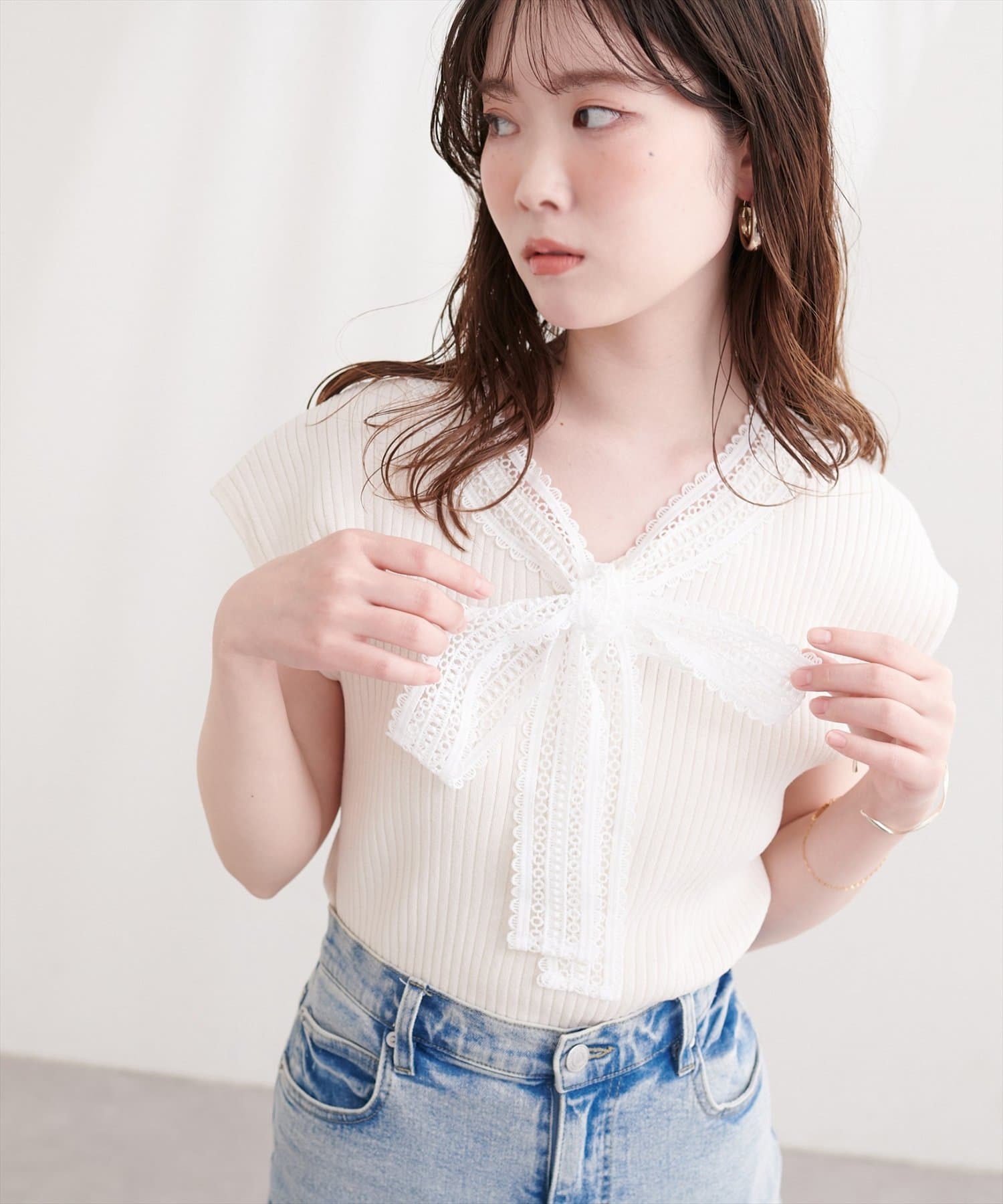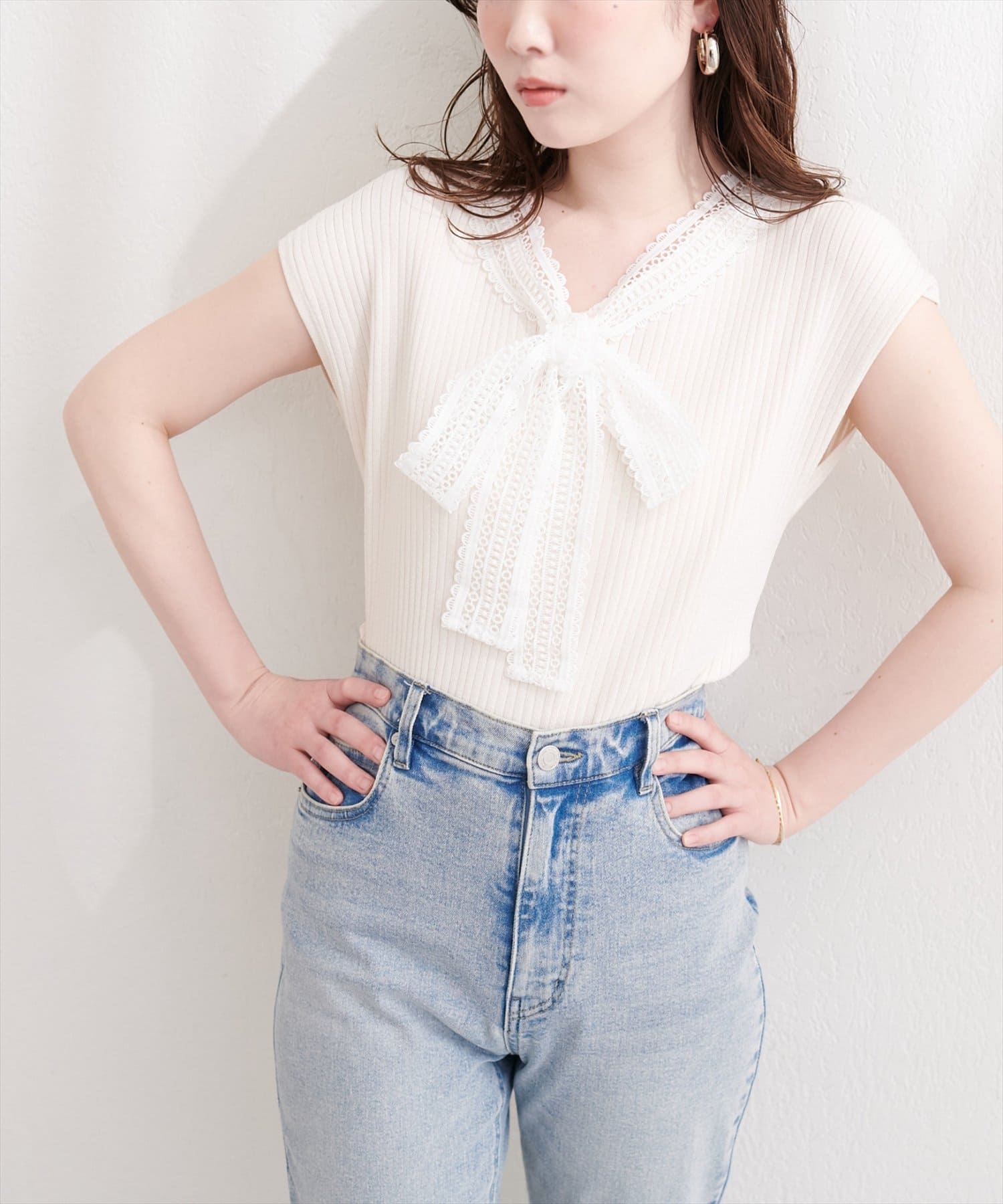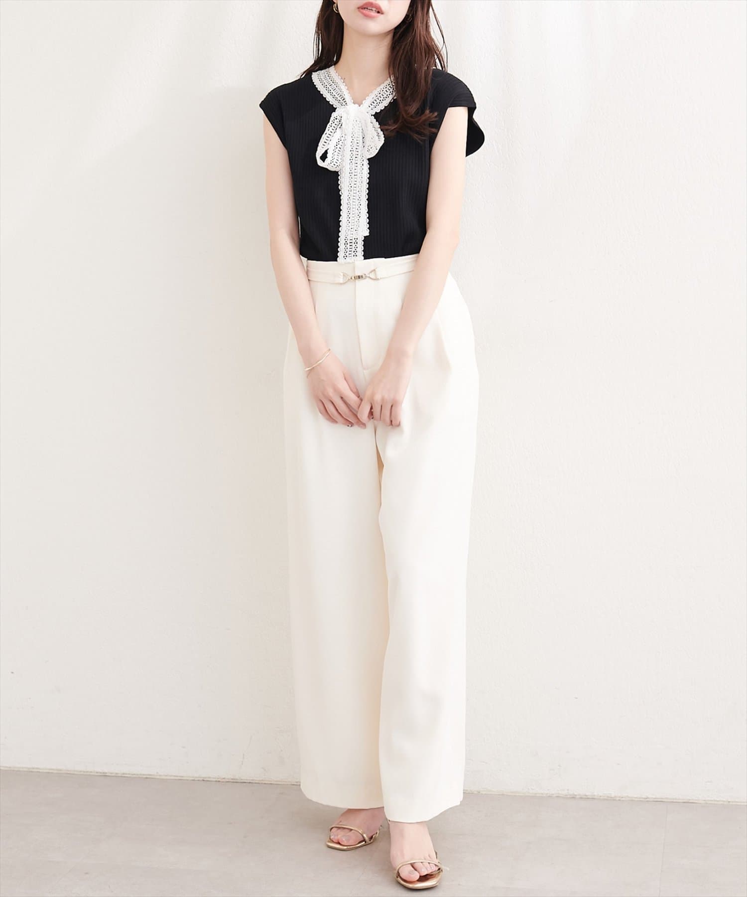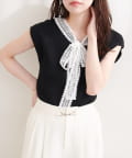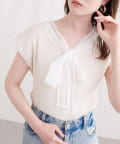 首元を飾るレースタイが、フェミニンな印象をプラス。