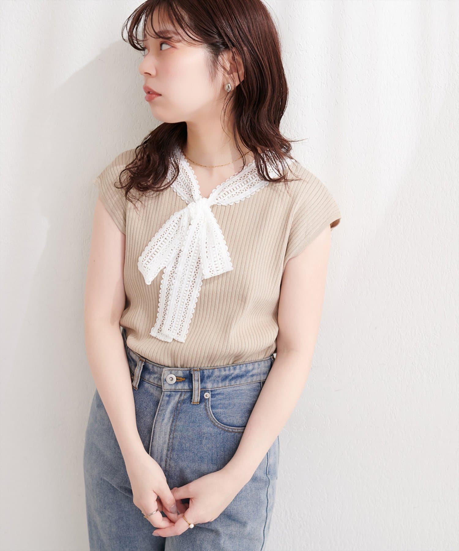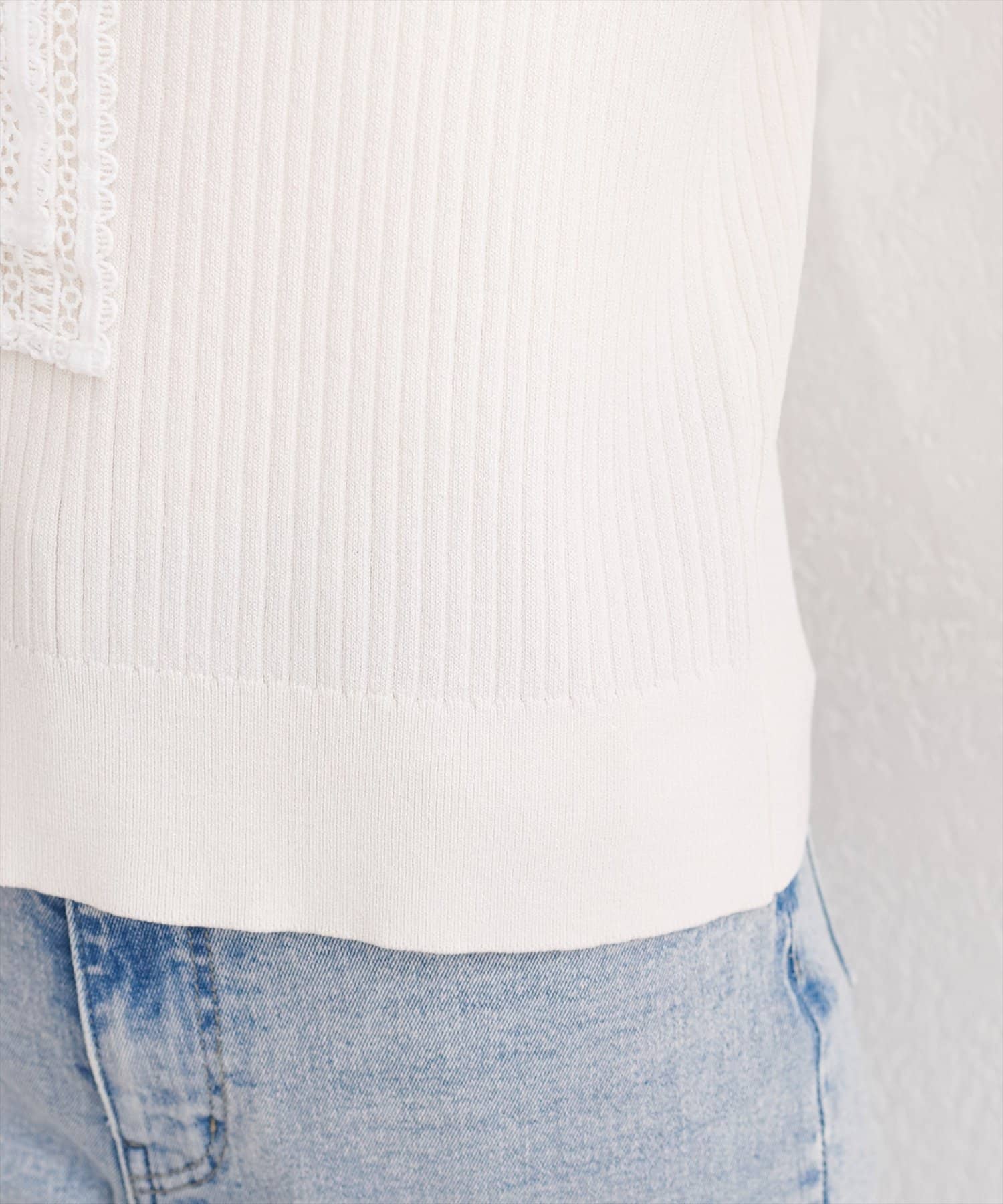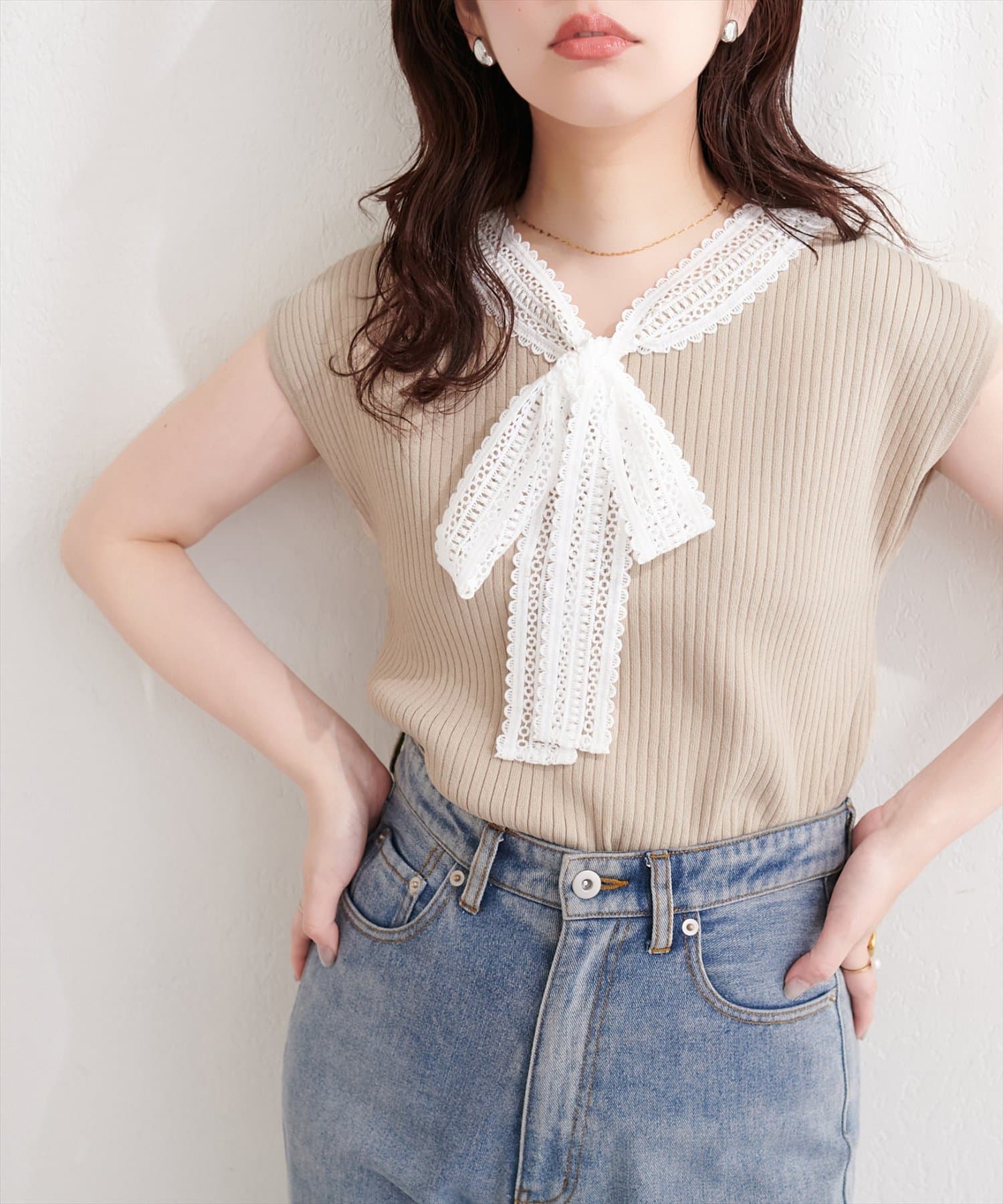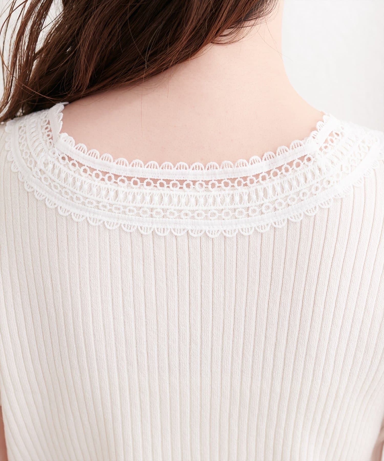シンプルなシルエットながらも、レースの存在感が際立ち、上品な着こなしを叶えます。