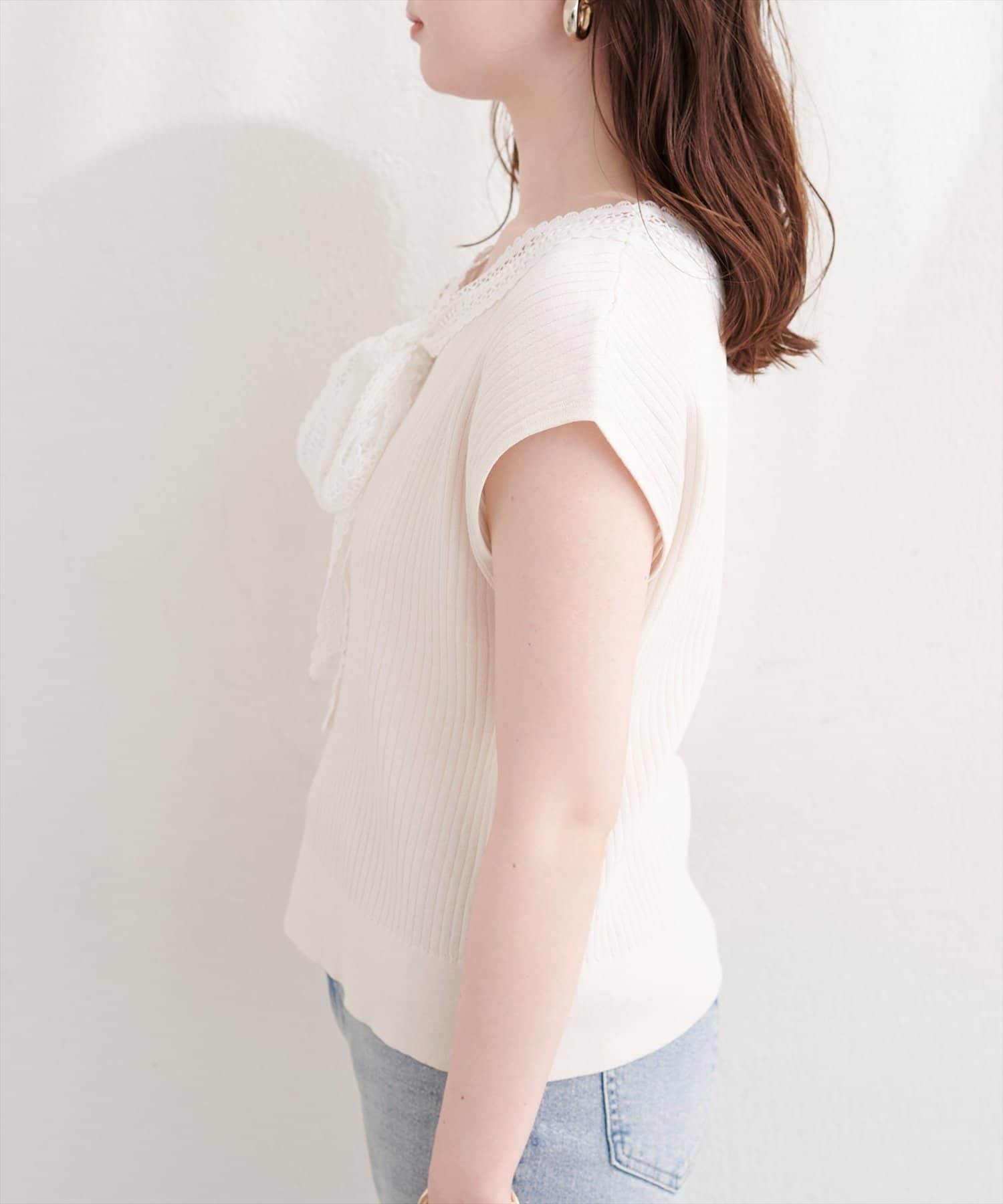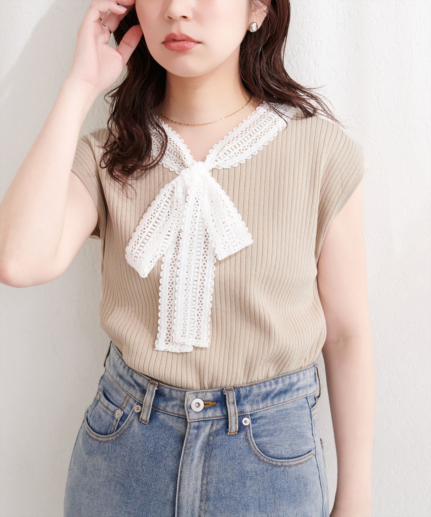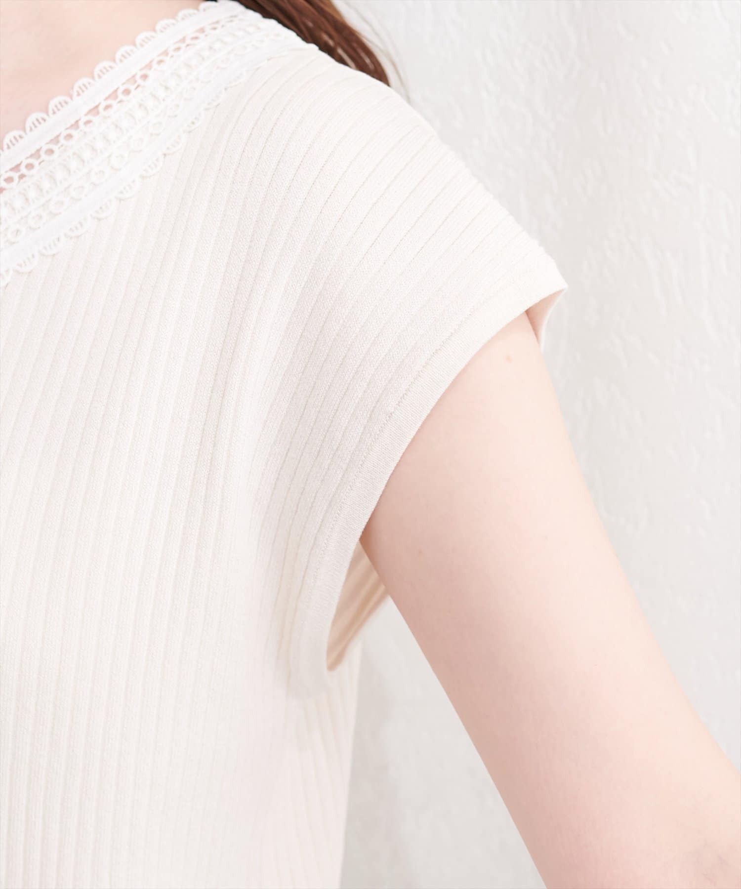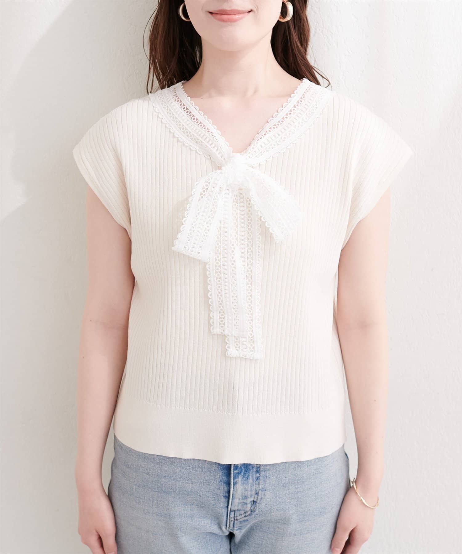 シンプルなシルエットながらも、レースの存在感が際立ち、上品な着こなしを叶えます。
