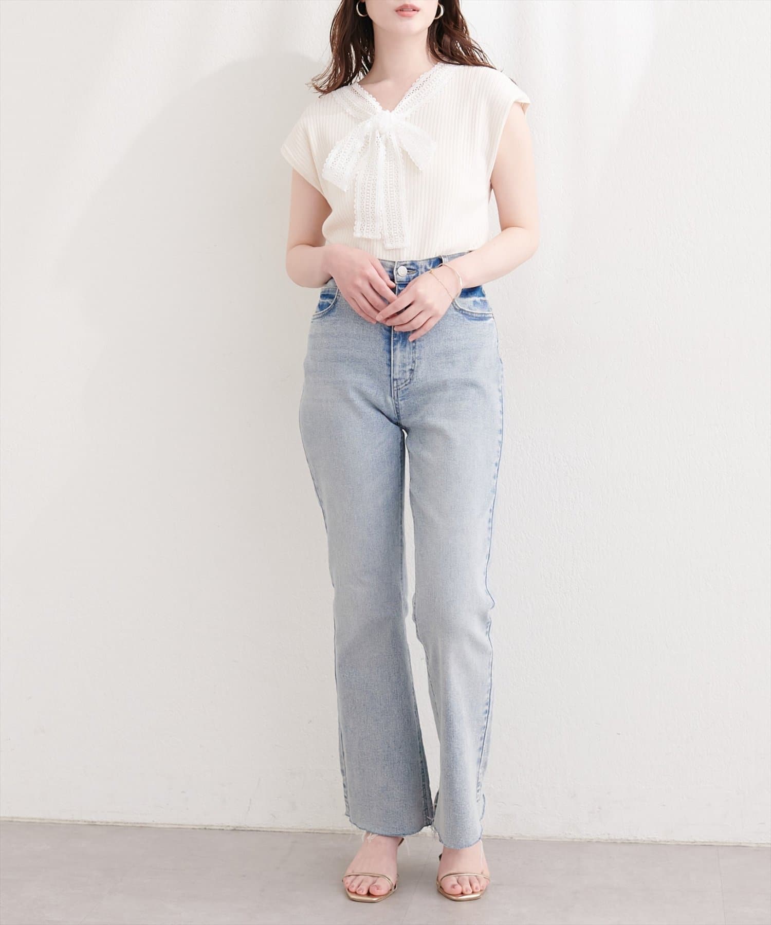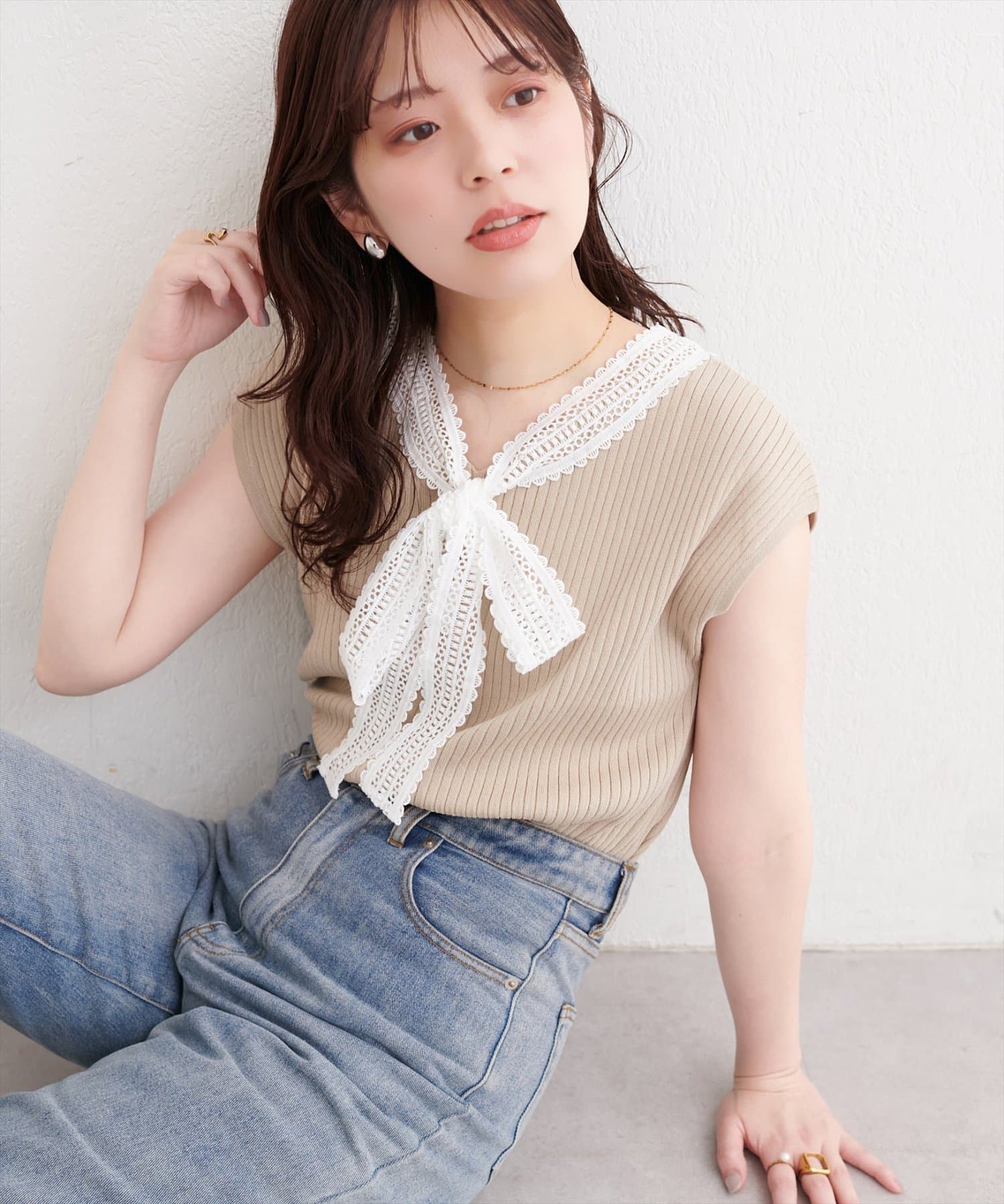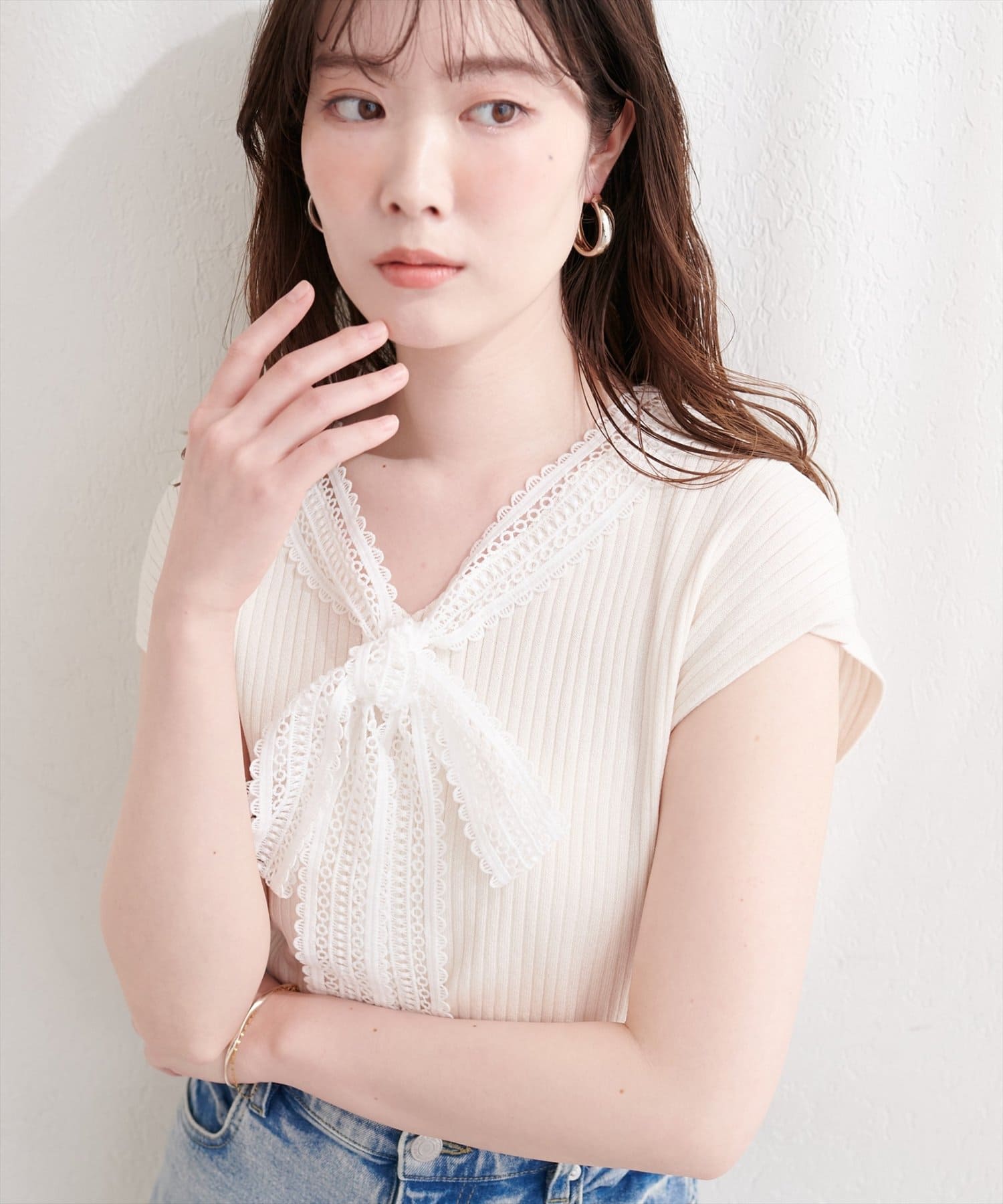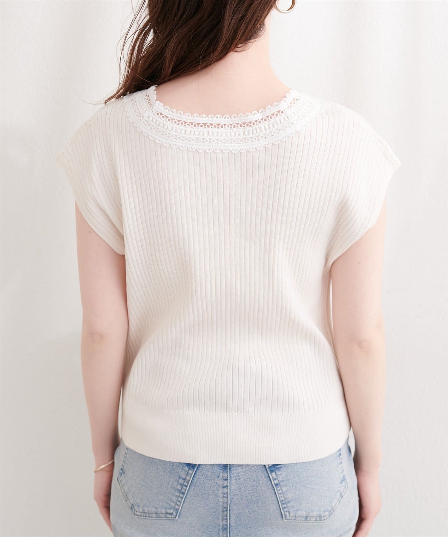 シンプルなシルエットながらも、レースの存在感が際立ち、上品な着こなしを叶えます。