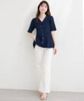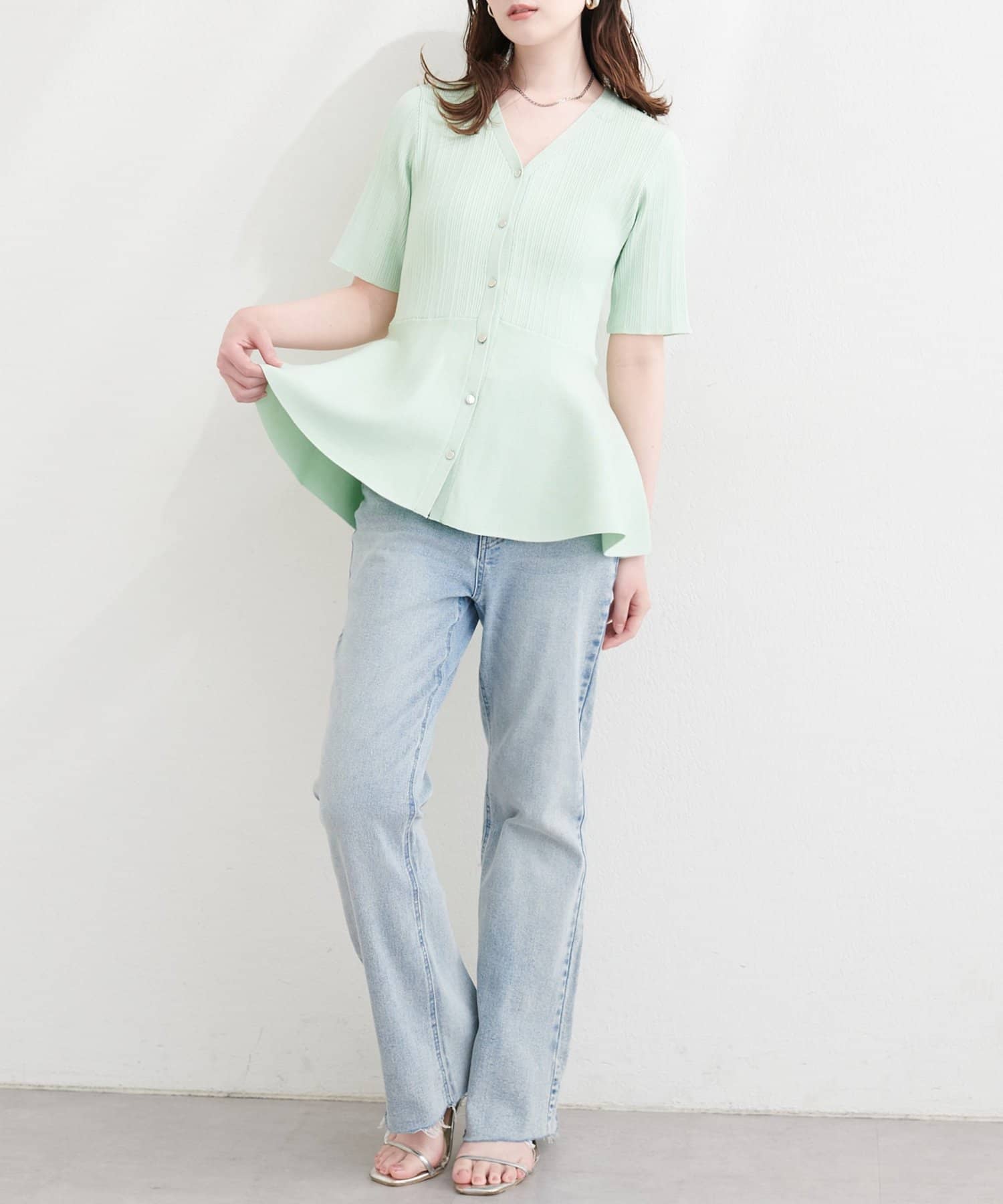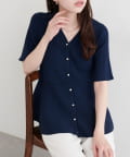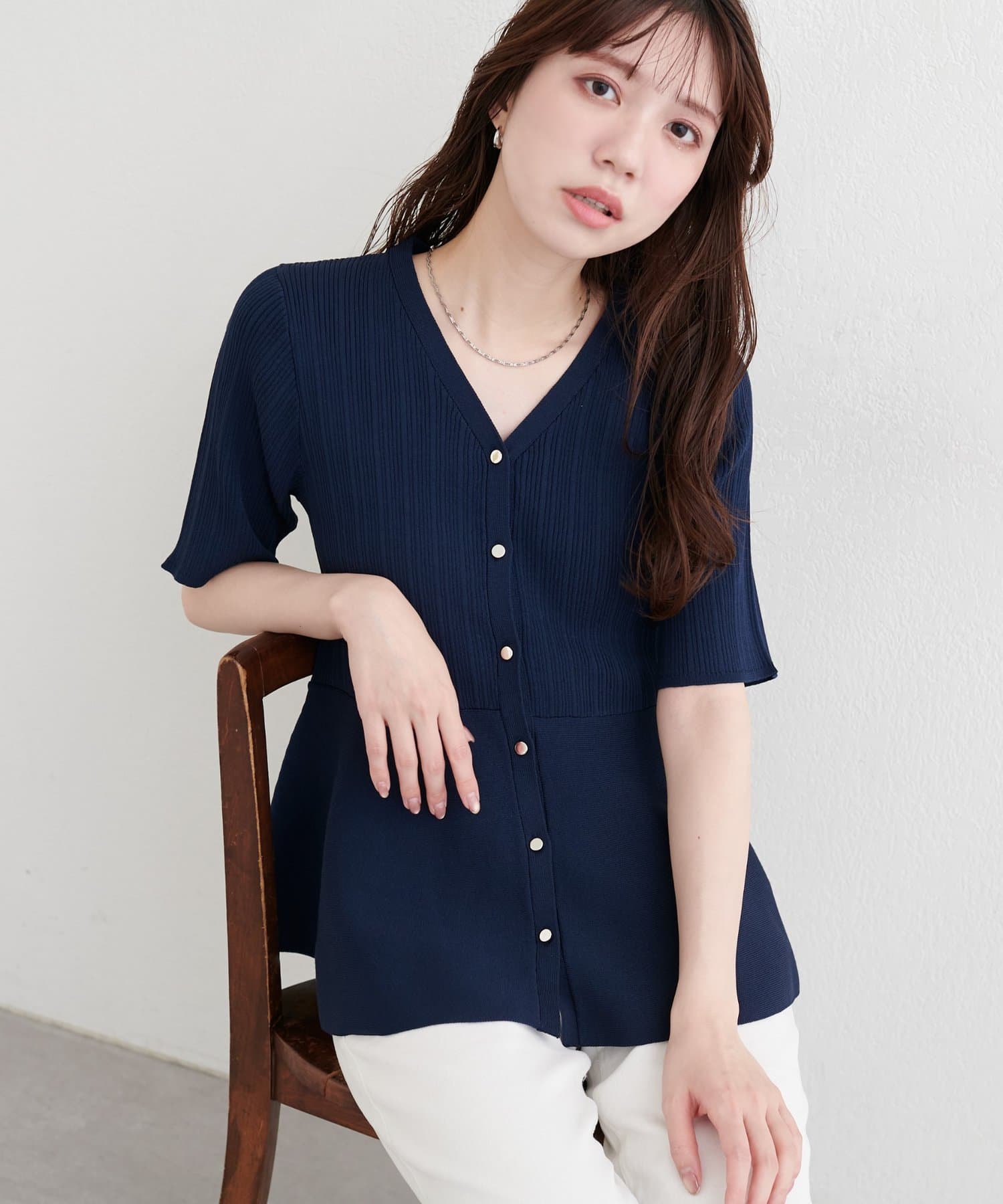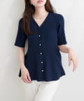 Vネックのデザインがデコルテを美しく見せ、顔まわりを明るくすっきりと演出します。