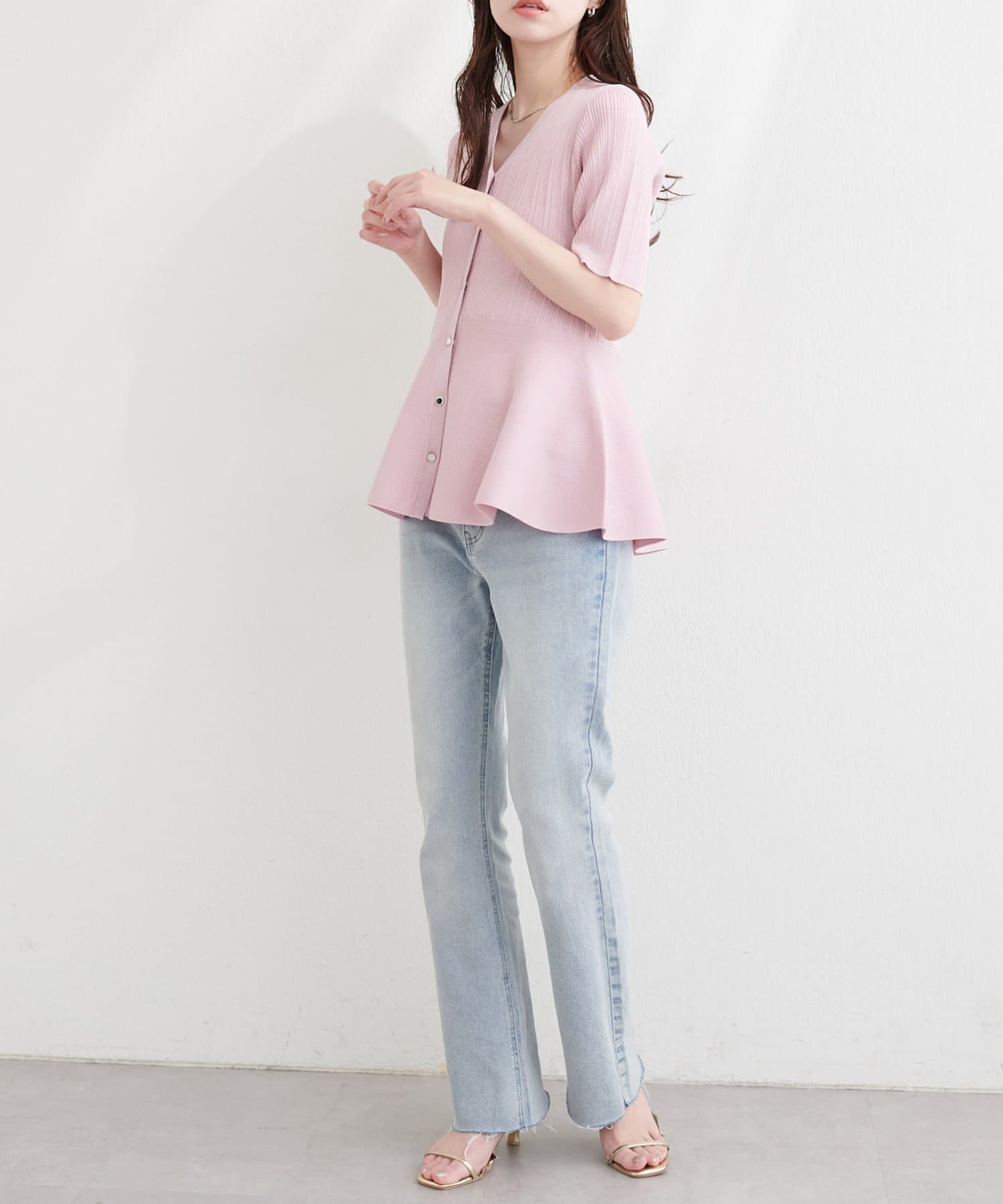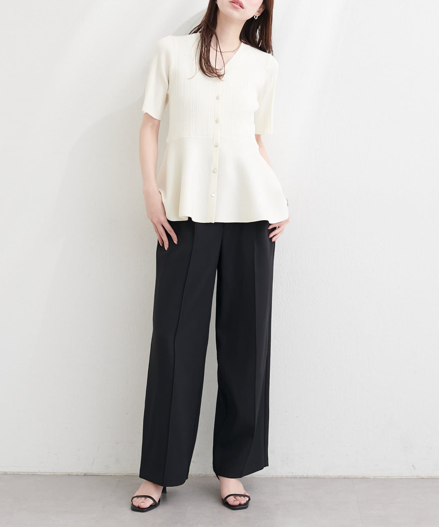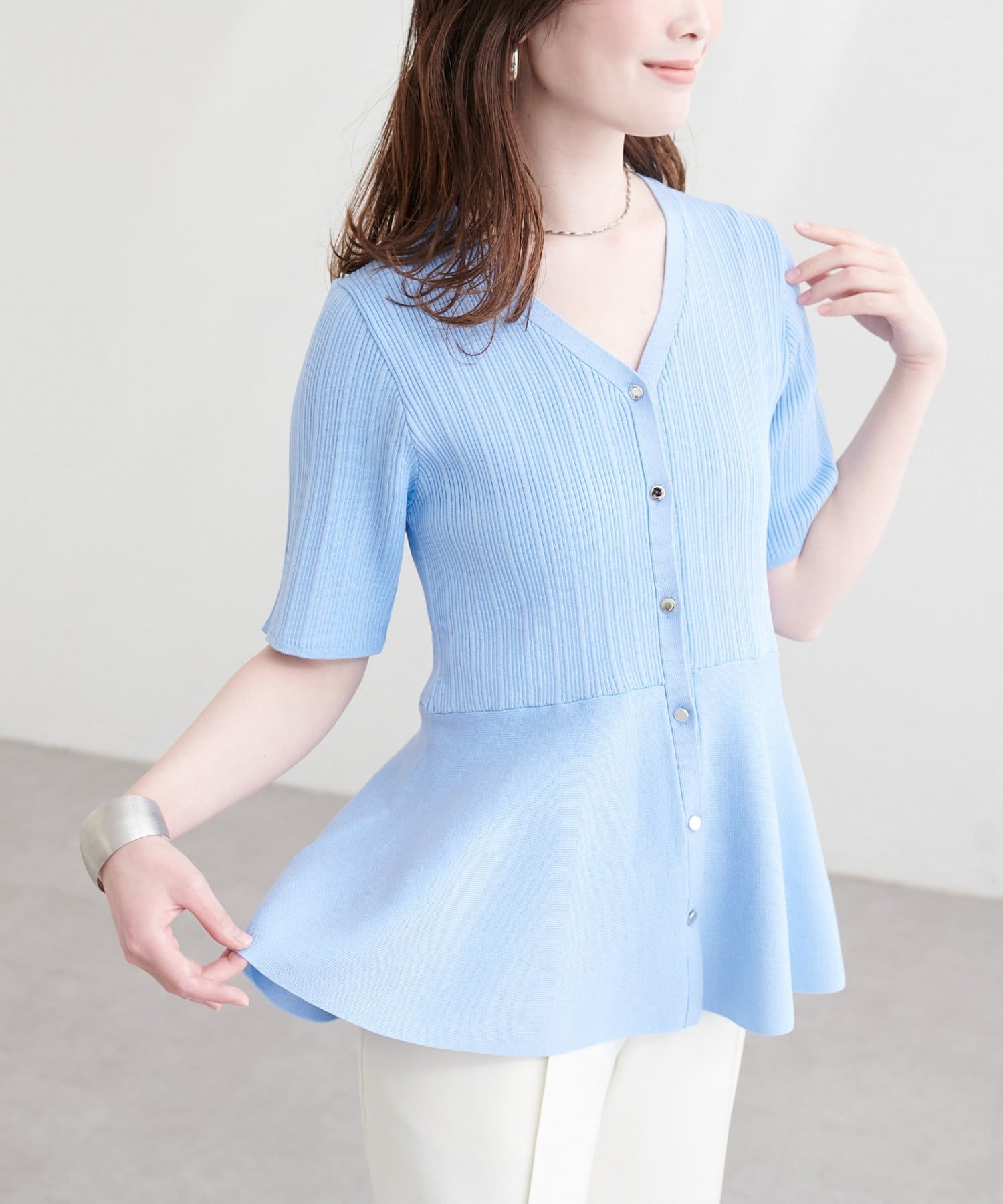 ウエストから広がるペプラムデザインは、女性らしいくびれを演出し、優雅な雰囲気をプラス。