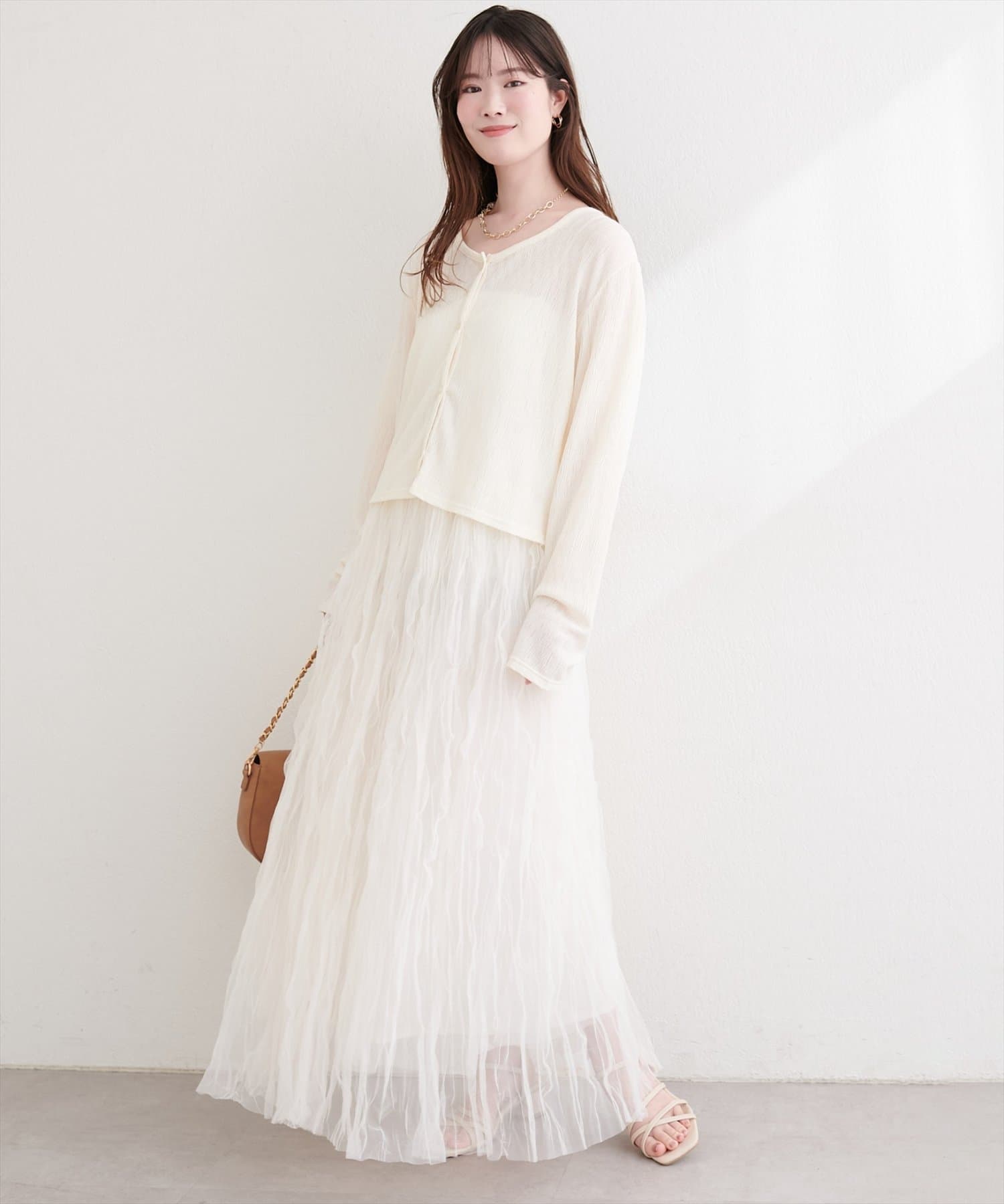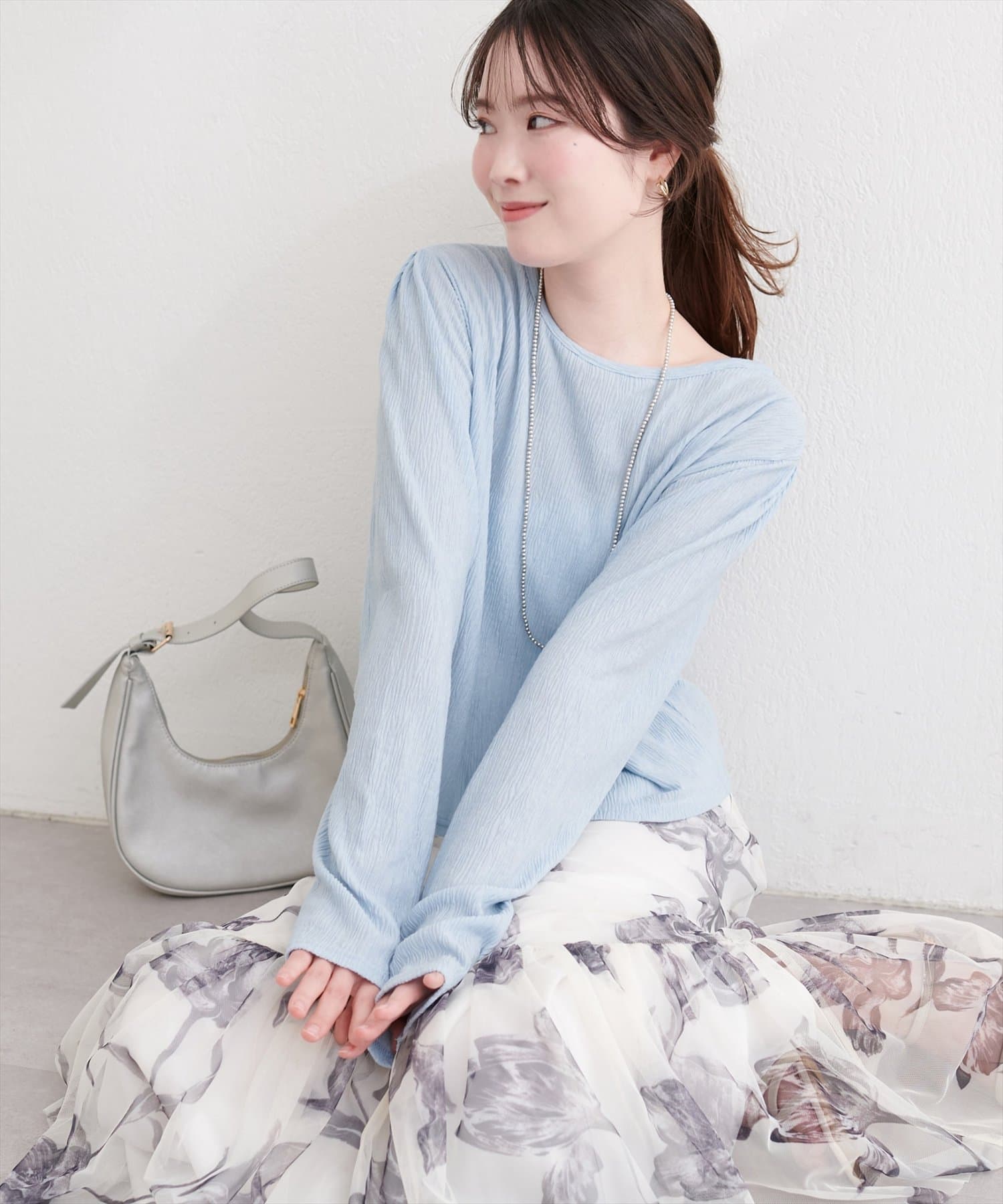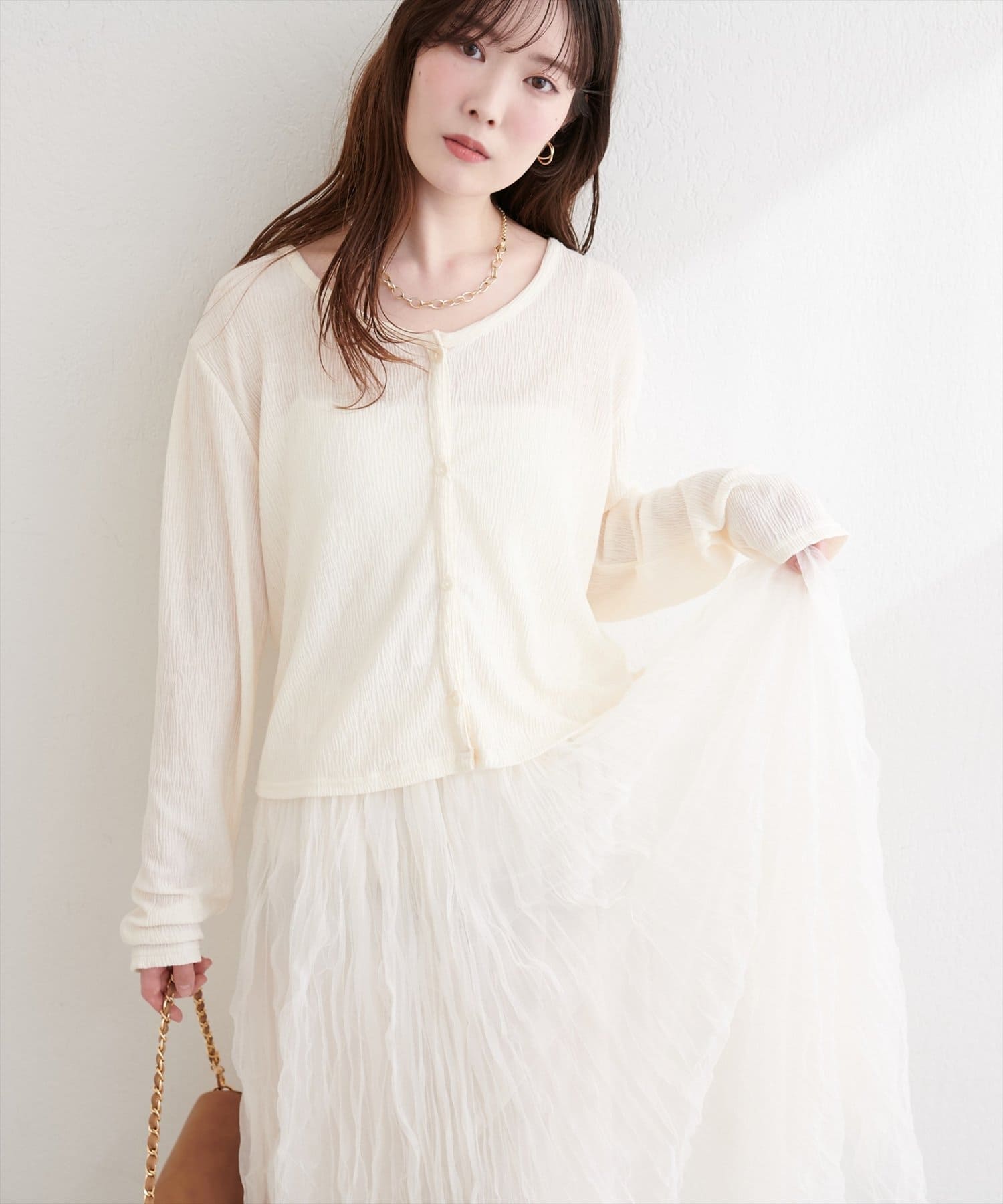 シアーインナーとレイヤードして、クレープ素材の表情を引き立てるスタイリングもおすすめです。