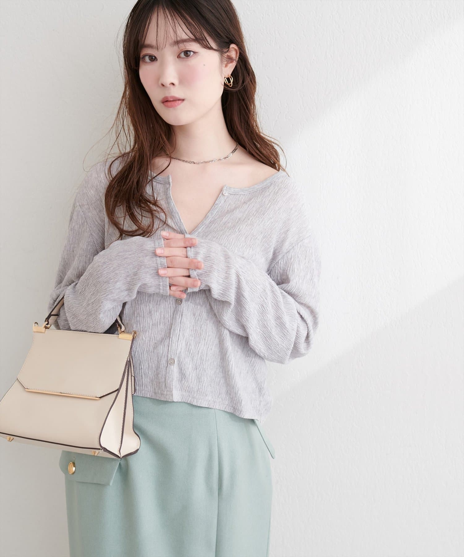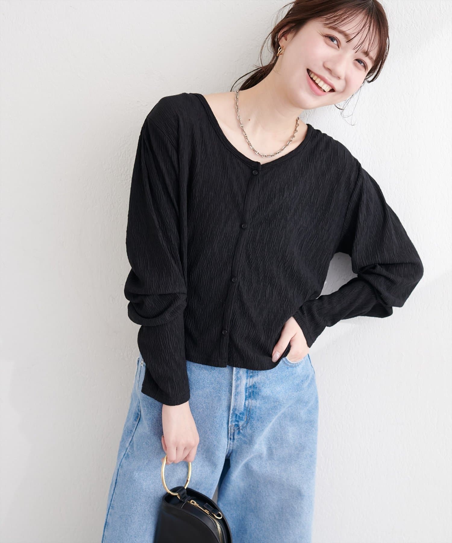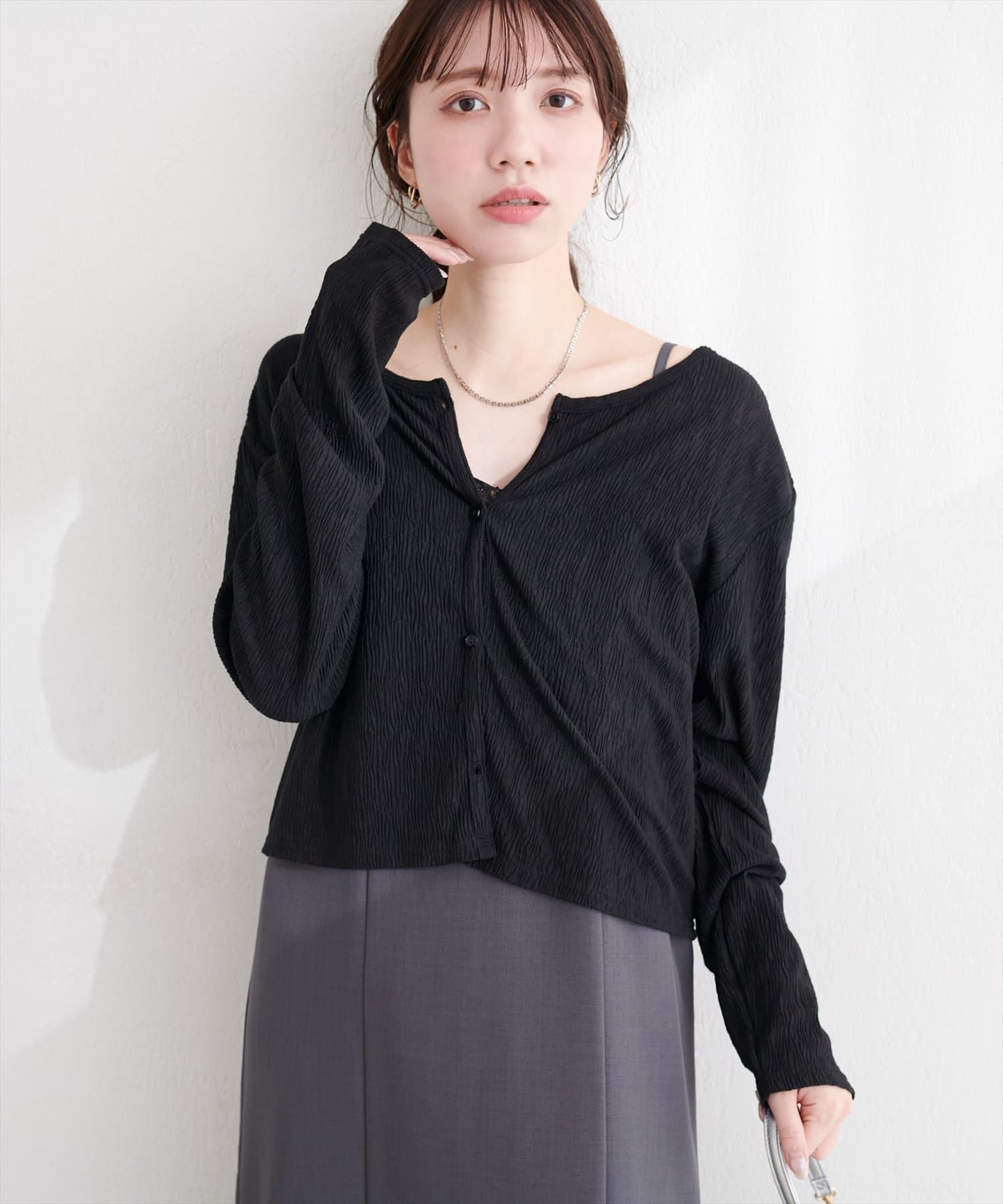 表面感のあるランダムクレープ素材が、シンプルながらも印象的な前後2WAYアイテム。