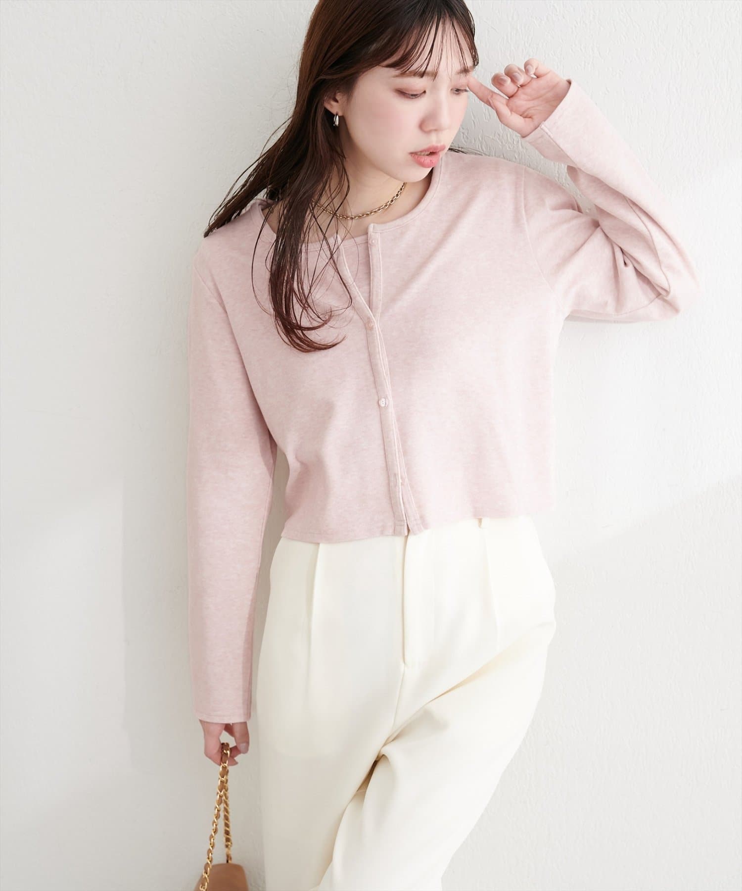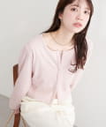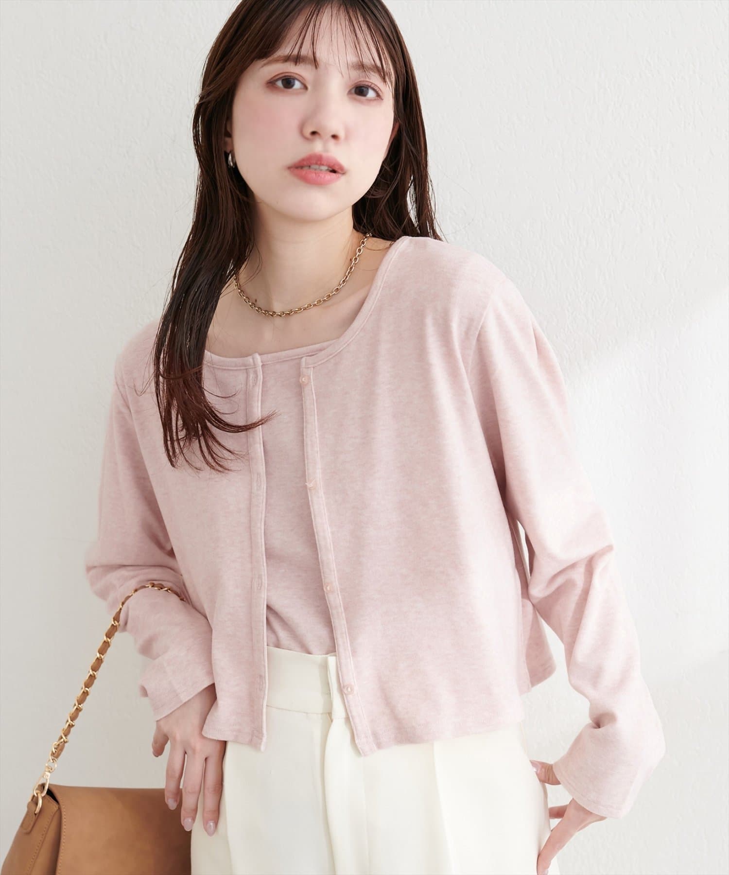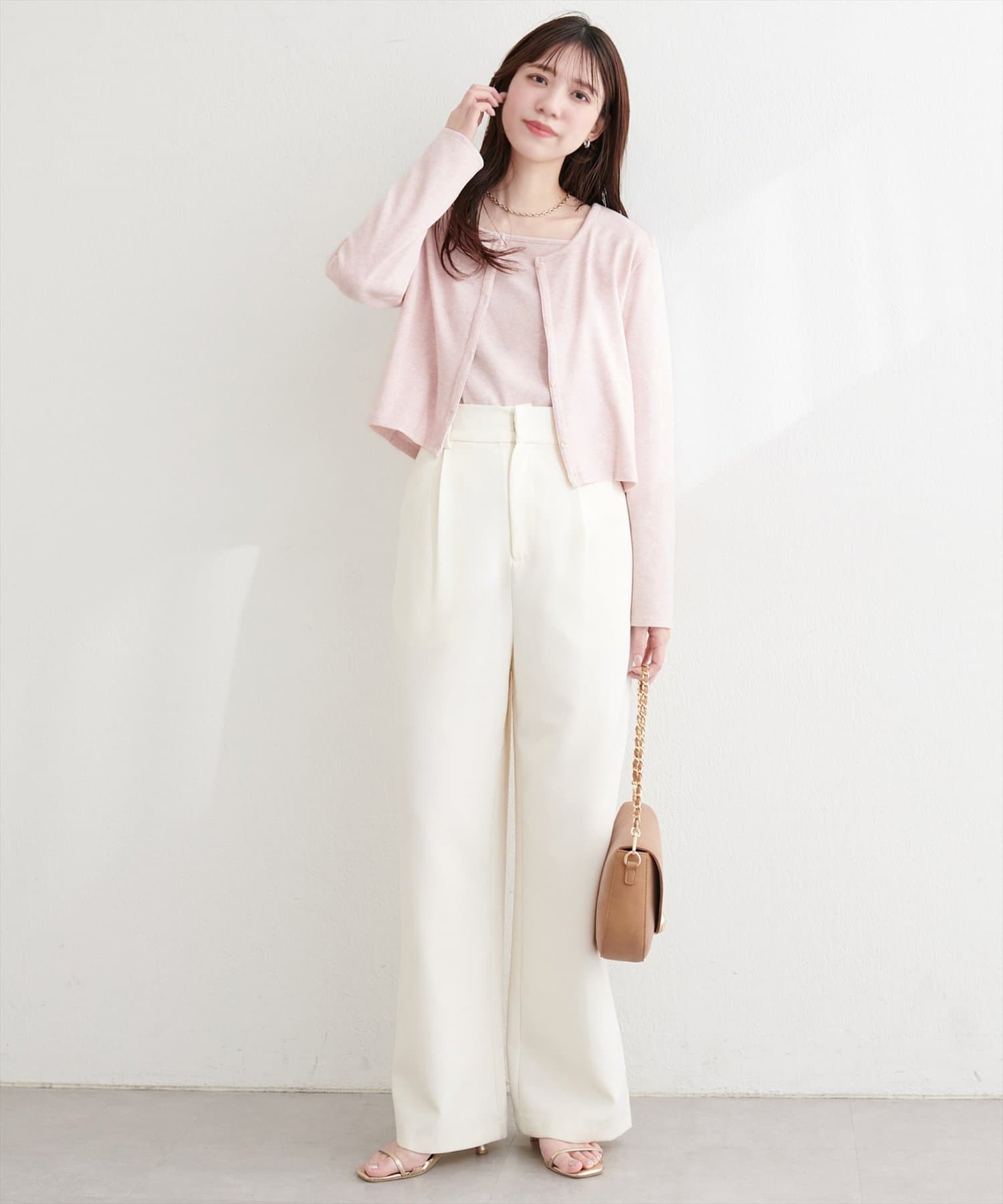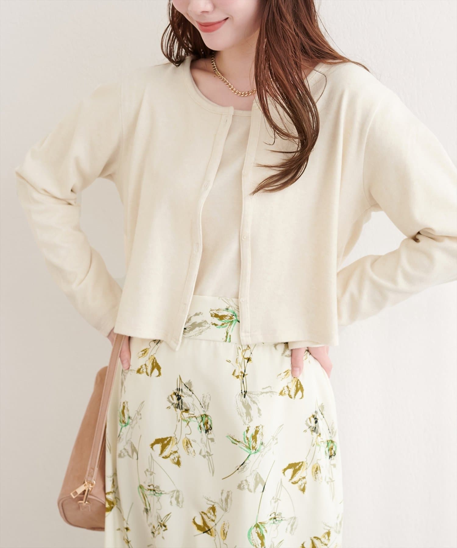 またカーディガンの色味を拾って、小物でアクセントを加えると、よりおしゃれな印象になります。