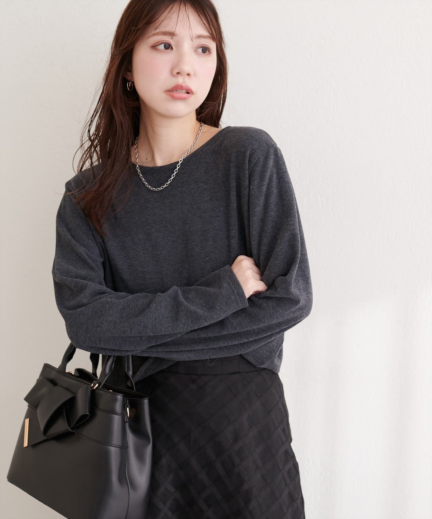 今の季節には、タートルネックニットやブラウスの上から羽織るのがおすすめです。