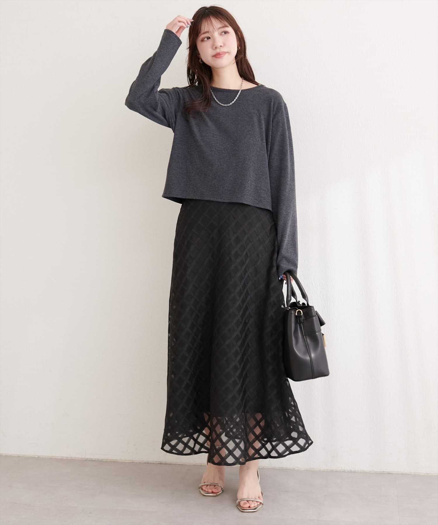 ボトムスは、タイトスカートやスキニーパンツを合わせて、すっきりとしたシルエットにまとめるとバランスが取れます。
