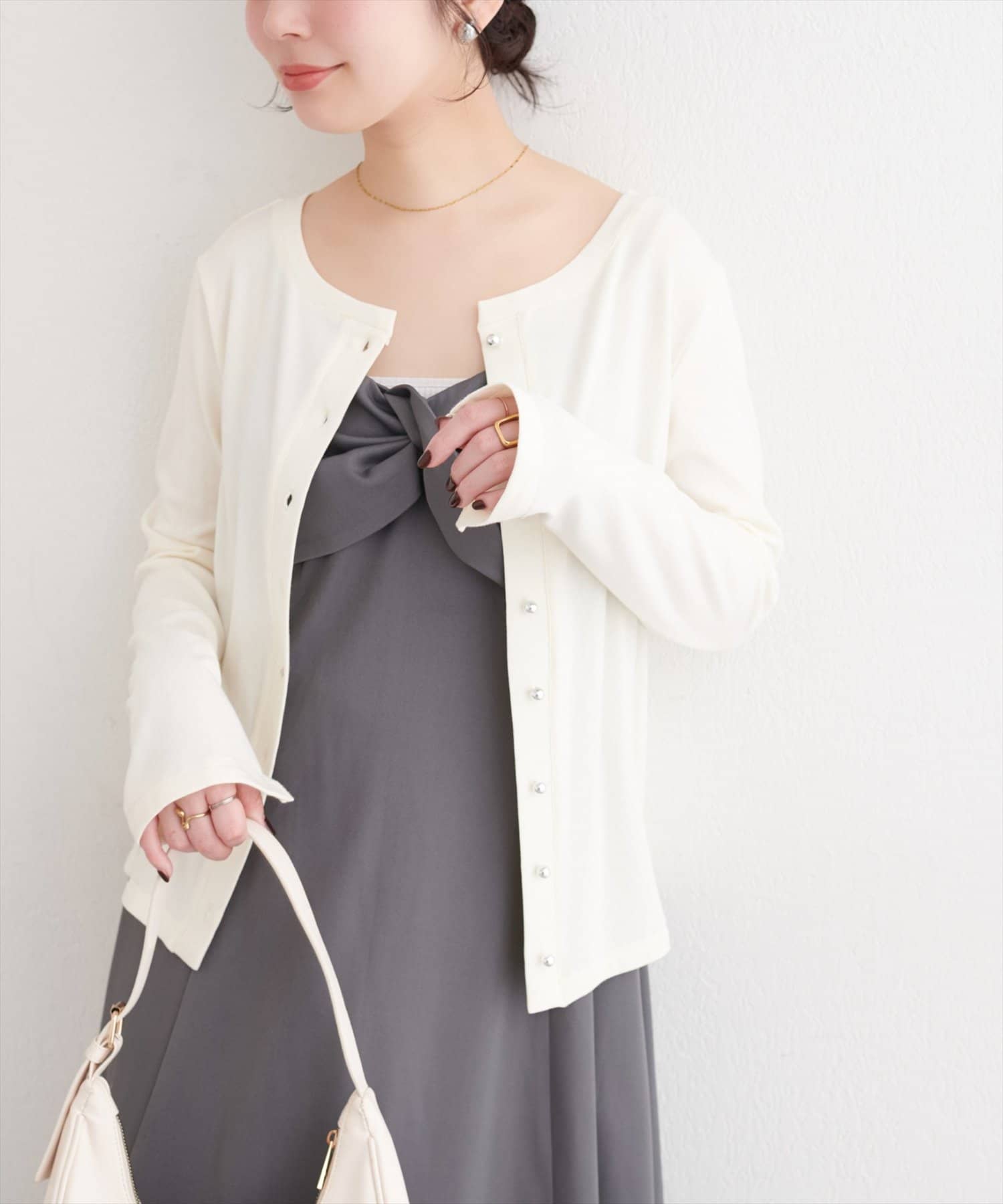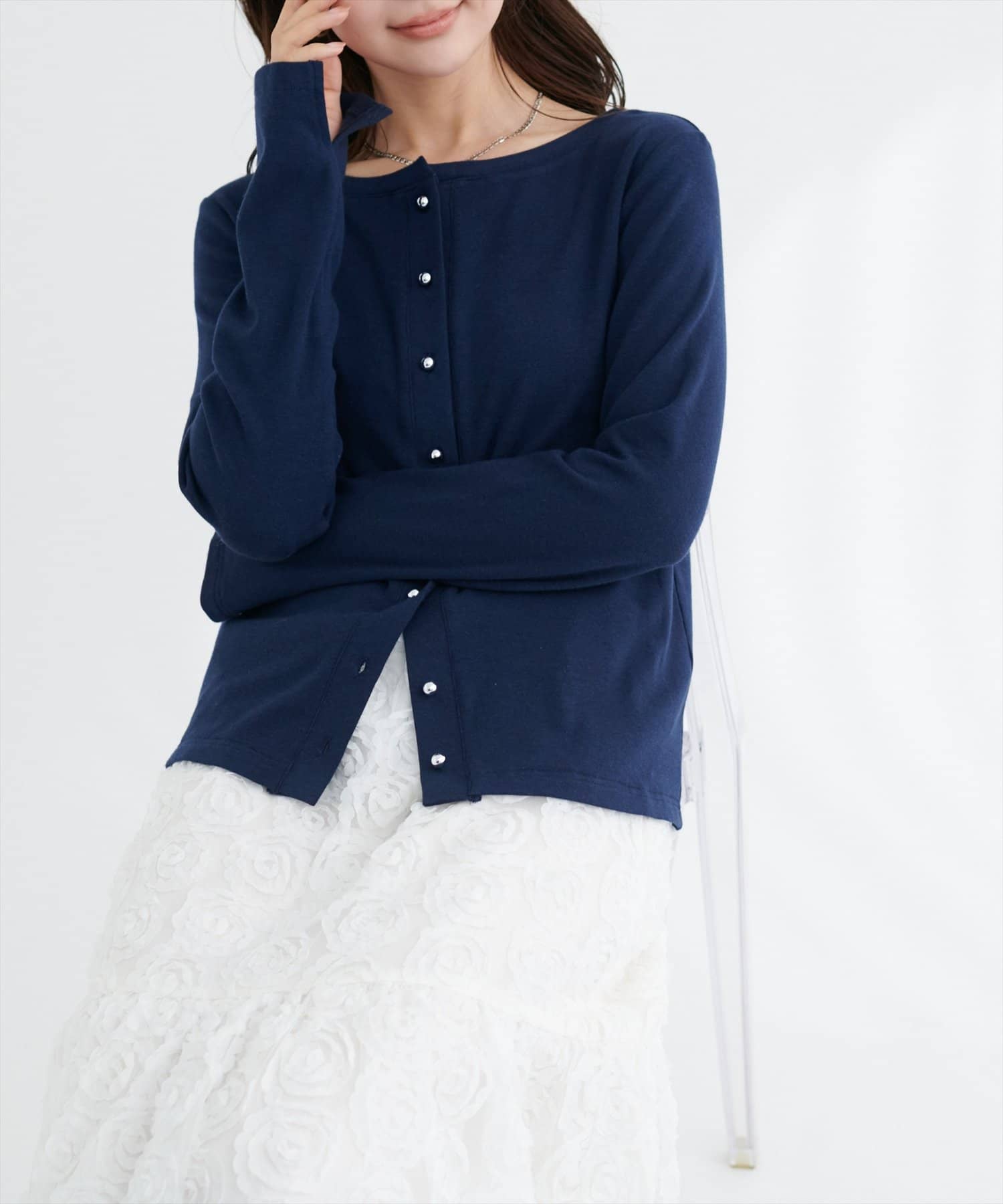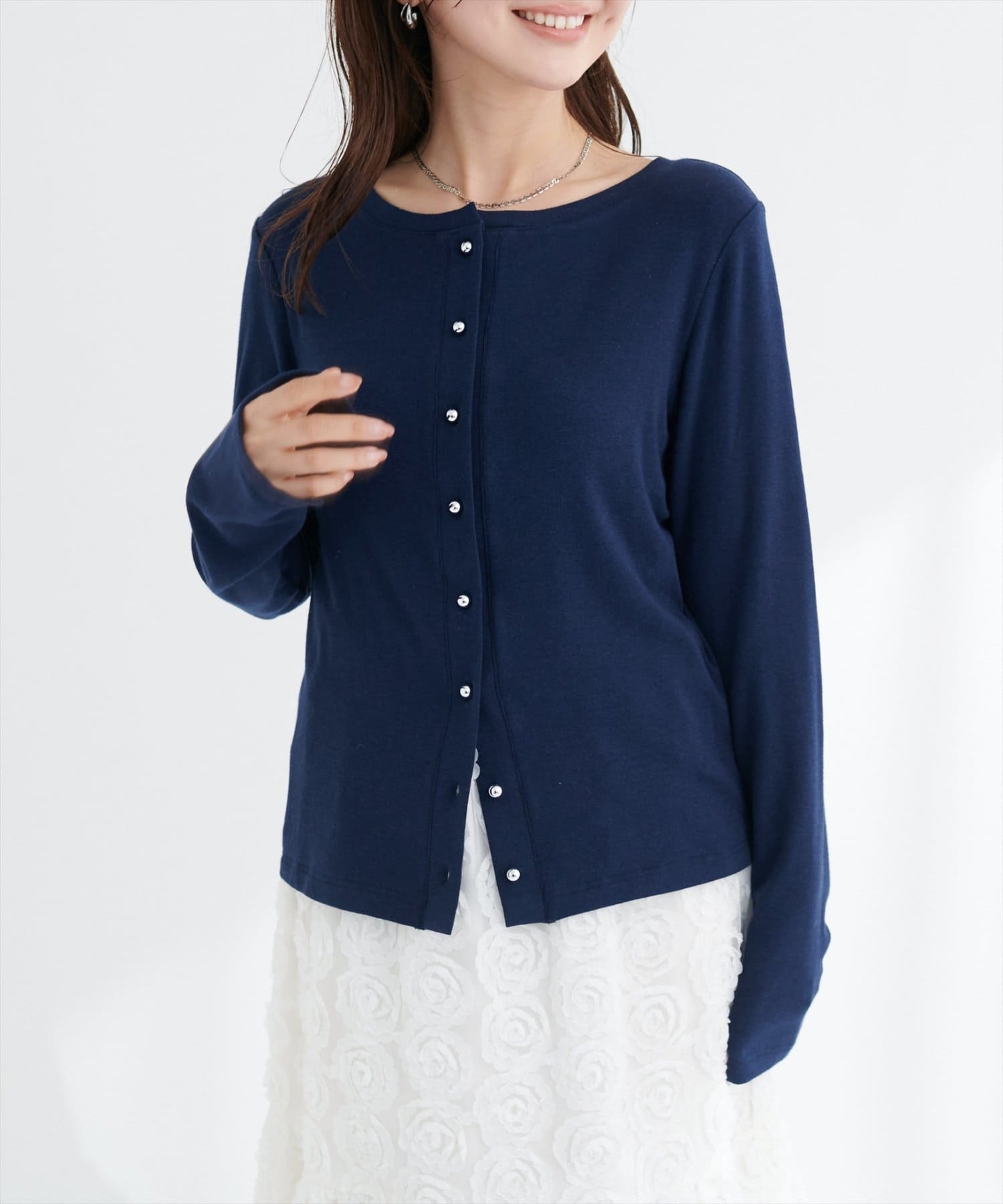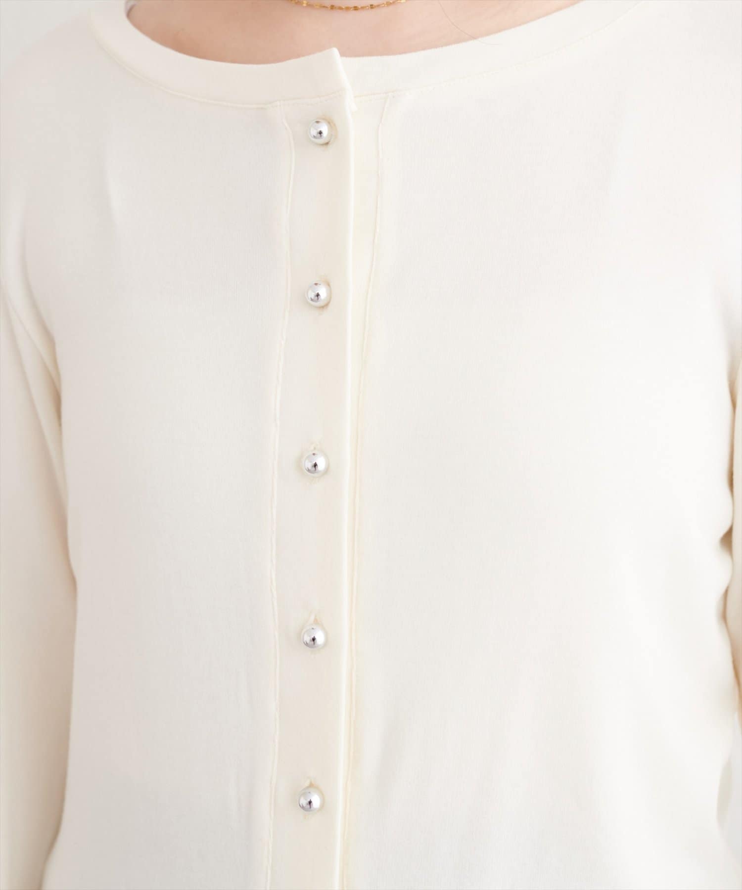 フロントに並んだシルバーボタンが、さりげないアクセントとなり、シンプルなデザインに華やかさを添えます。