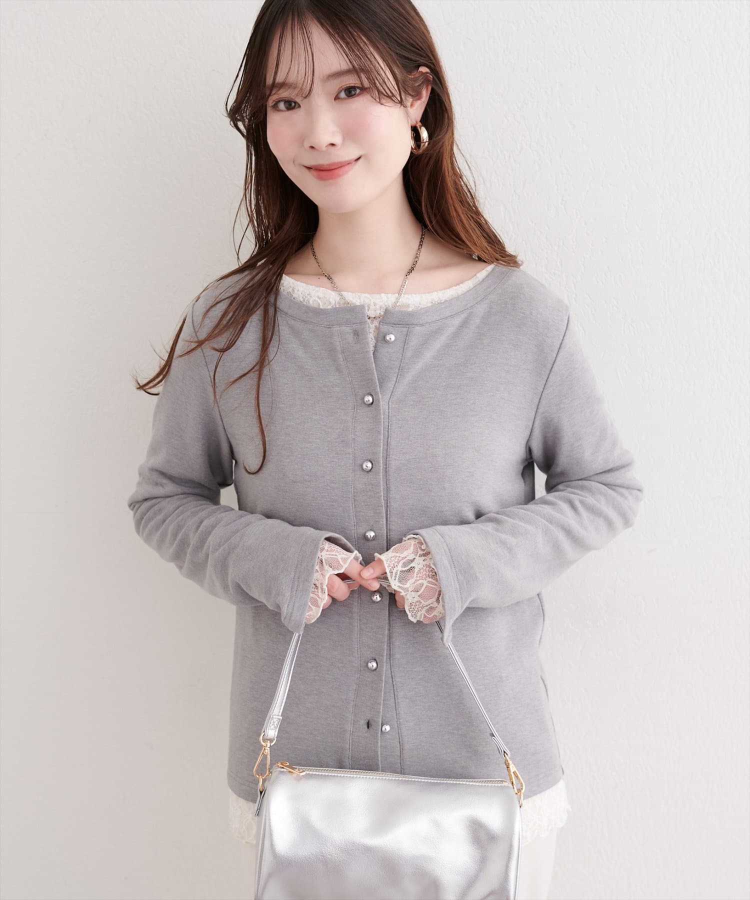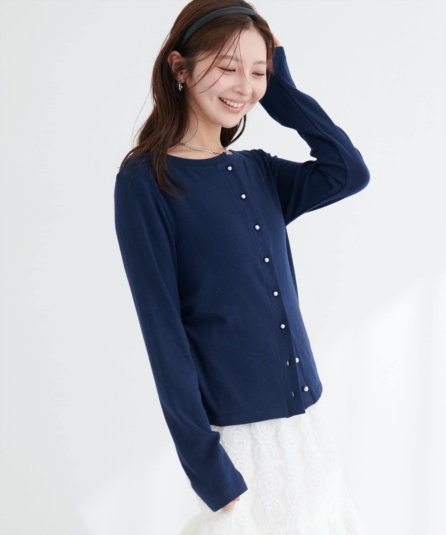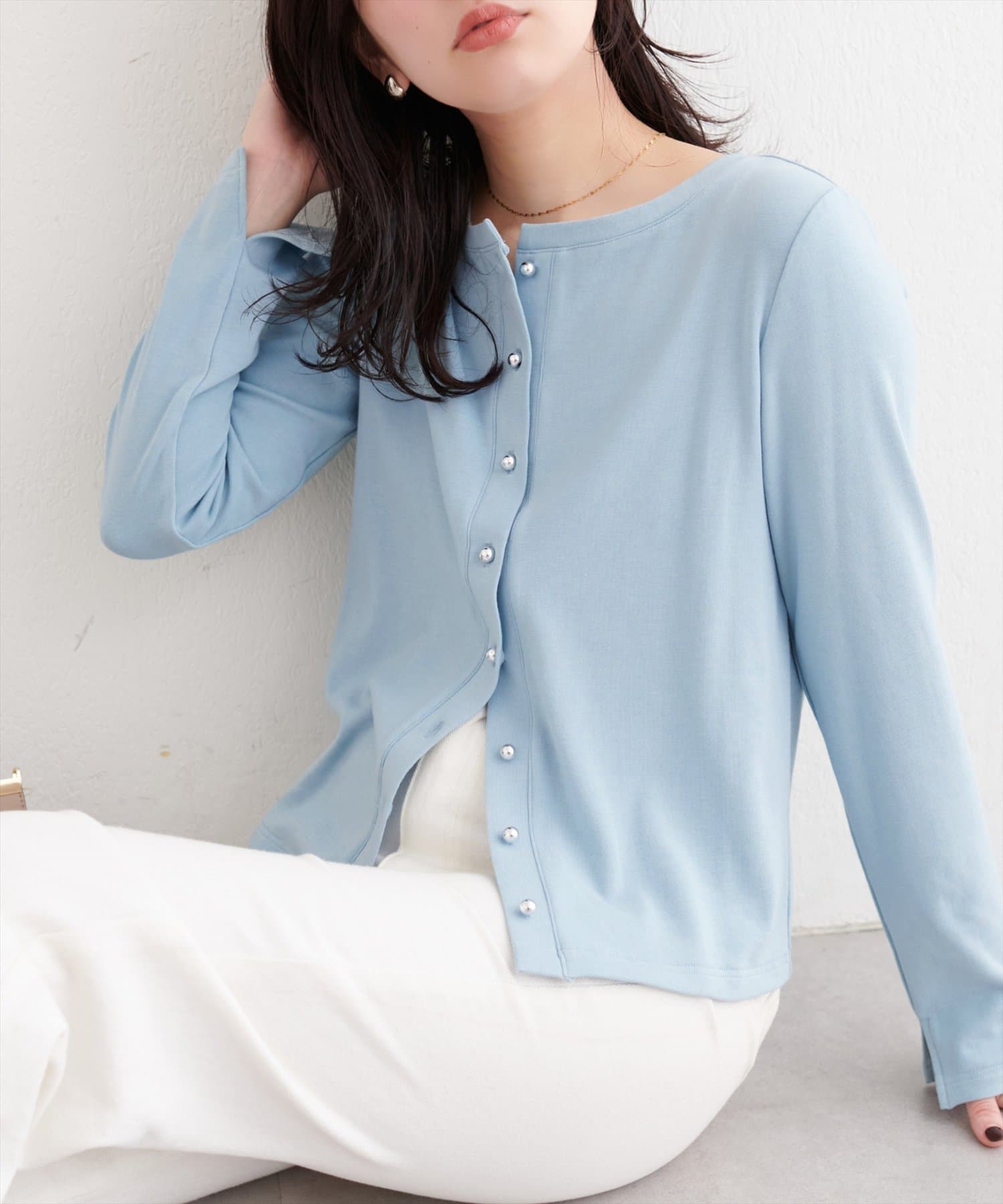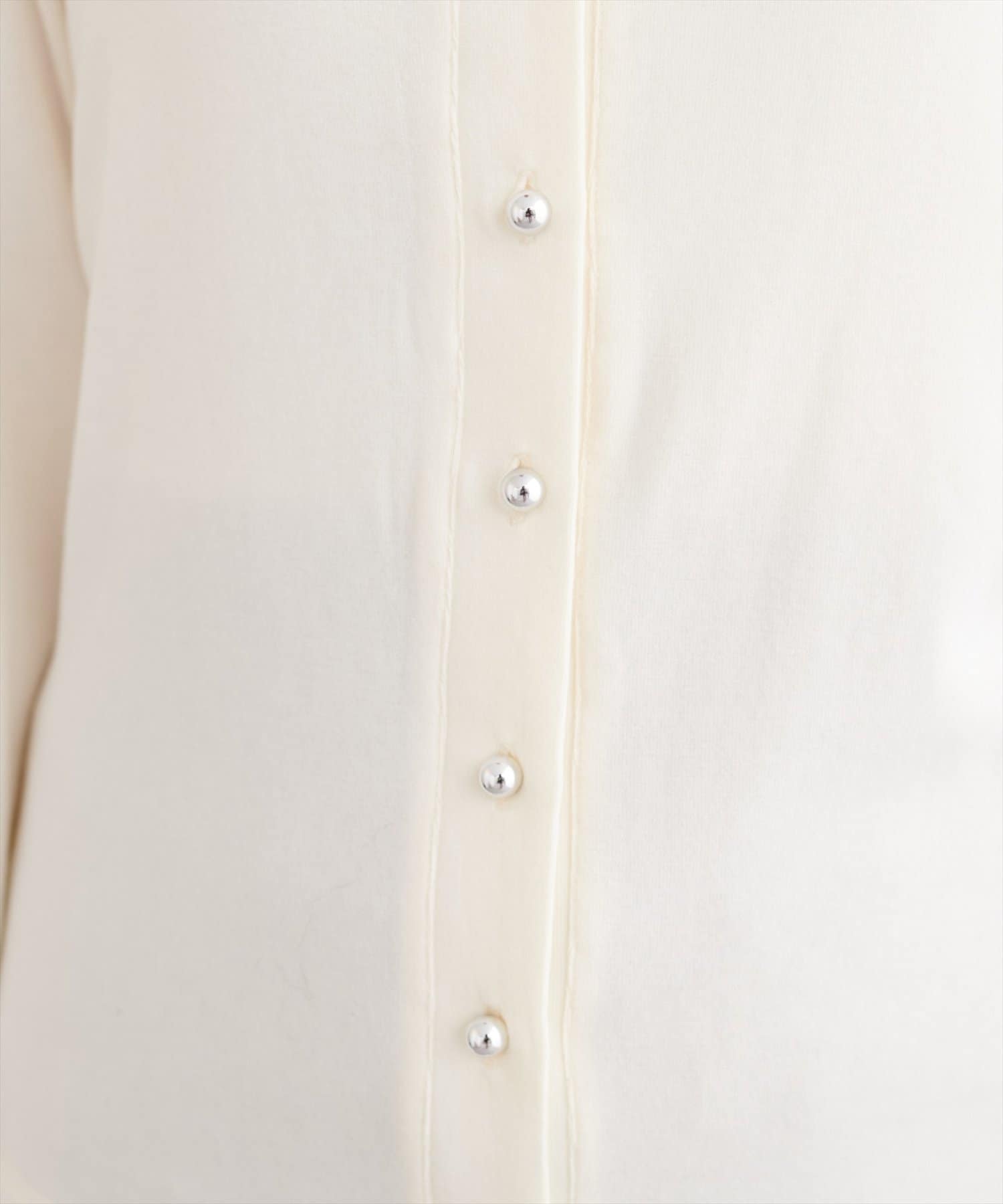 フロントに並んだシルバーボタンが、さりげないアクセントとなり、シンプルなデザインに華やかさを添えます。