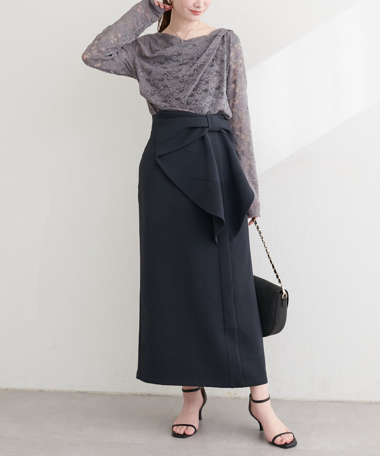 流れるようなドレープが、女性らしい柔らかなシルエットを演出。