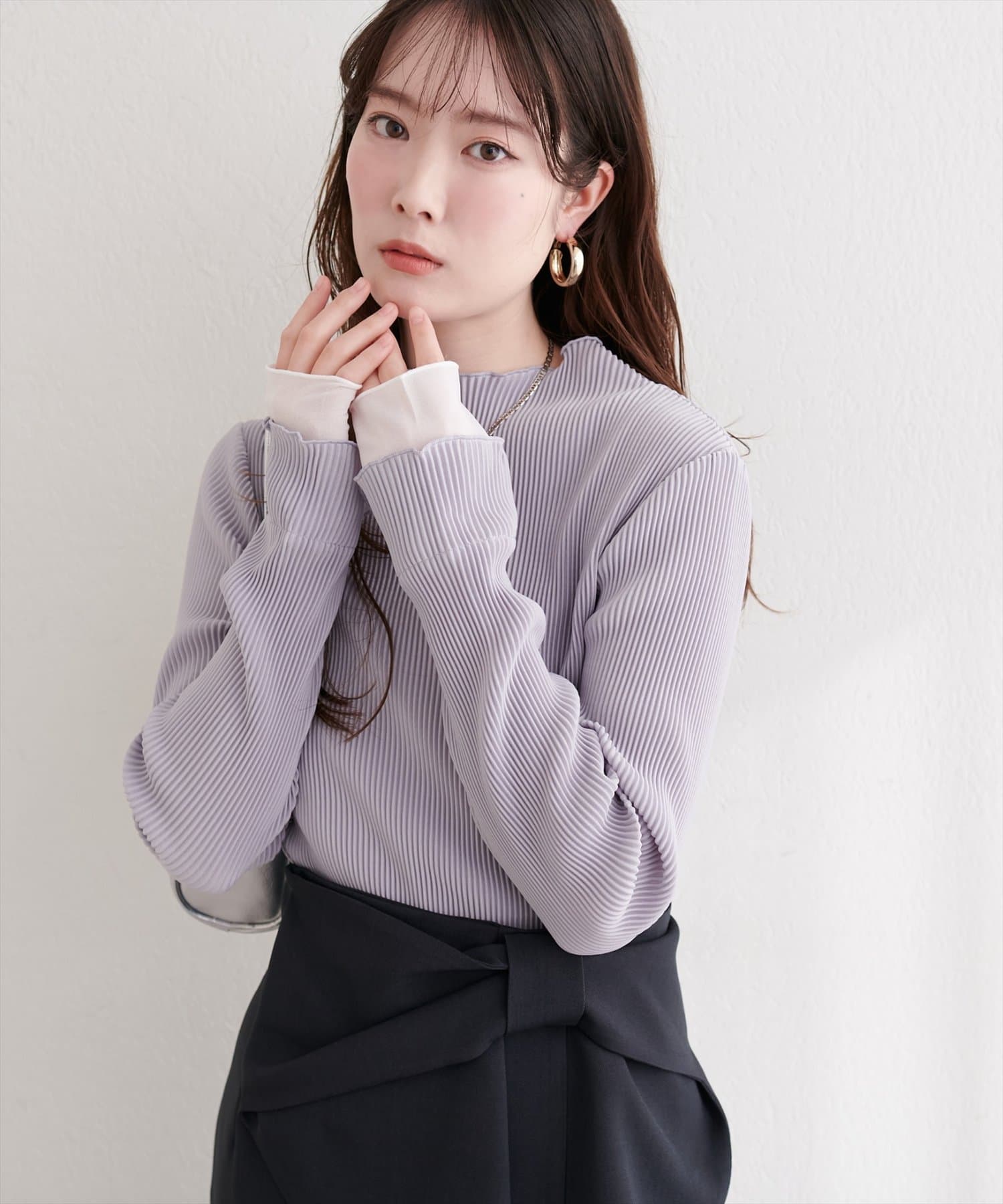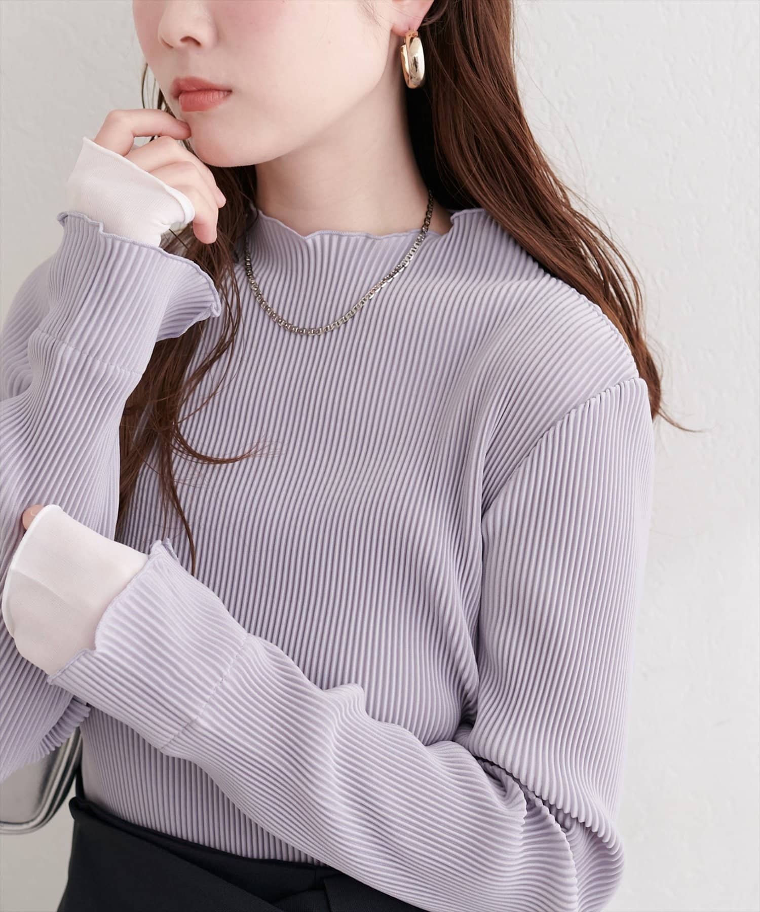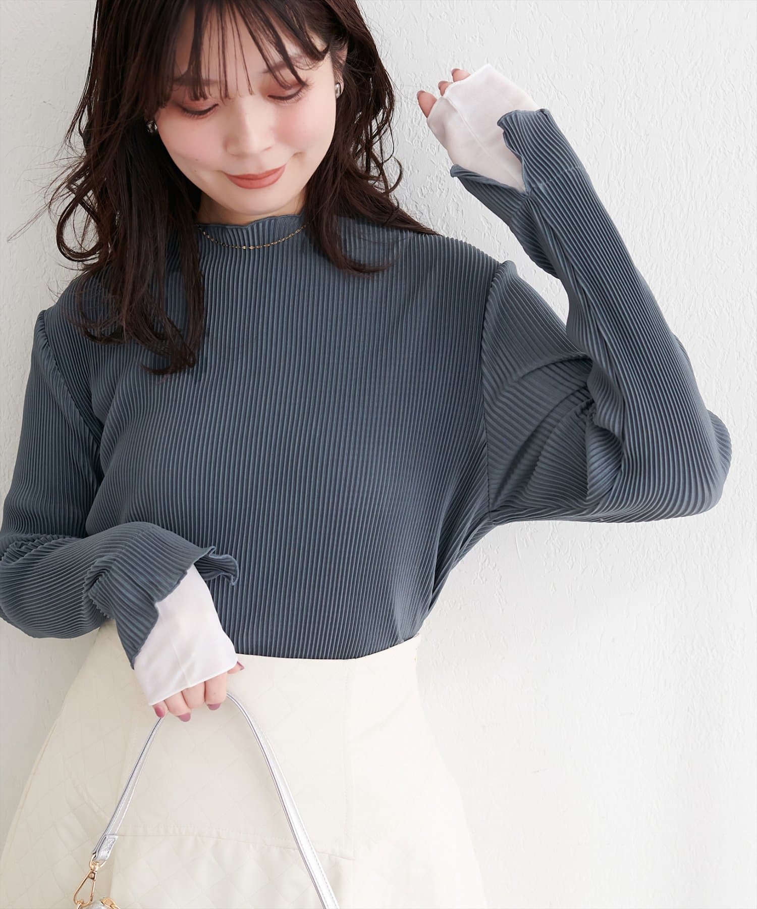 冬には、ニットやスウェットの下に重ね着して、袖口からシアープリーツを覗かせるのもおしゃれです。