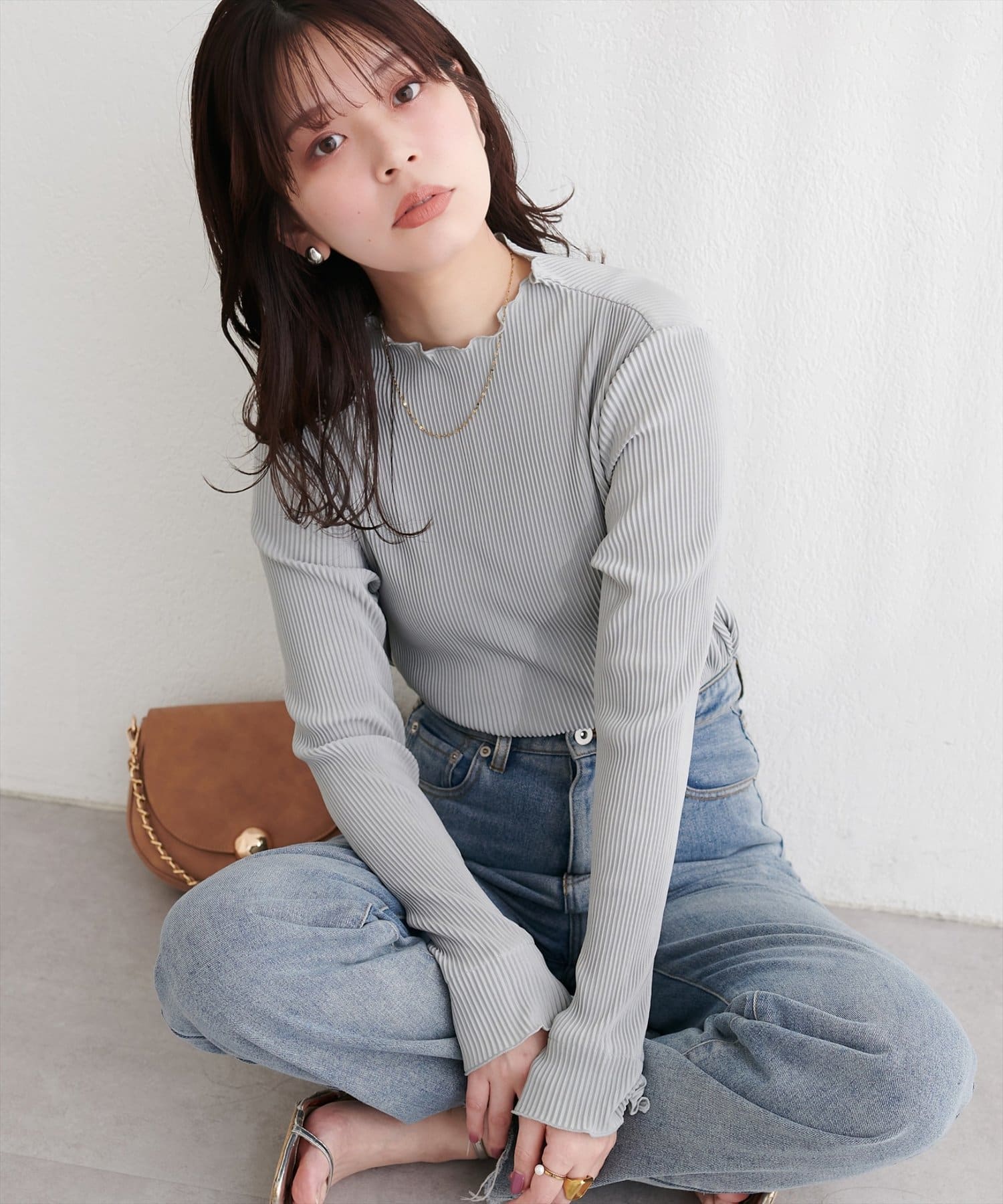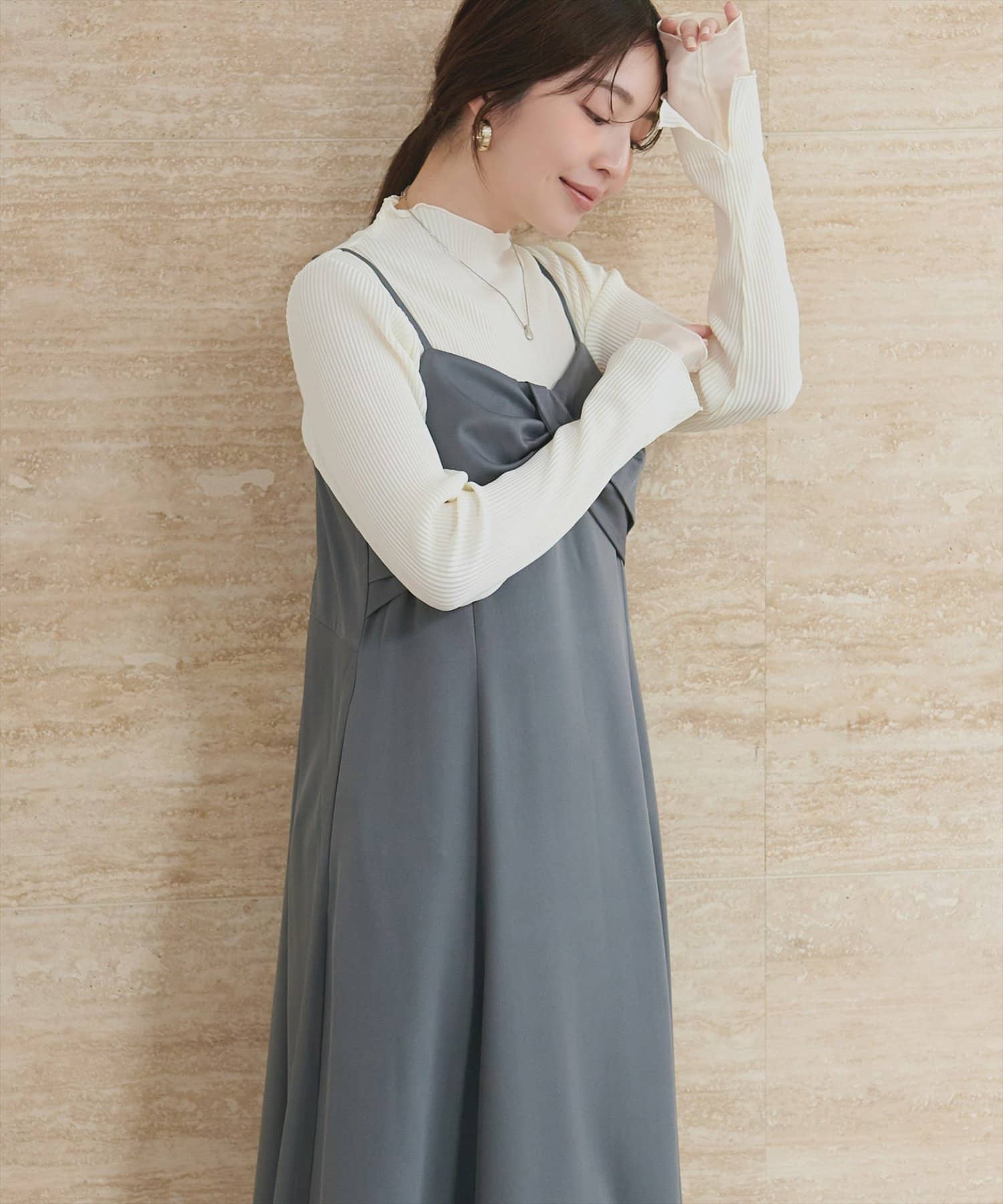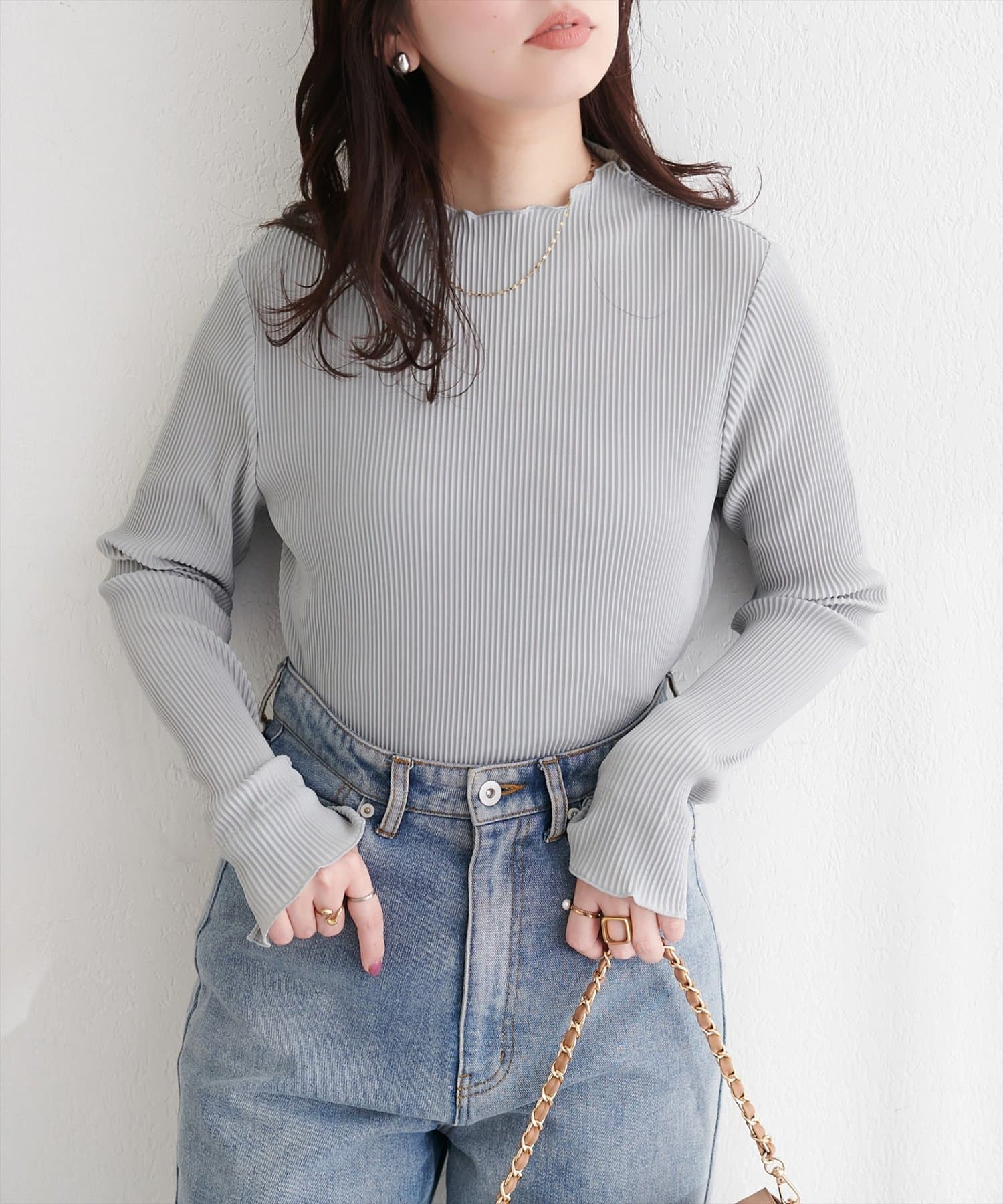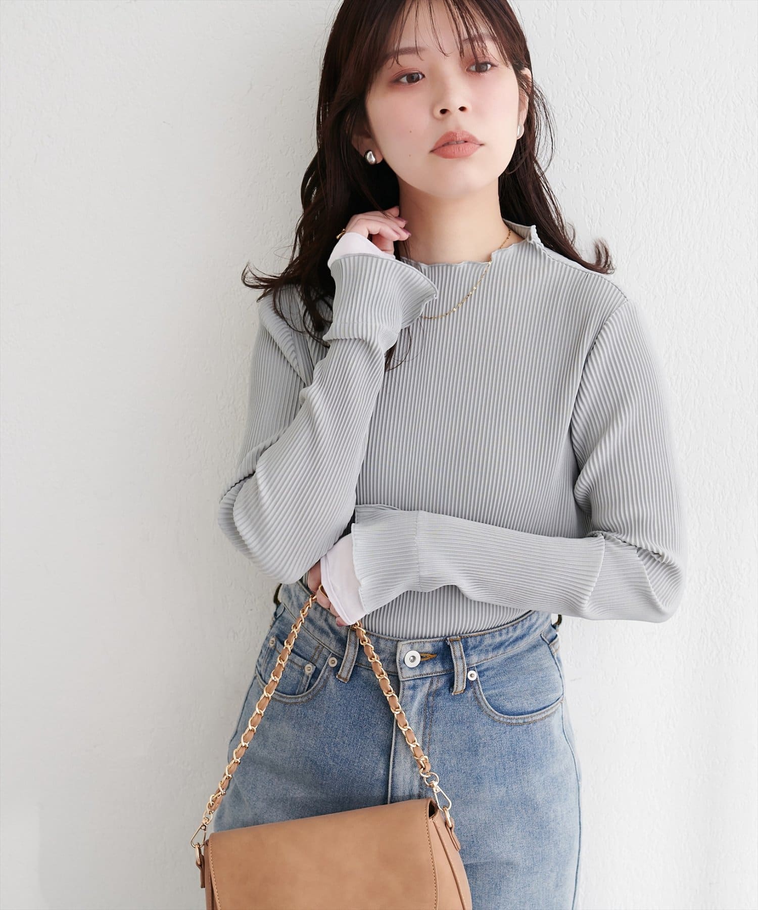 冬には、ニットやスウェットの下に重ね着して、袖口からシアープリーツを覗かせるのもおしゃれです。