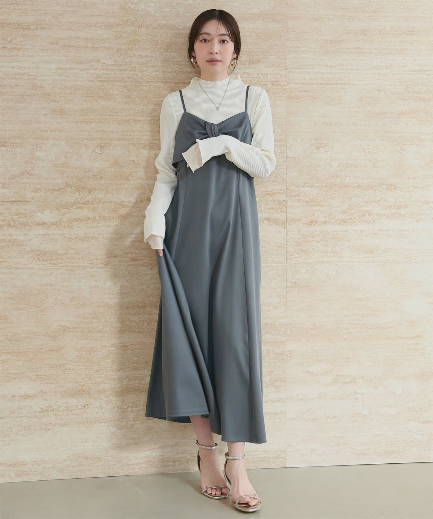 首元は、ほんのりフリルネックになっており、上品で女性らしい印象を与えます。