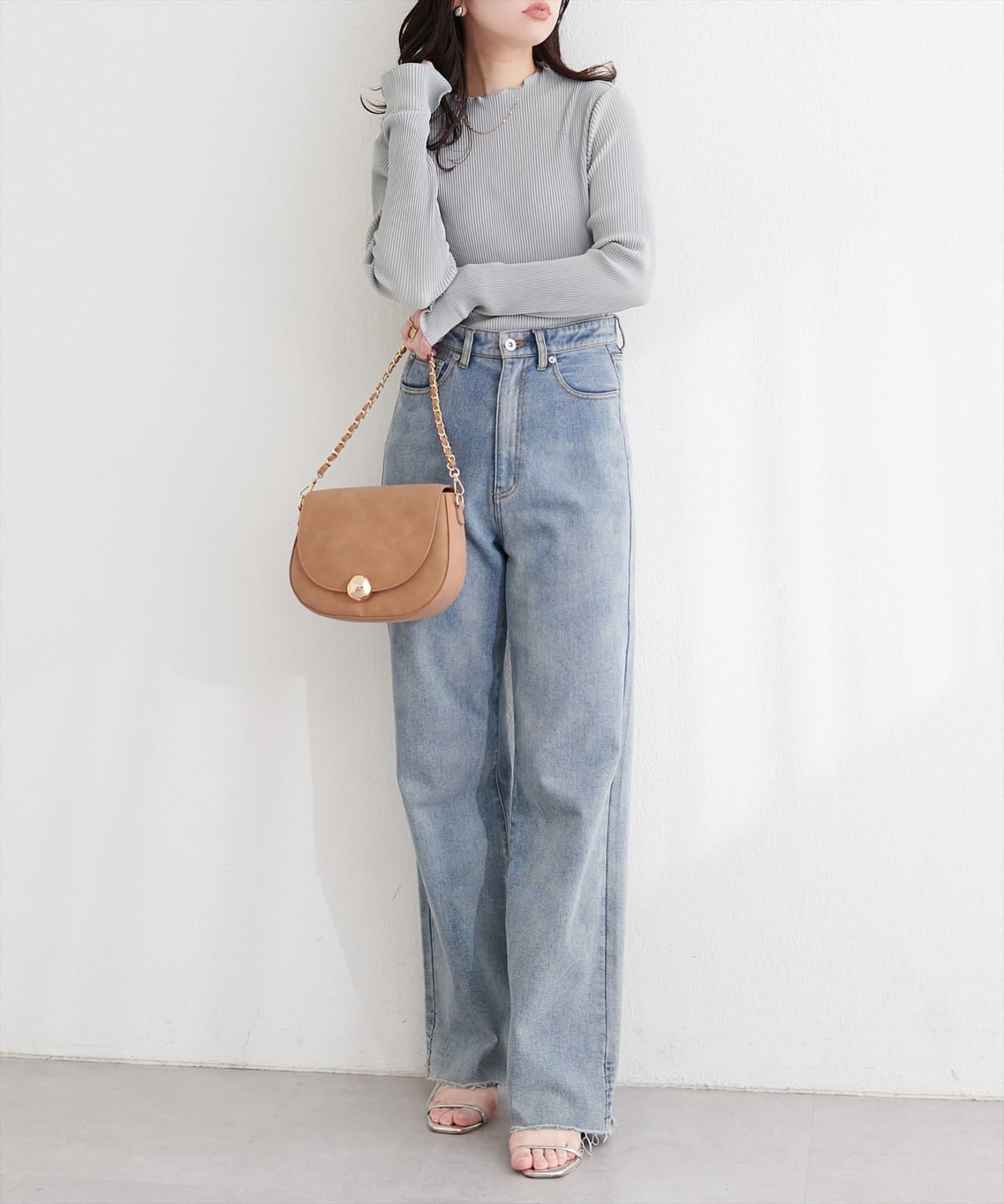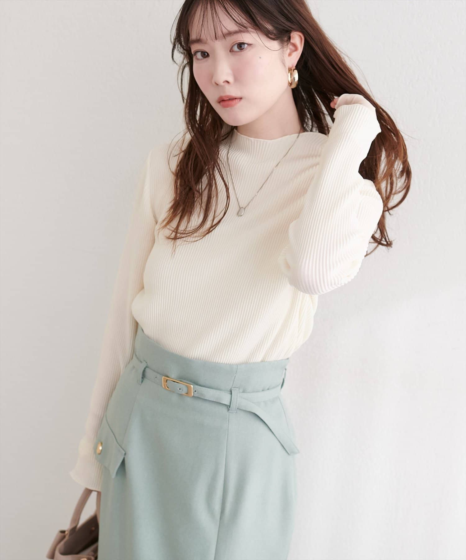ハイウエストのパンツやスカートにトップスをインして、スタイルアップ効果を狙うのがおすすめです。