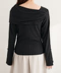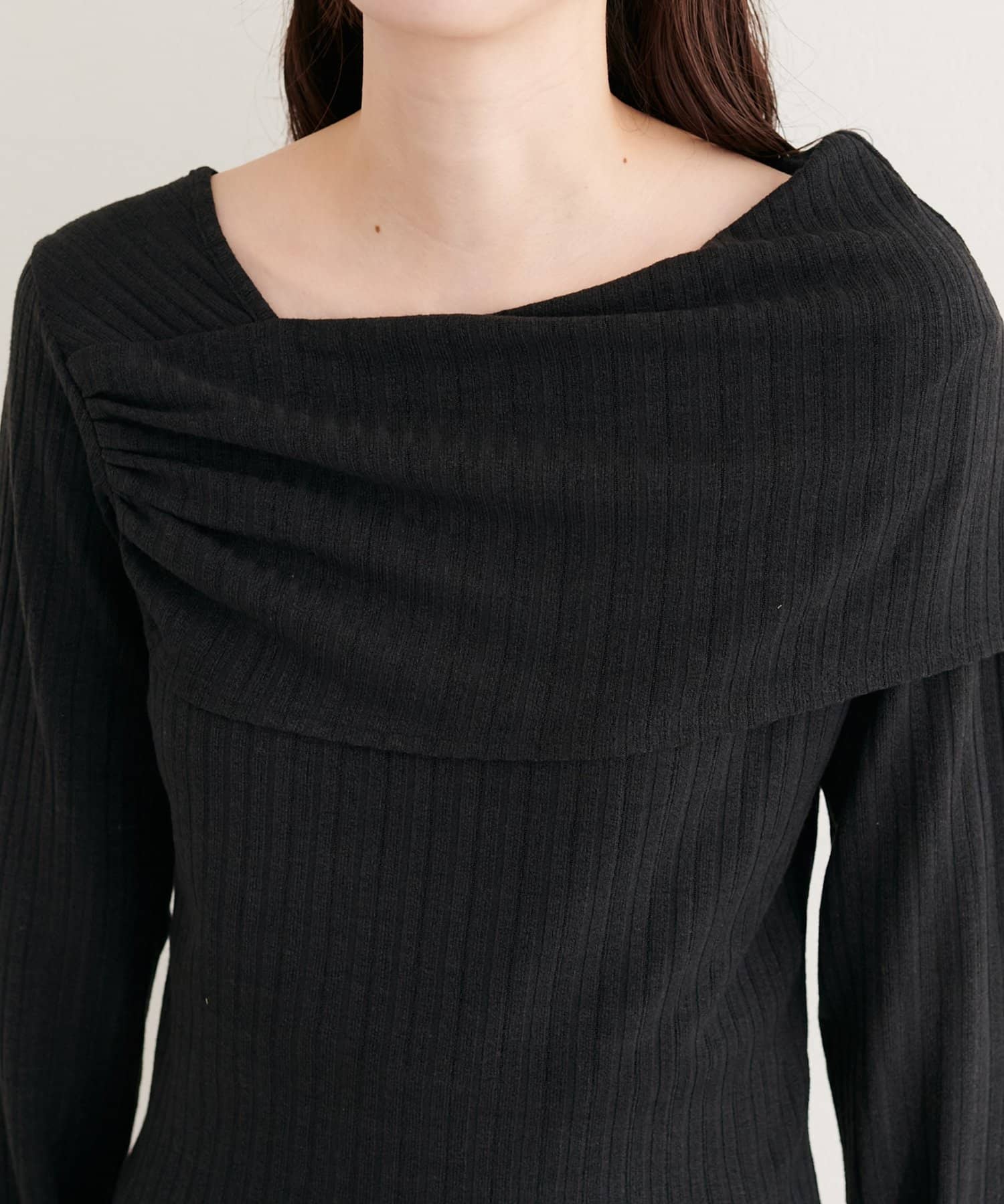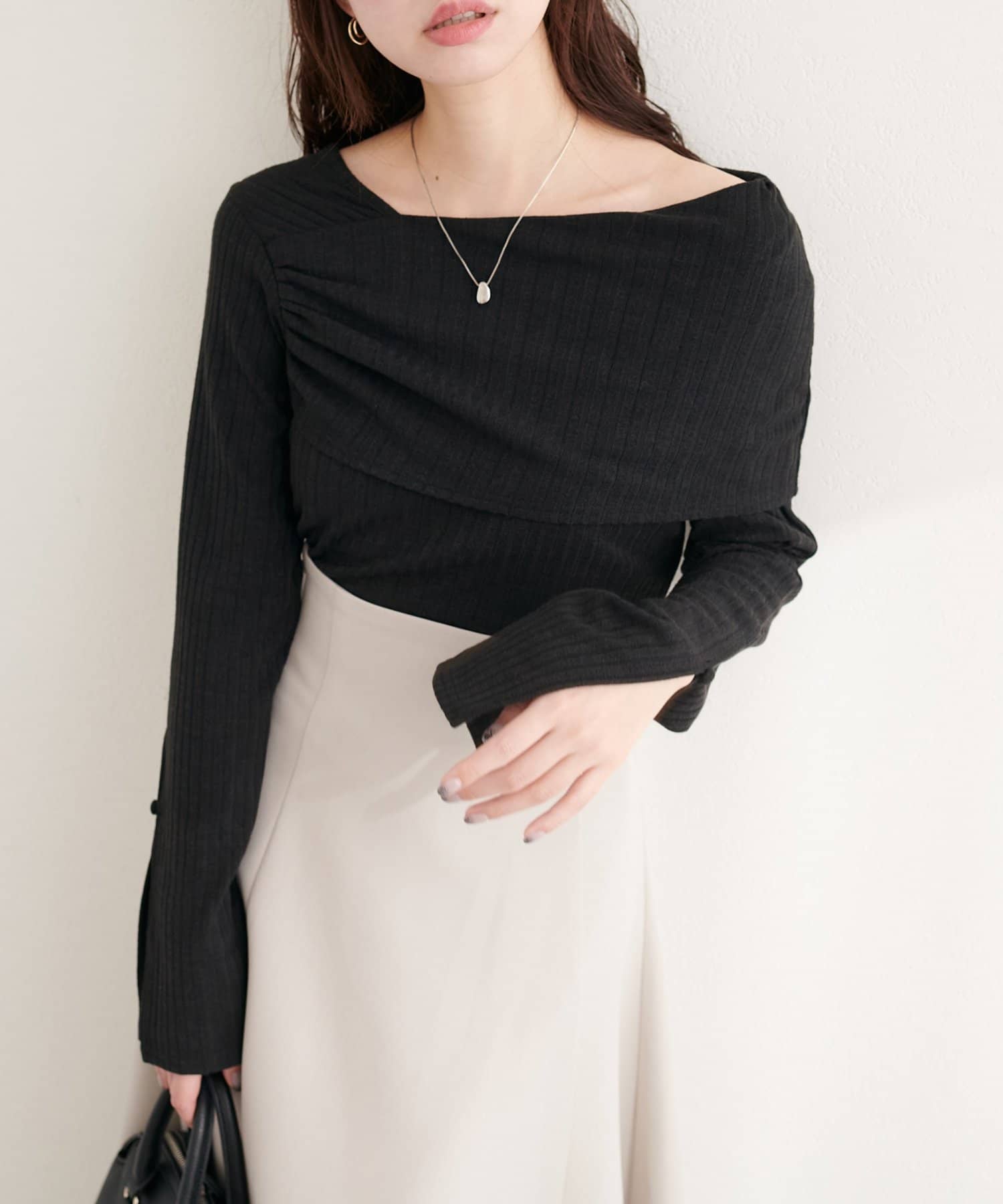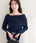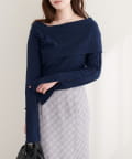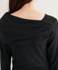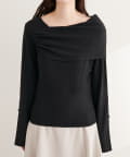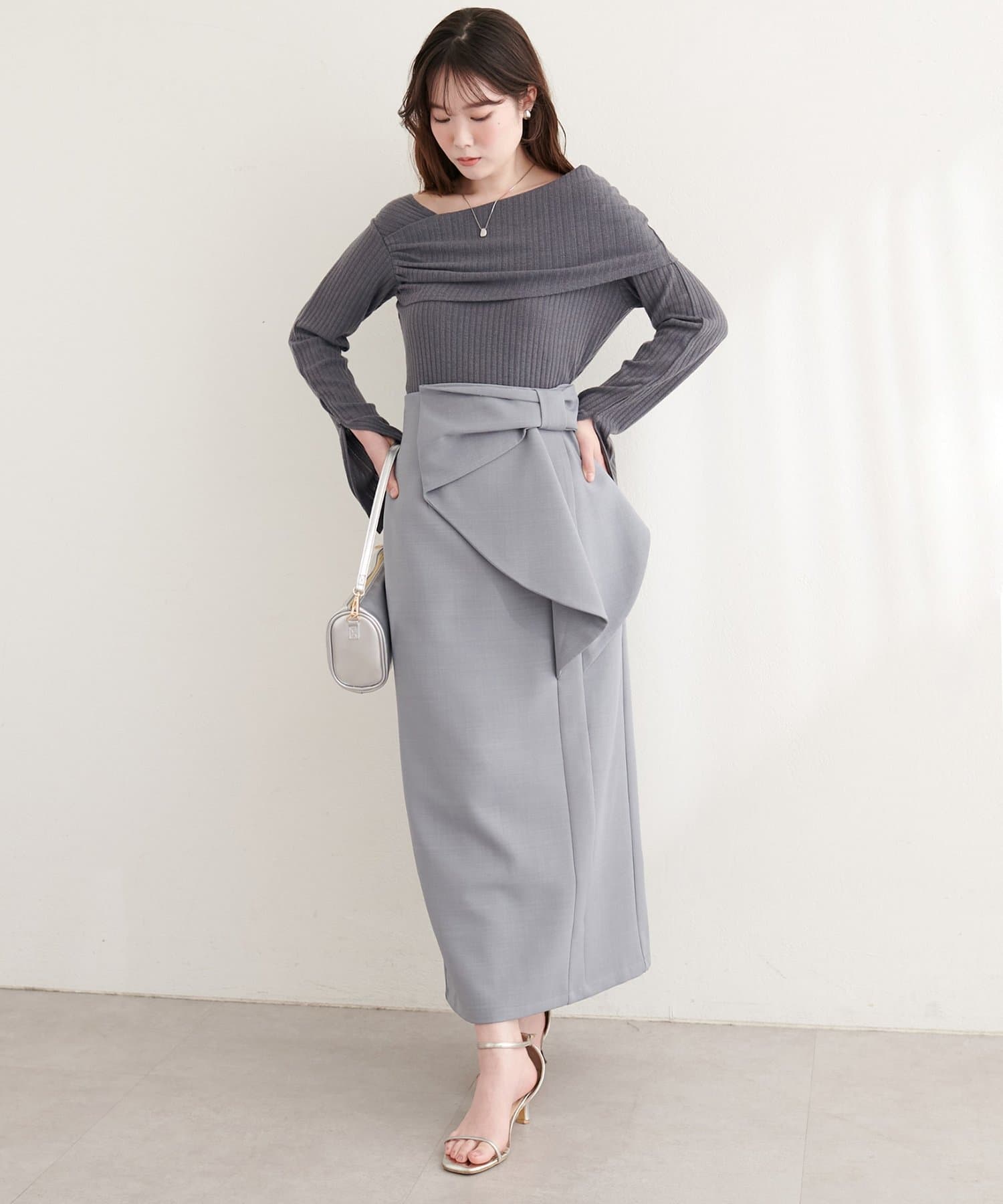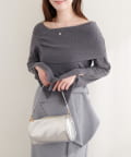 オフショルダー部分にはギャザーを施し、程よいボリューム感とニュアンスをプラス。
