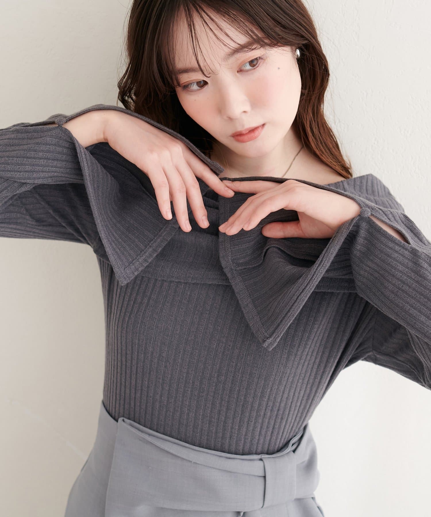 デコルテを美しく見せるオフショルダーデザインと、動きのあるフレア袖がポイントぼ一着。
