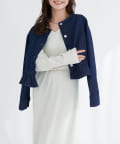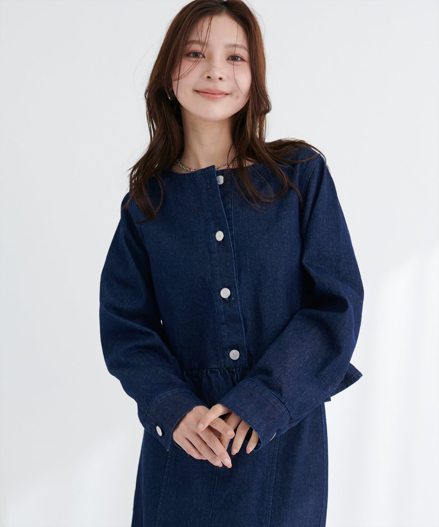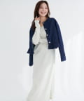 首元をすっきりと見せるノーカラーデザインは、インナーを選ばず、様々なスタイリングに合わせやすいのが魅力。