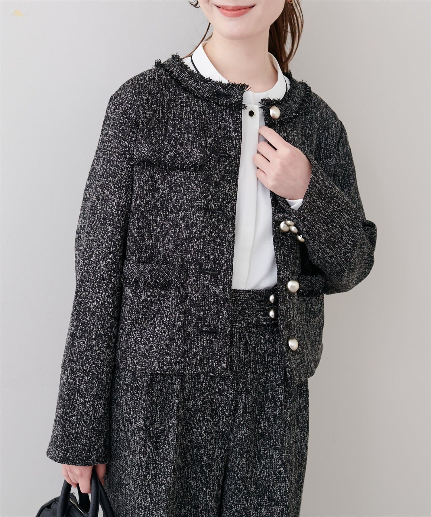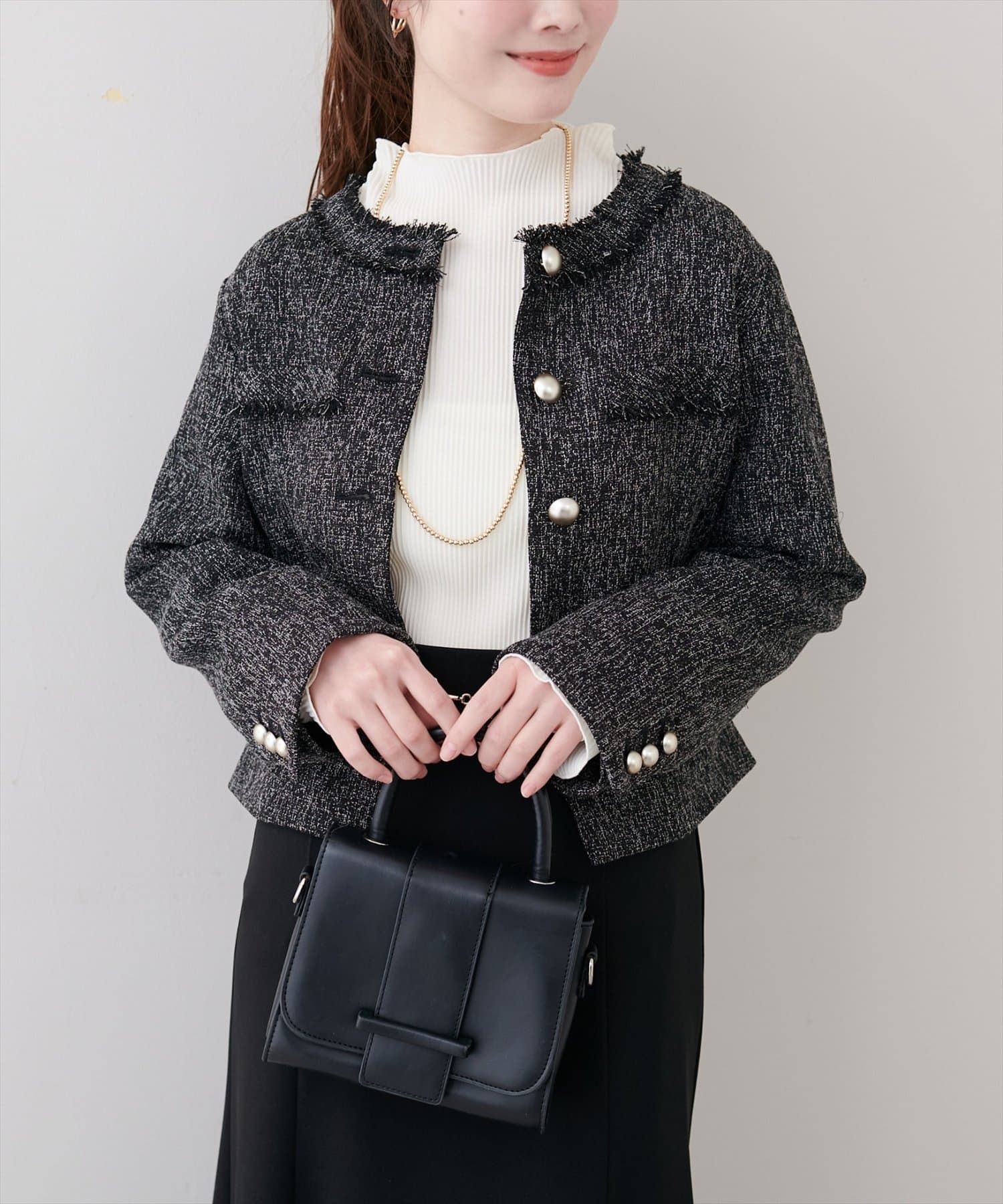 ジャケットと同系色のワンピースやスカートと合わせれば、統一感のある上品な着こなしに。