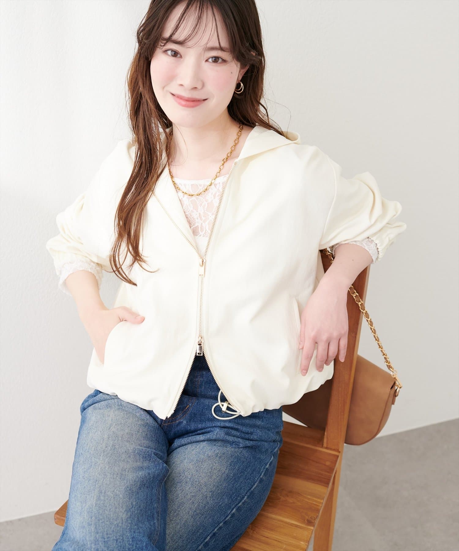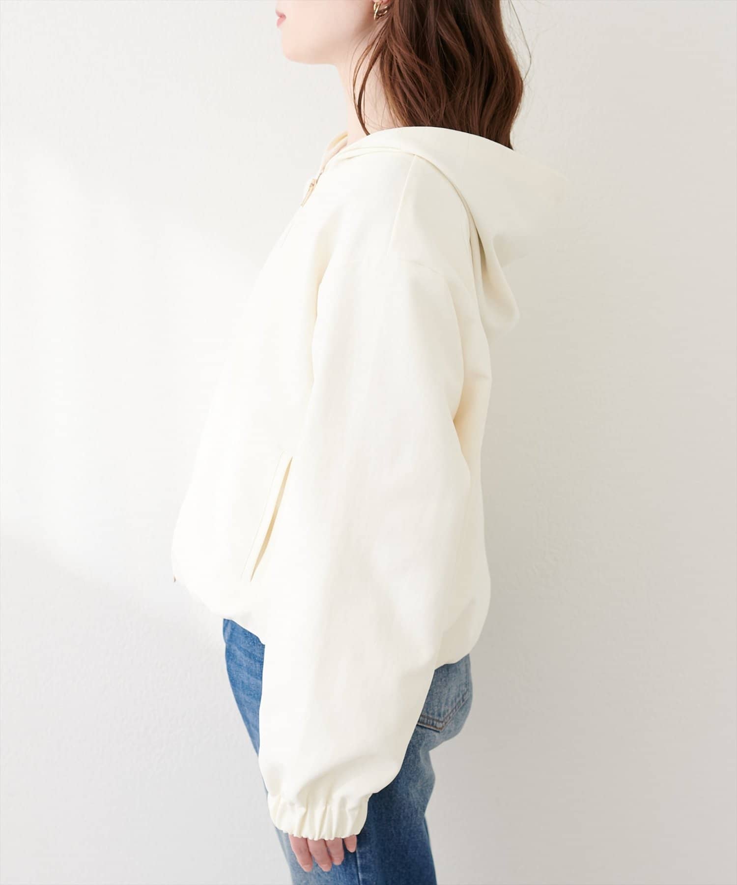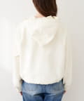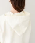 大きめフードがコーデのアクセントとなり、顔周りを明るくし、さりげない小顔効果にも◎